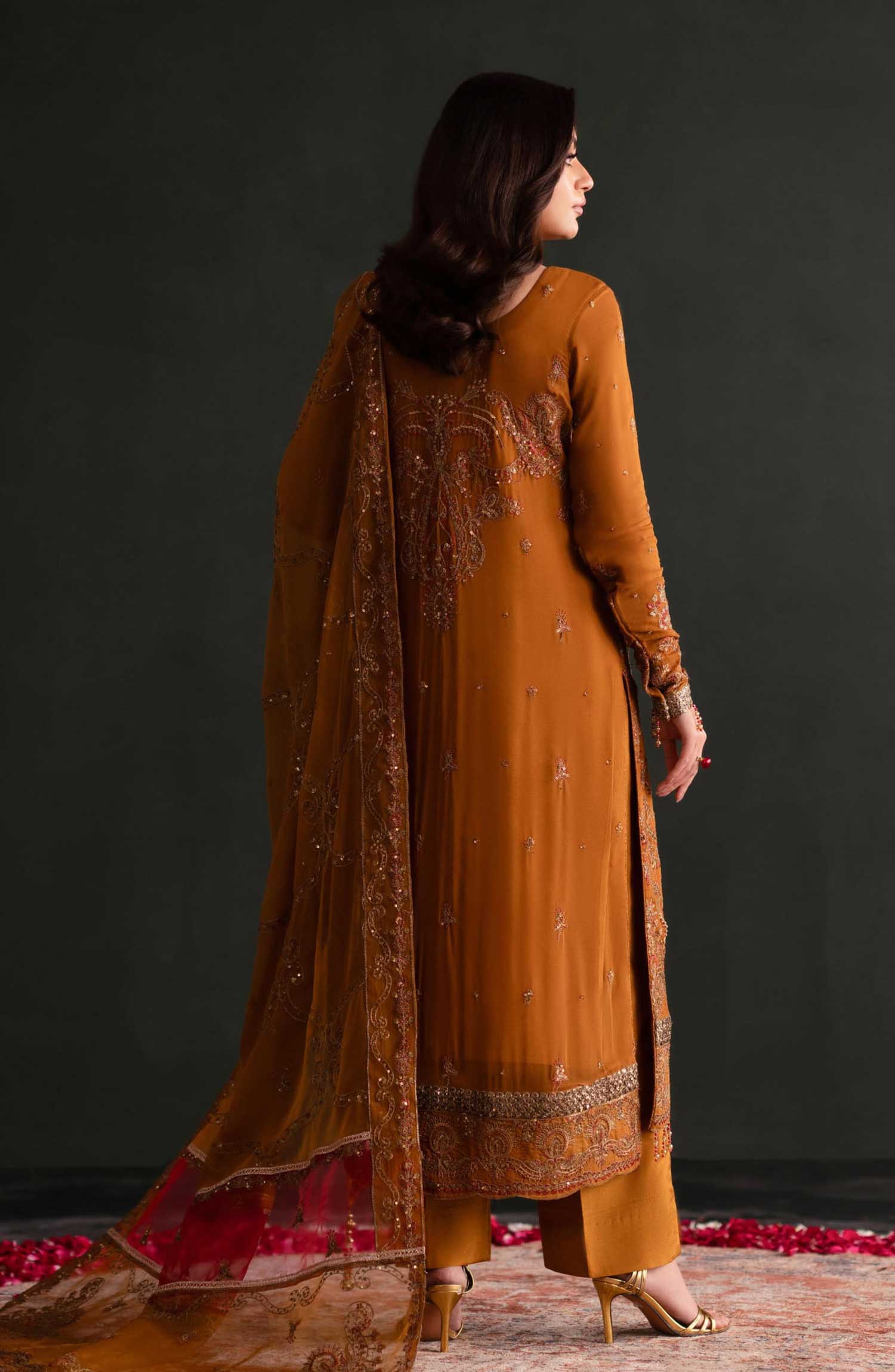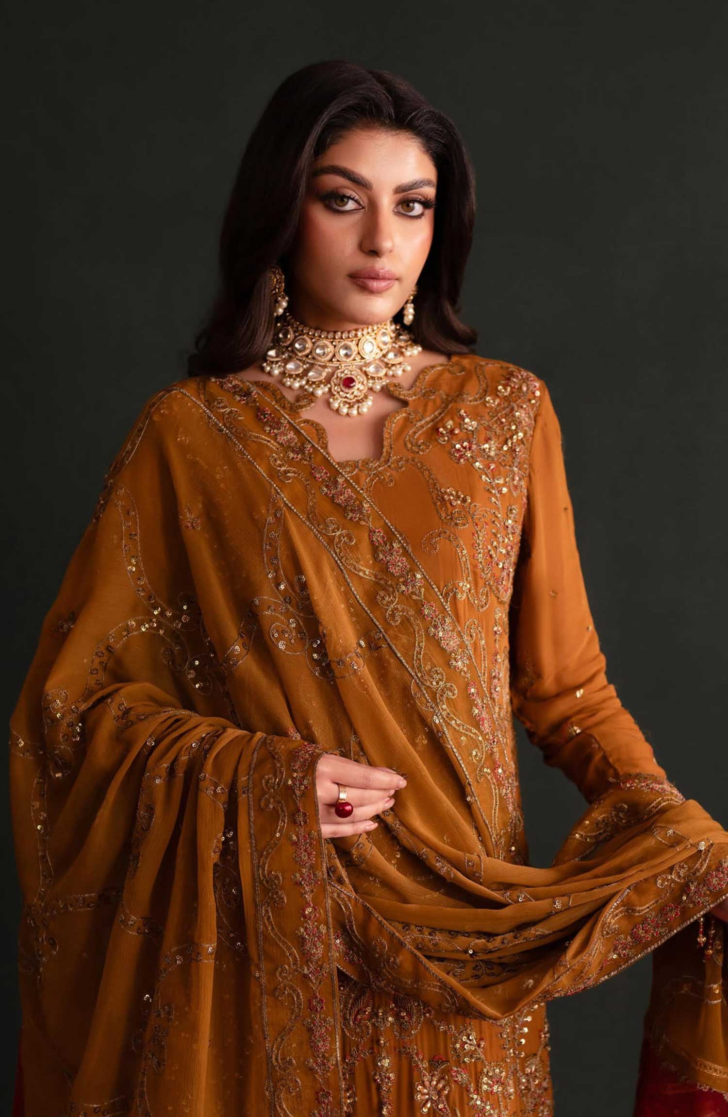 Emaan Adeel Nooresha Unstitched Formals 2025 has been styled in the image for photography and illustrative purposes.