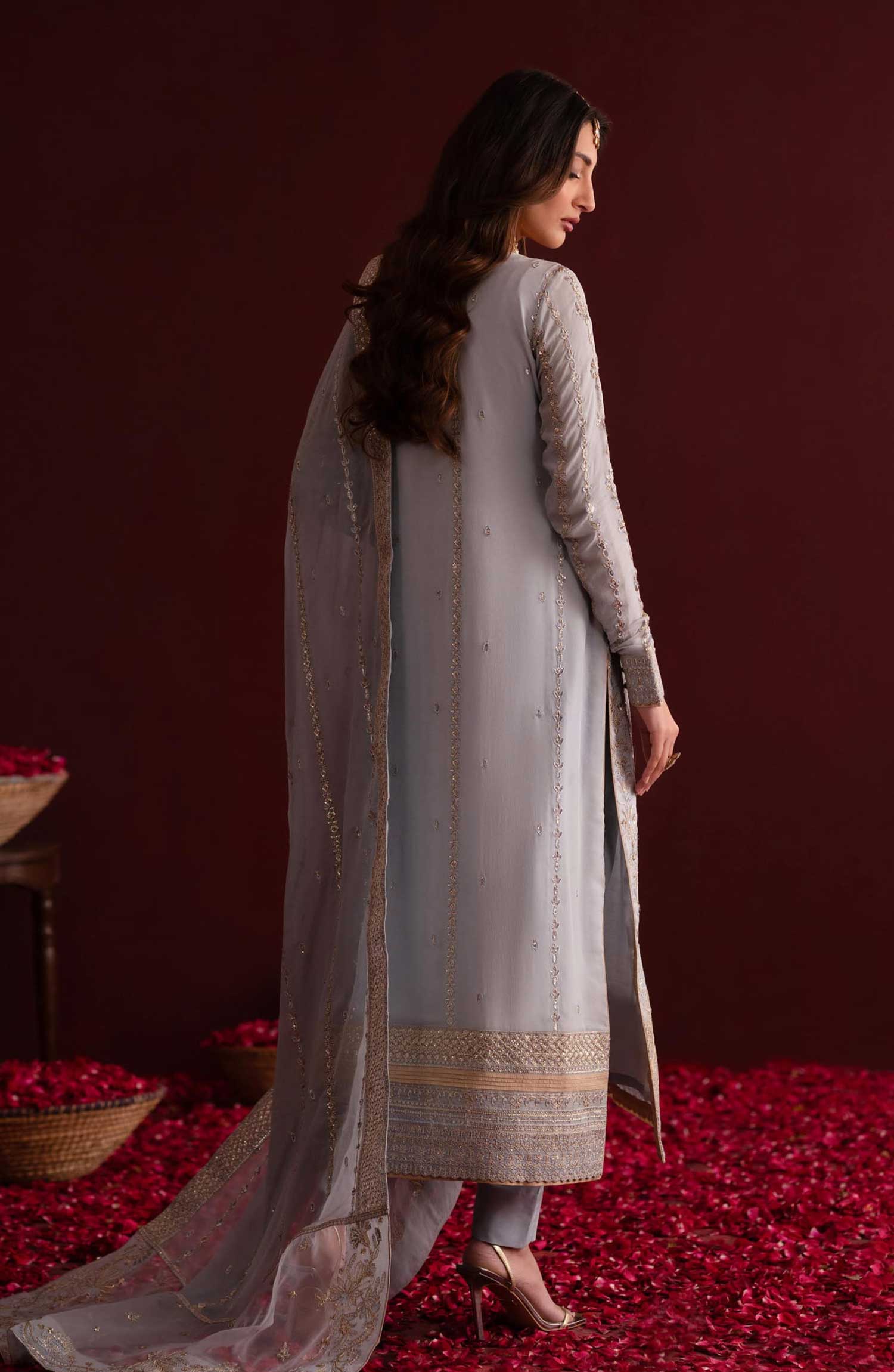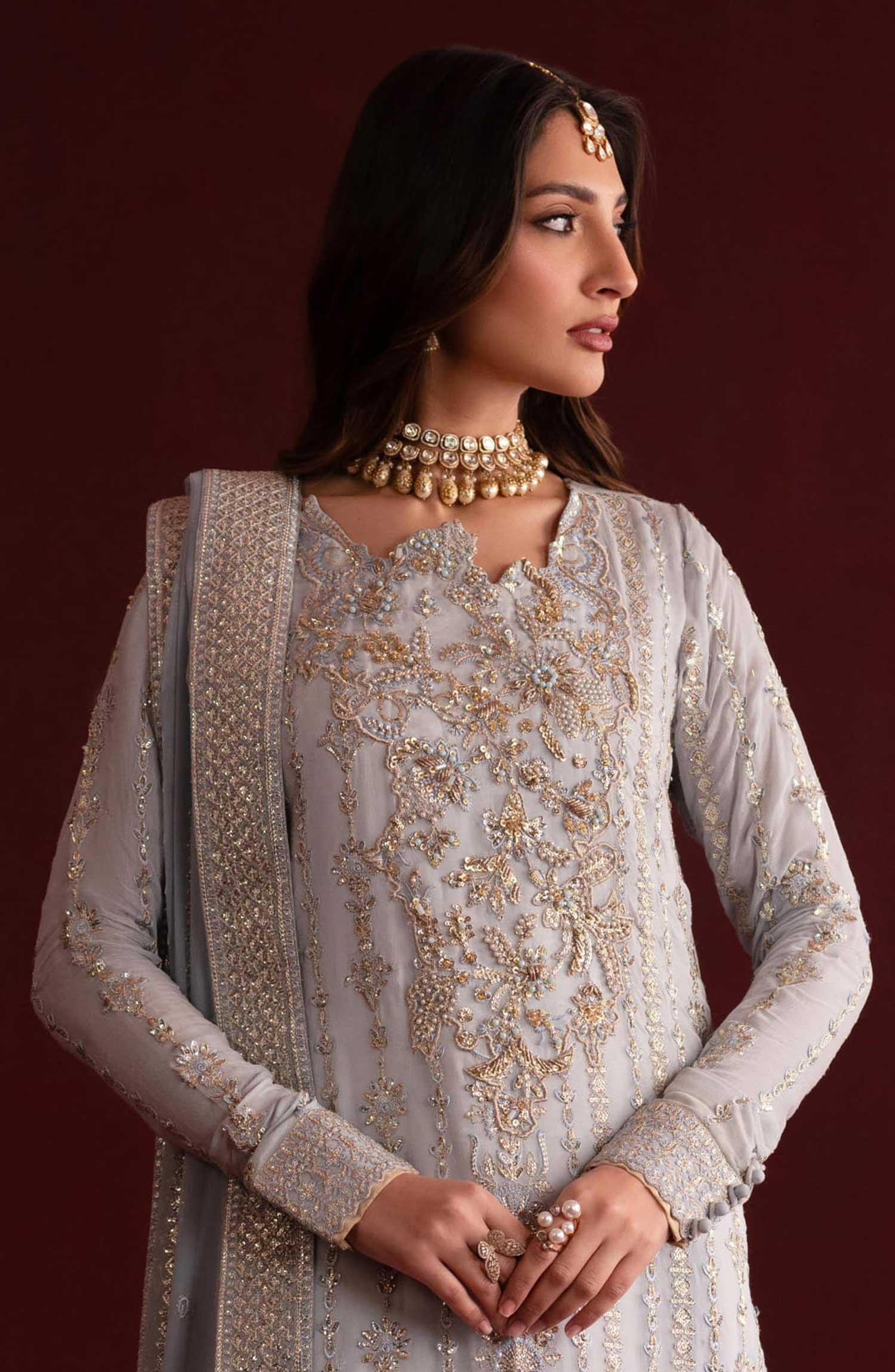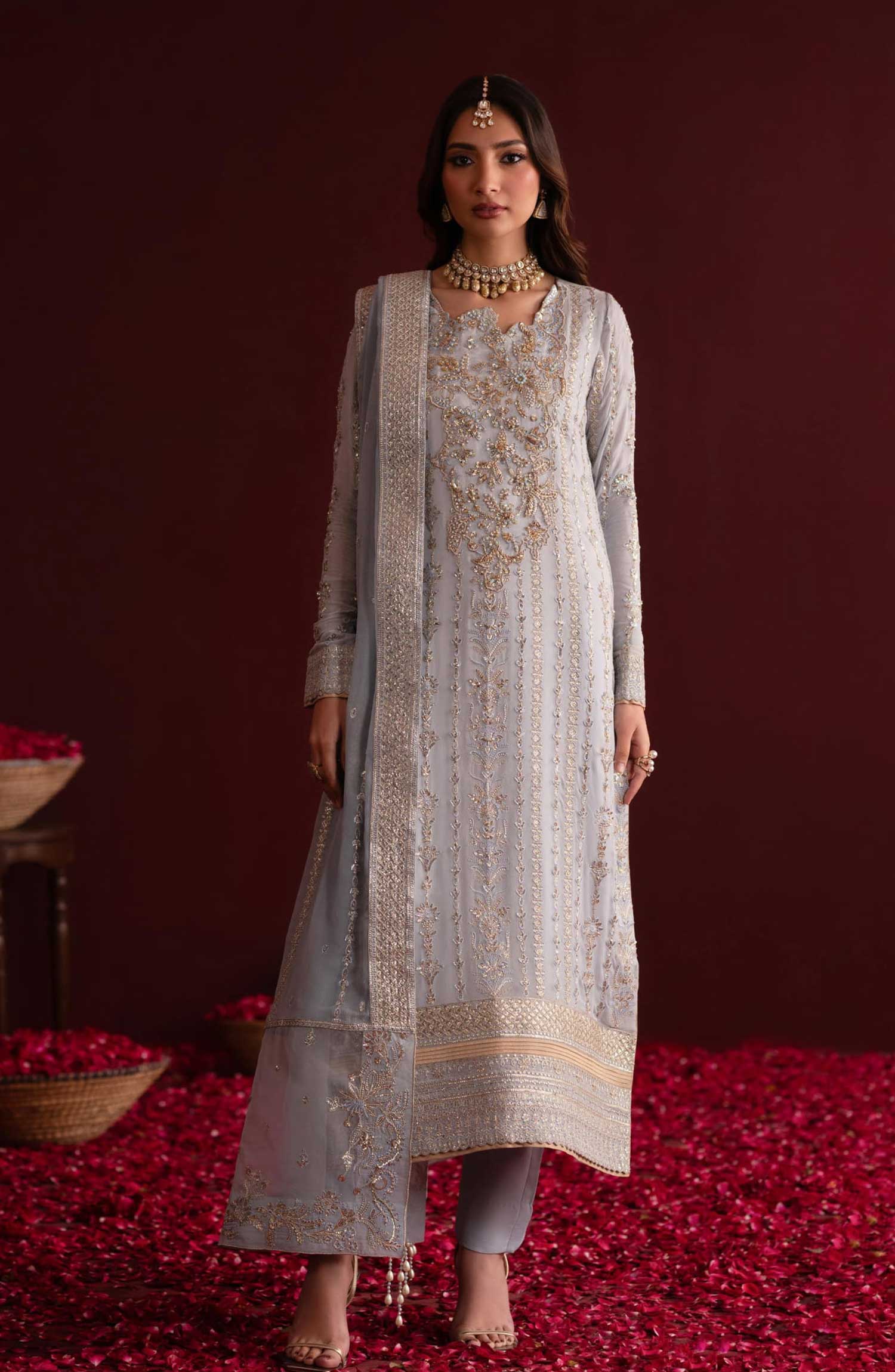 Emaan Adeel Nooresha Unstitched Formals 2025 has been styled in the image for photography and illustrative purposes.