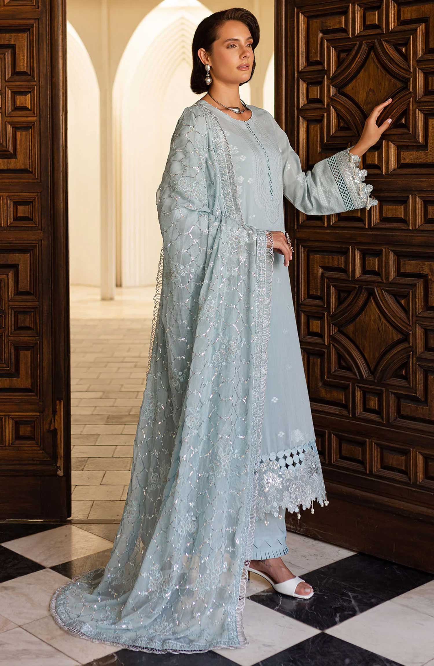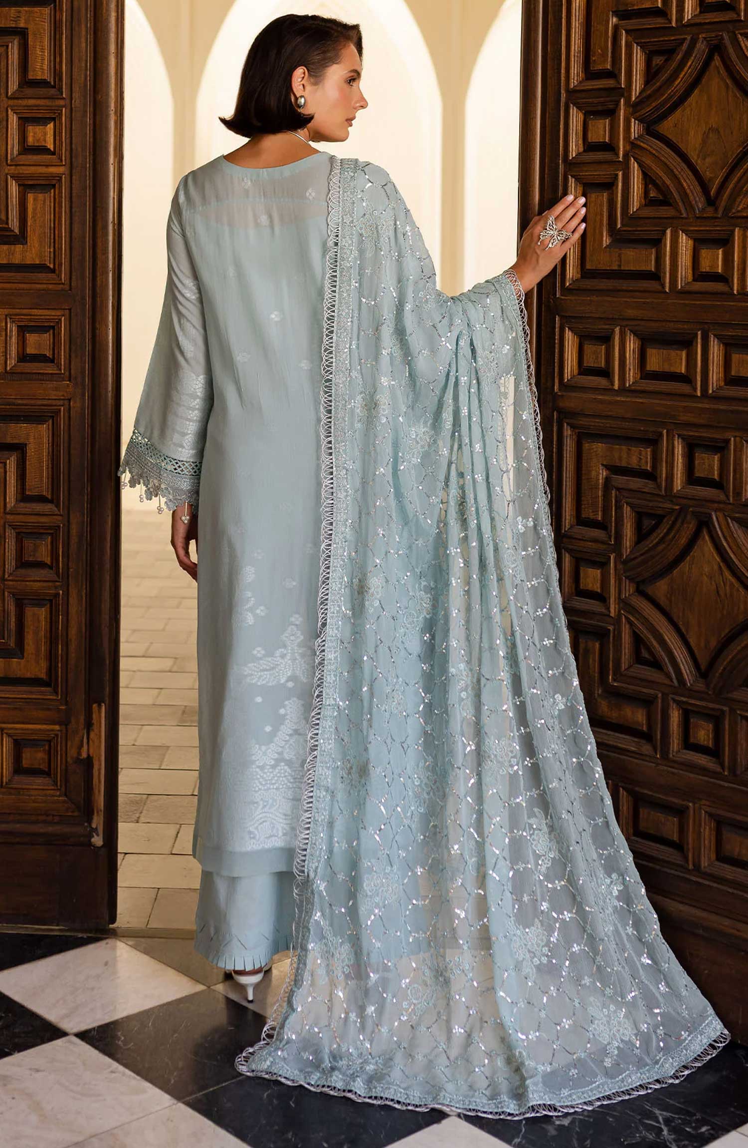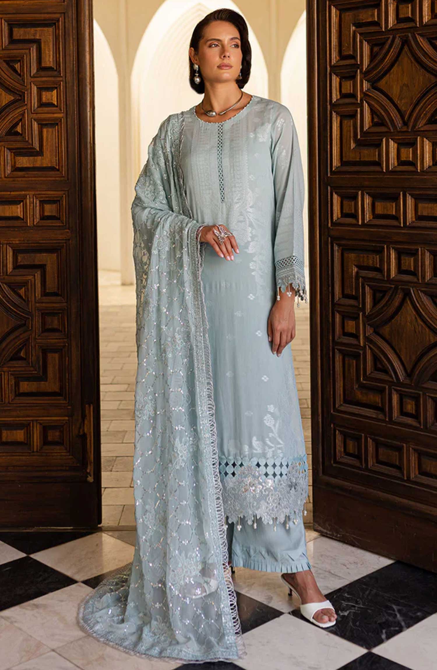 Lamisah by Lavish Premium Afsana Embroidered Chiffon Unstitched 3 Piece Suit - D-04 Mint Whisper - LP25AFS - Blue - Luxury Collection
