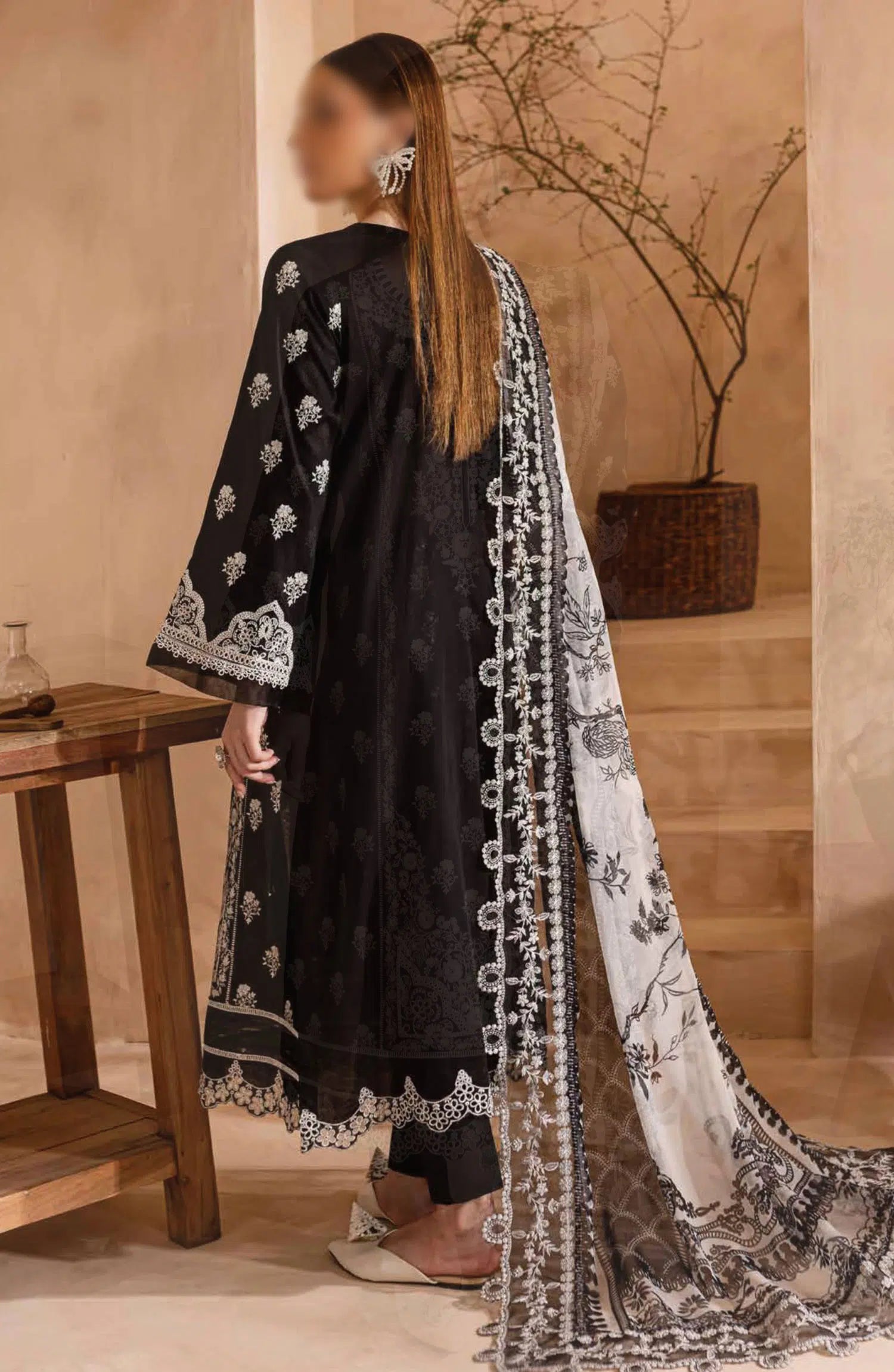Nureh Koyal Embroidered Unstitched Monochrome Collection has been styled in the image for photography and illustrative purposes.