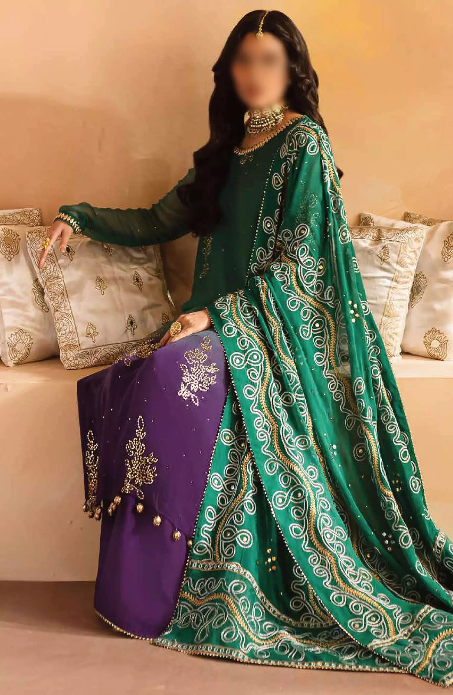 Nureh Mukeshkari Embroidered Mukesh Chiffon Collection has been styled in the image for photography and illustrative purposes.