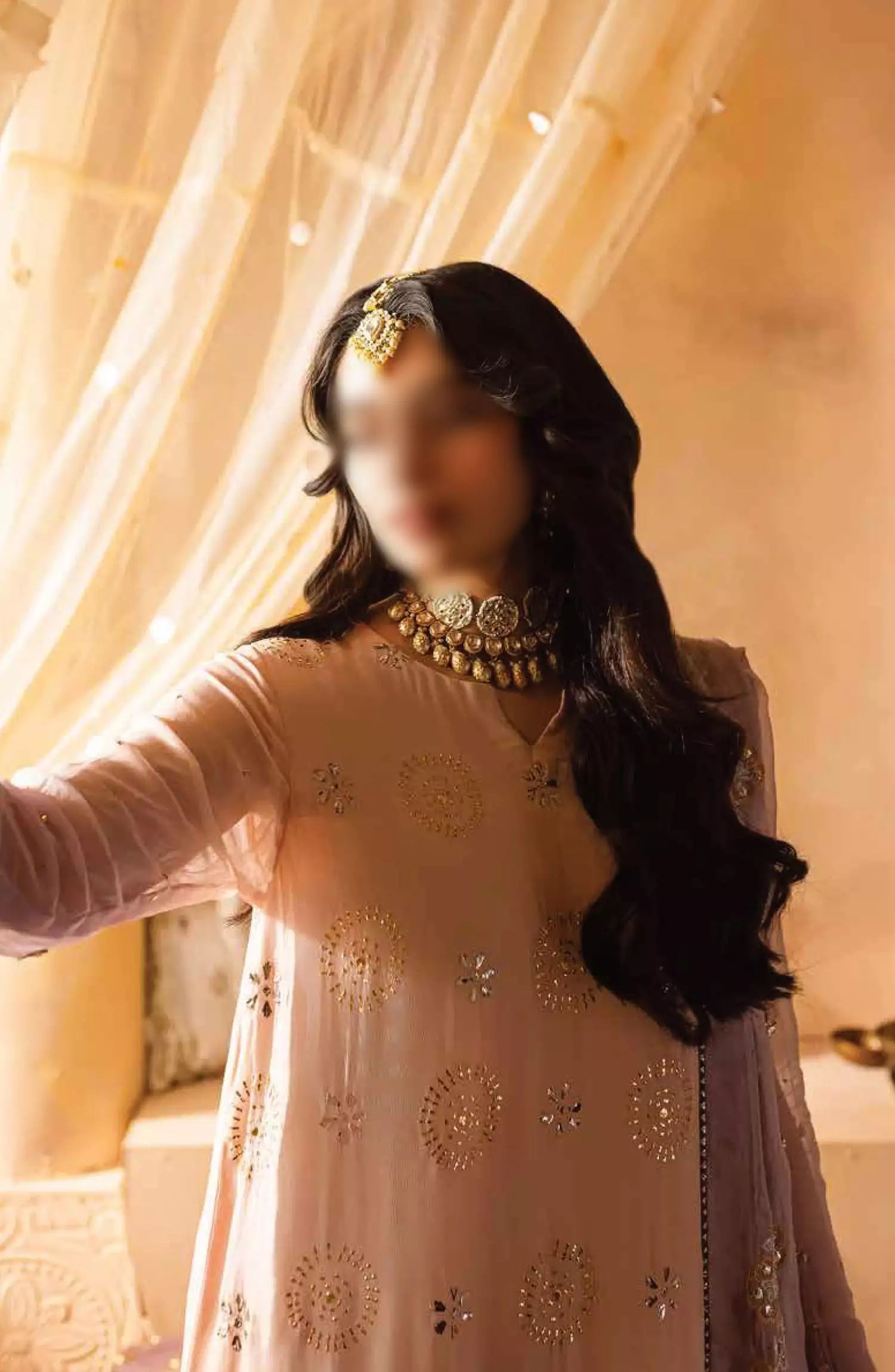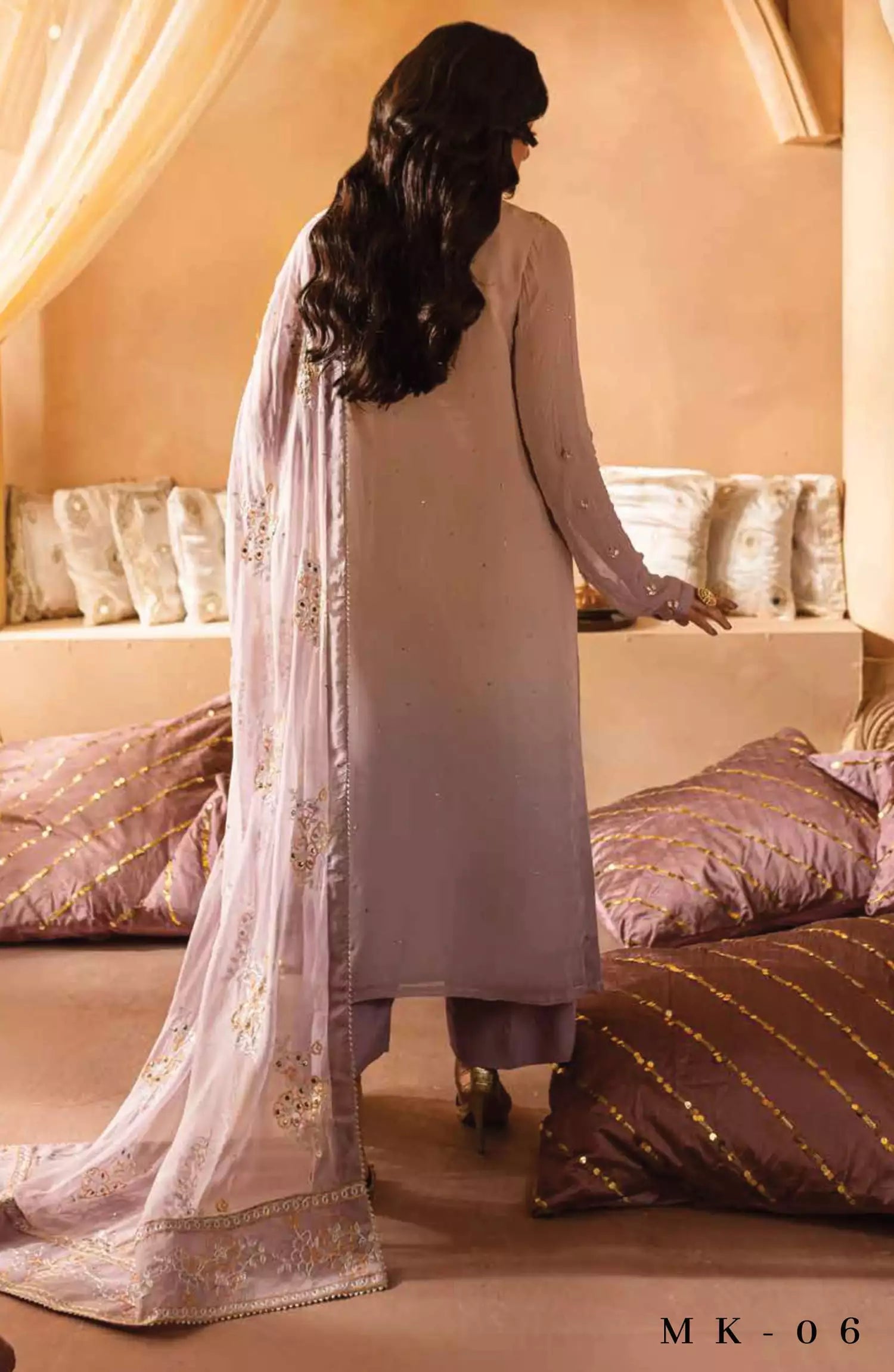 Nureh Mukeshkari Embroidered Mukesh Chiffon Collection has been styled in the image for photography and illustrative purposes.