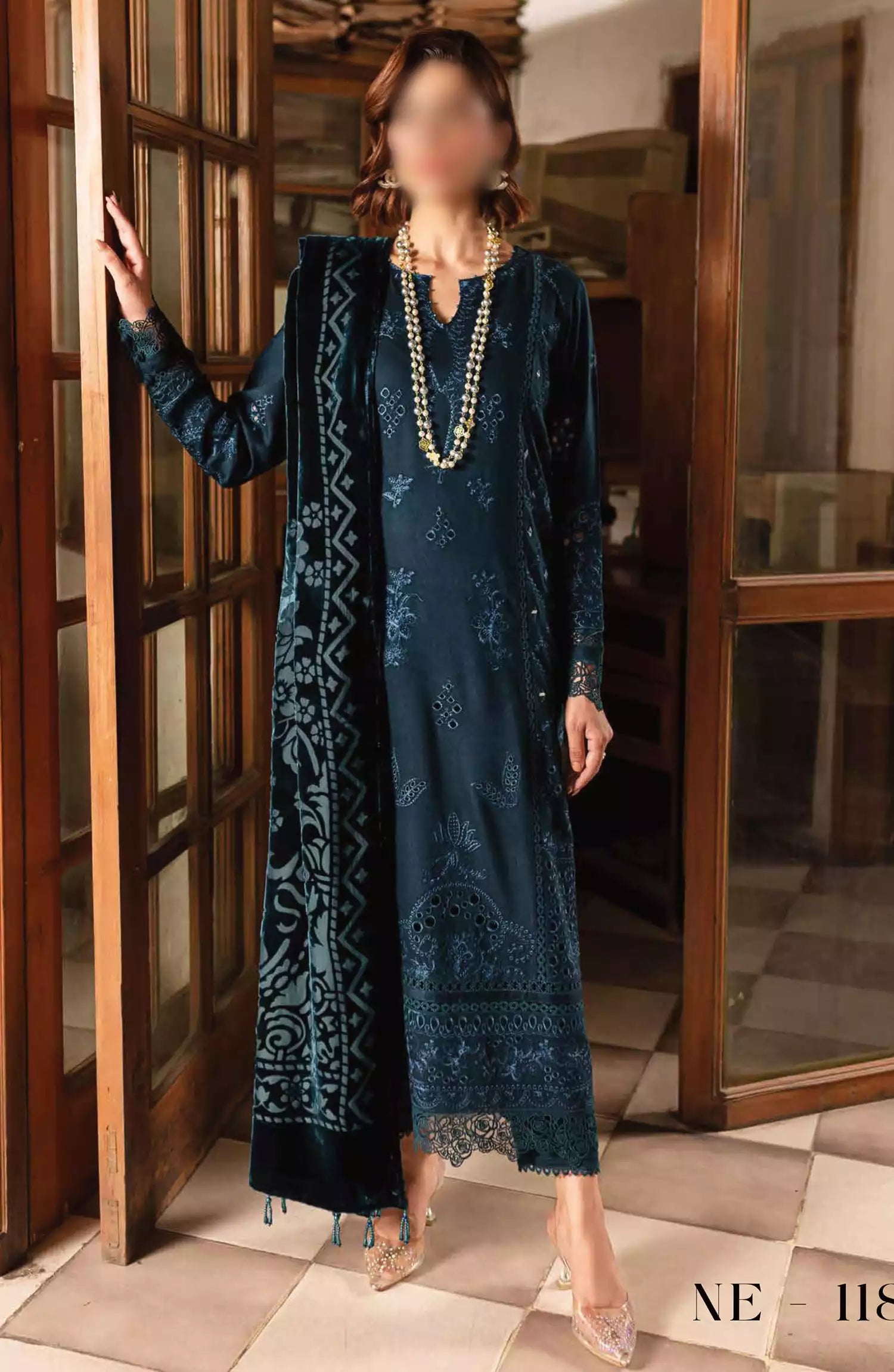 Nureh Unstitched Embroidered Leather Peach Collection with Velvet Palachi Shawl has been styled in the image for photography and illustrative purposes.