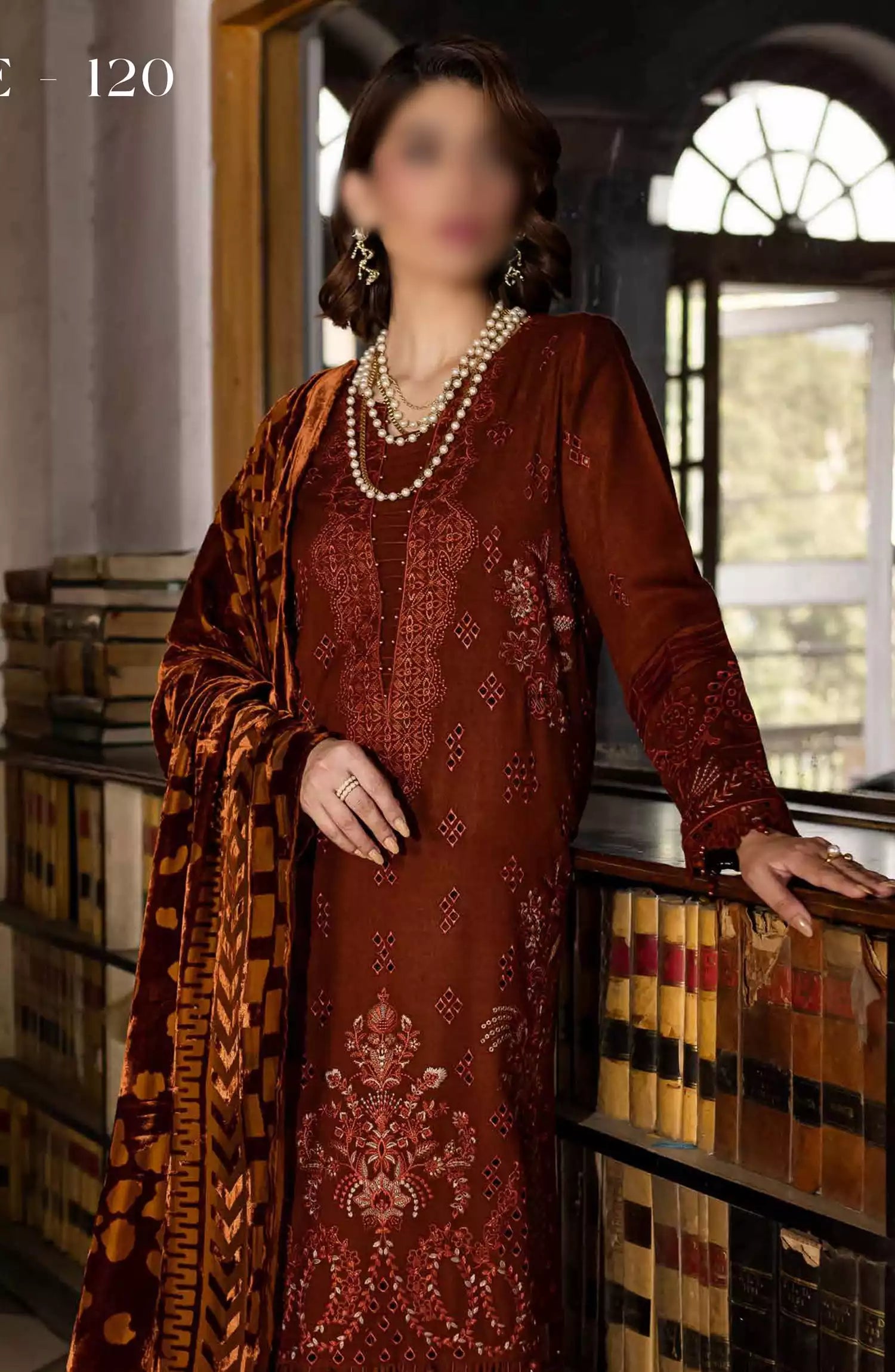 Nureh Unstitched Embroidered Leather Peach Collection with Velvet Palachi Shawl has been styled in the image for photography and illustrative purposes.