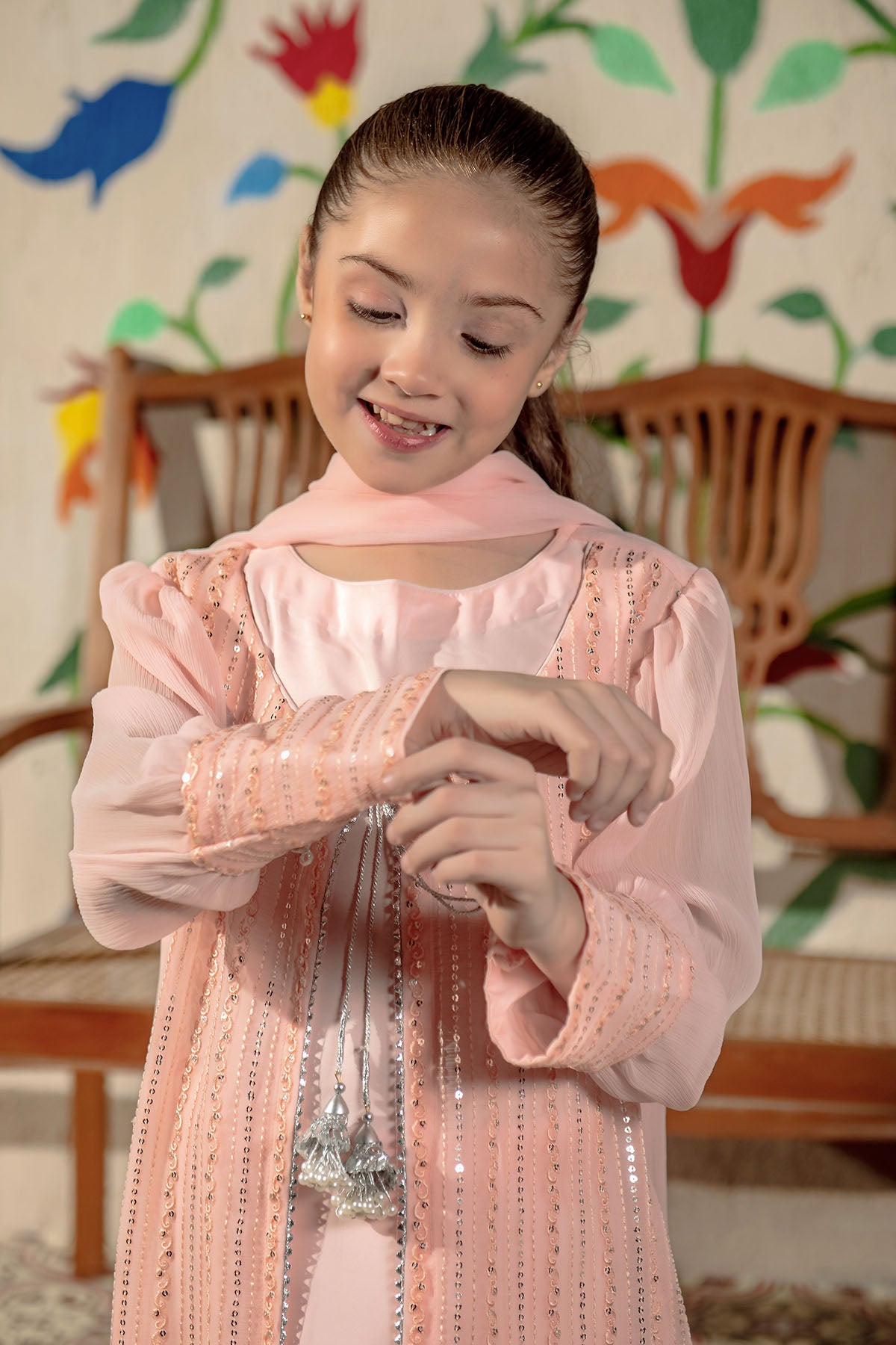 Top: Dark Peach Round Neck Chiffon Flared Front Open Kurta With Embroidery & Tassel Knot With Stitched Malai Crepe Lining