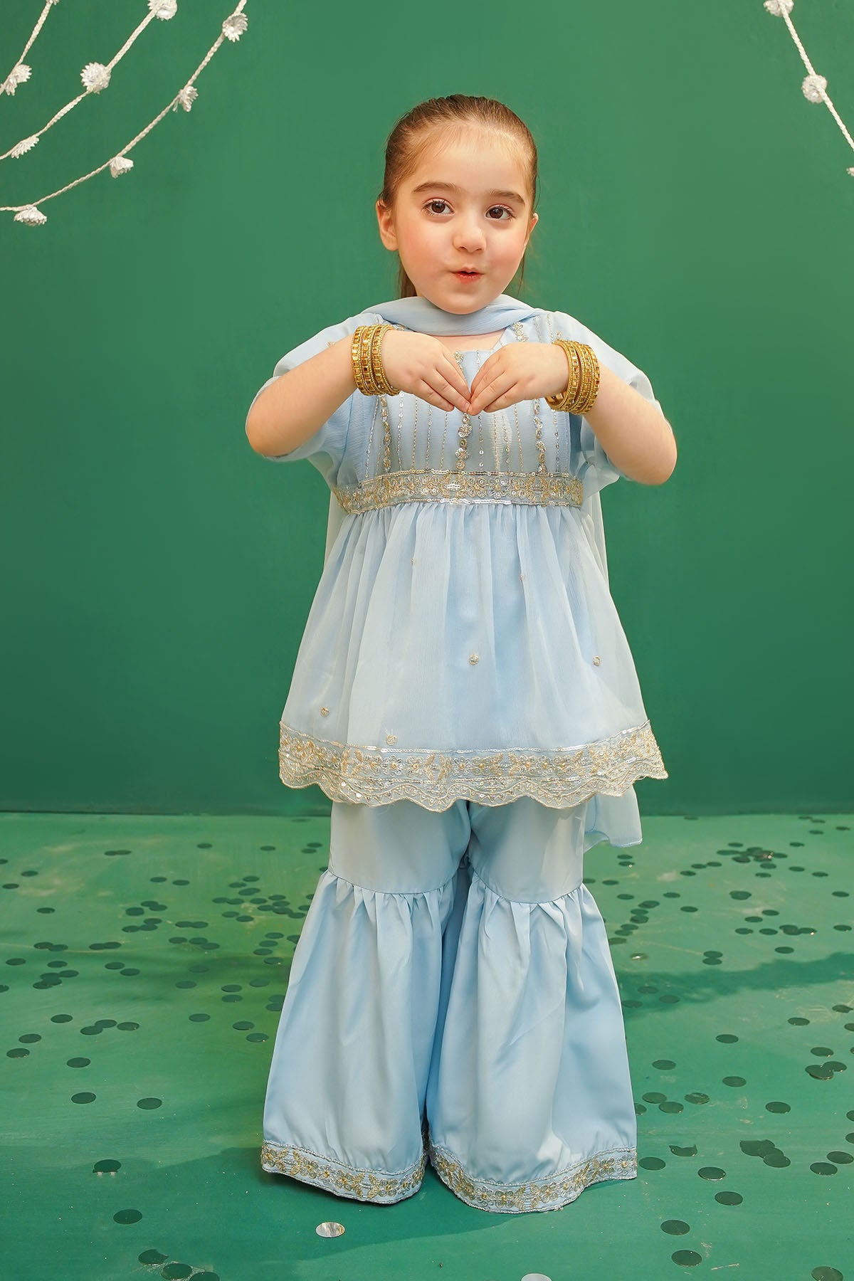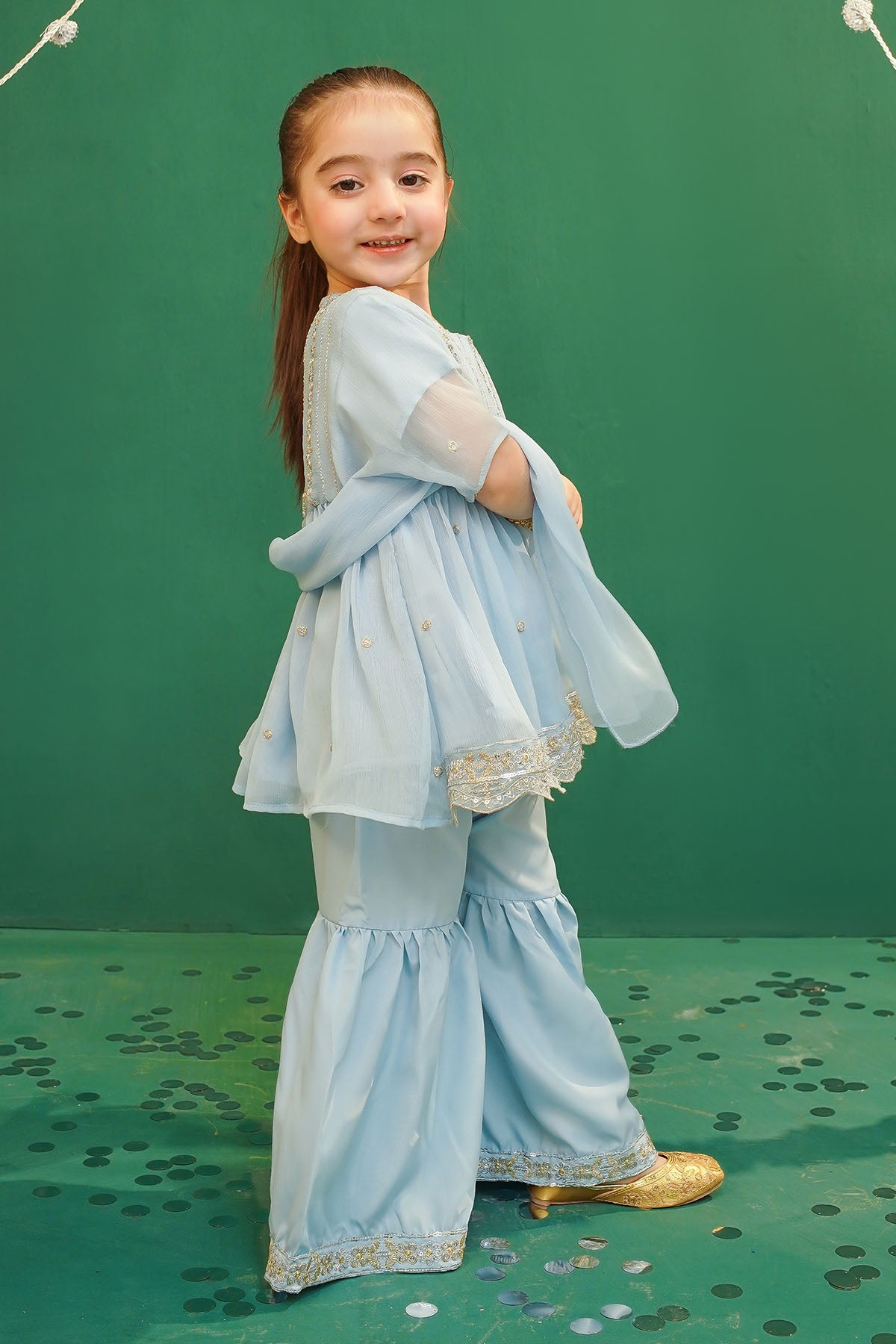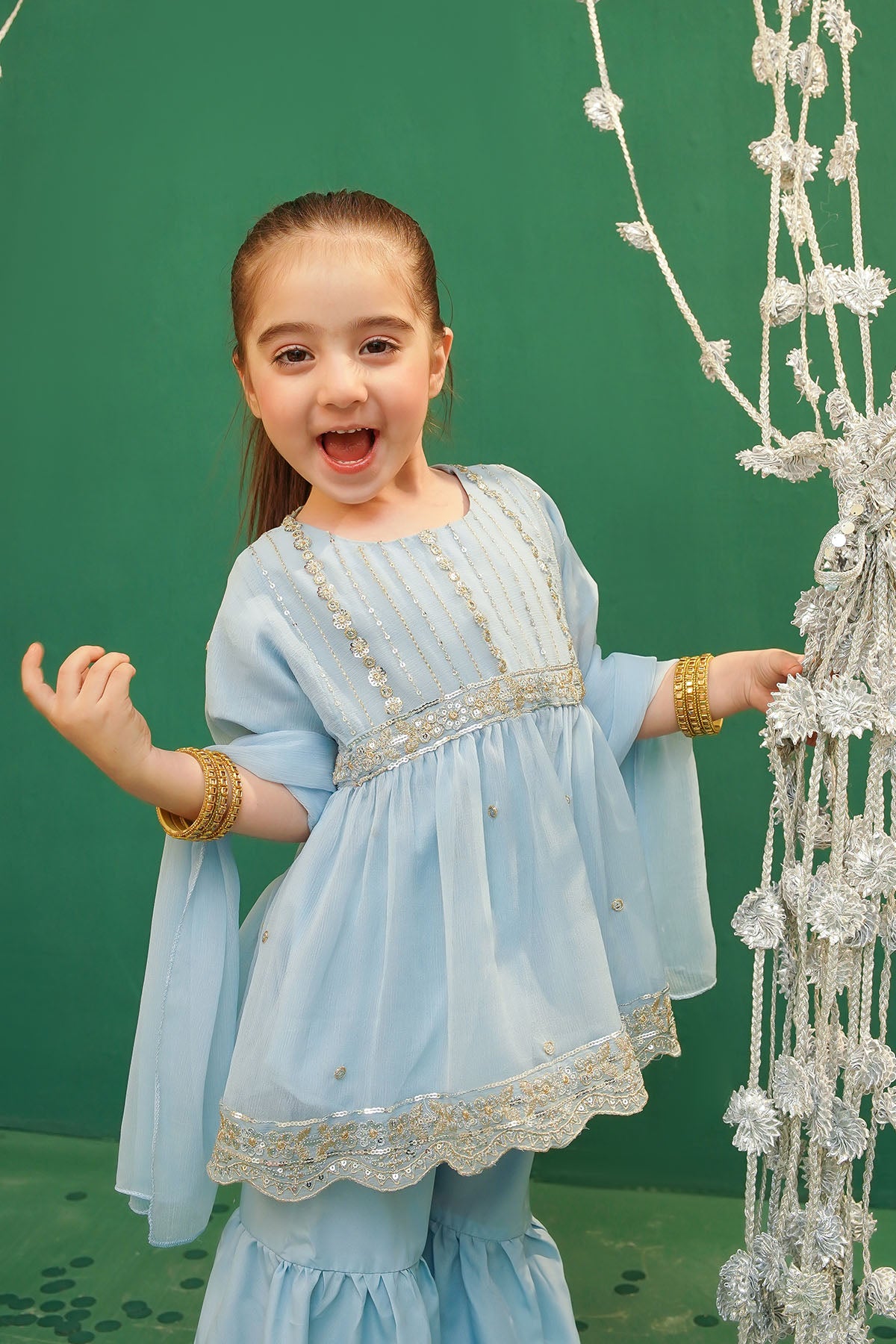 Bottom: Chambray Blue Malai Crepe Gharara Pants, Adorned With Delicate Embroidery Patti