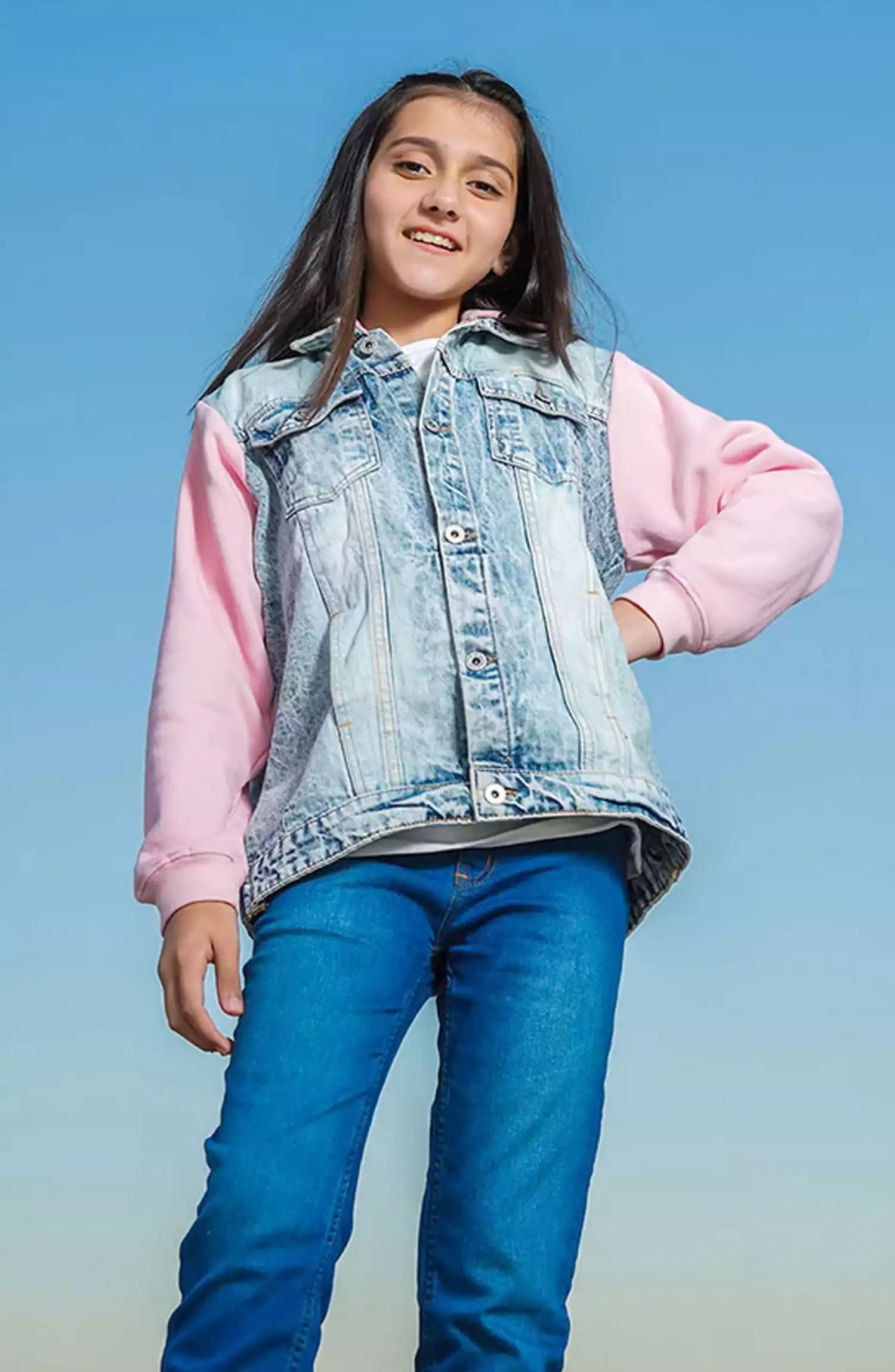 Denim Acid Wash Jacket with Fleece Sleeves and Hoodie