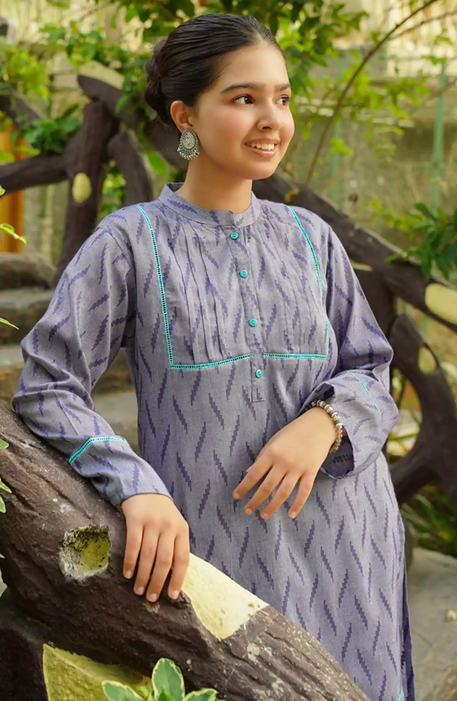 Top: Blue Self Printed Chambray Cotton Kurta with Laces