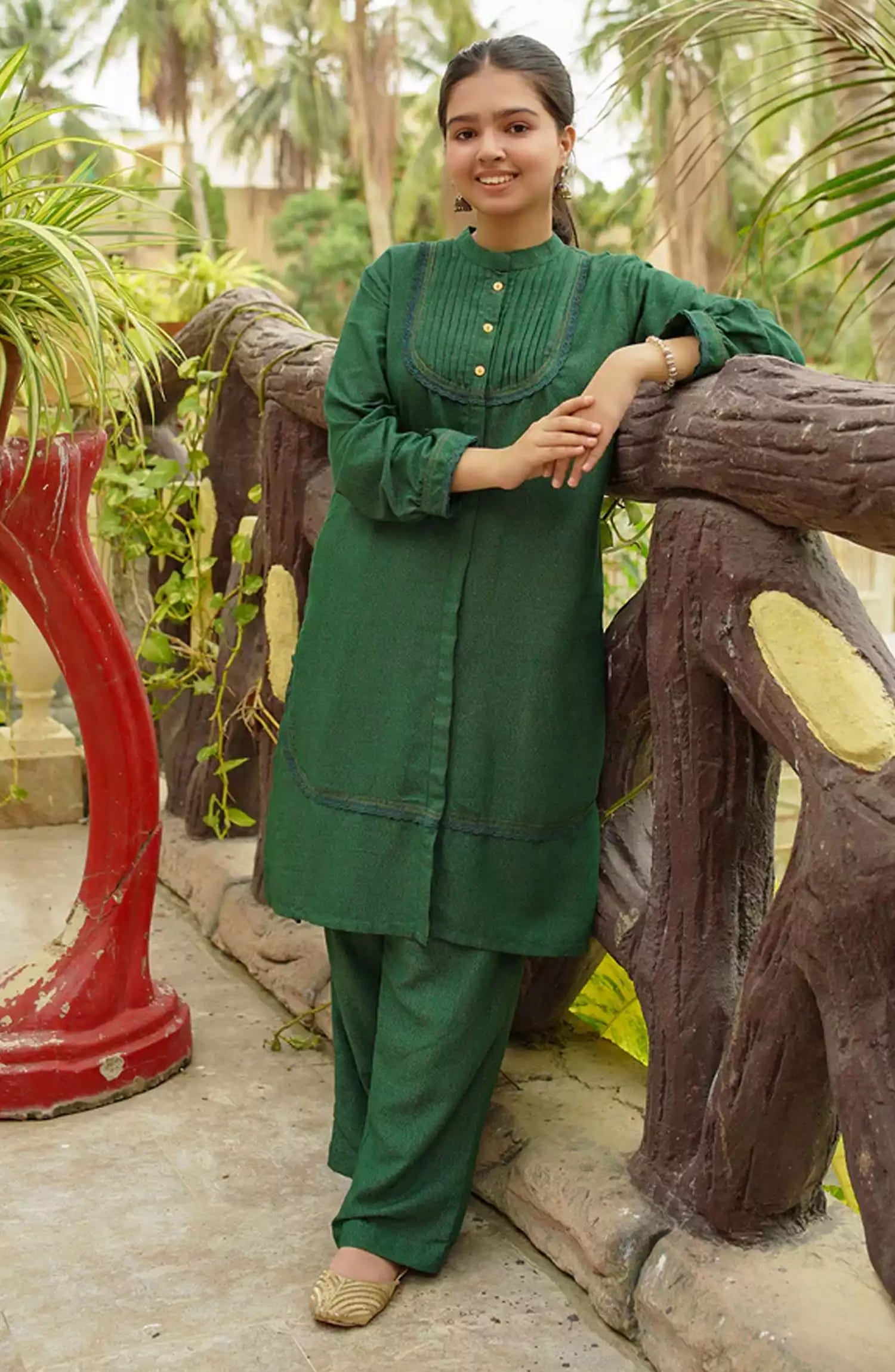 Top: Emerald Green Cotton Karandi Kurta With Laces