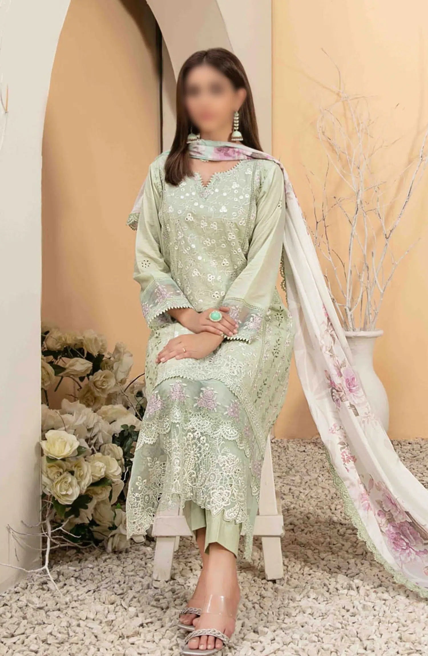 Semi-Stitched Fancy Heavy Embroidered Lawn Shirt with embellishments Exclusive Embroidered Digital Printed Silk Dupatta Unstitched Plain cotton Shalwar