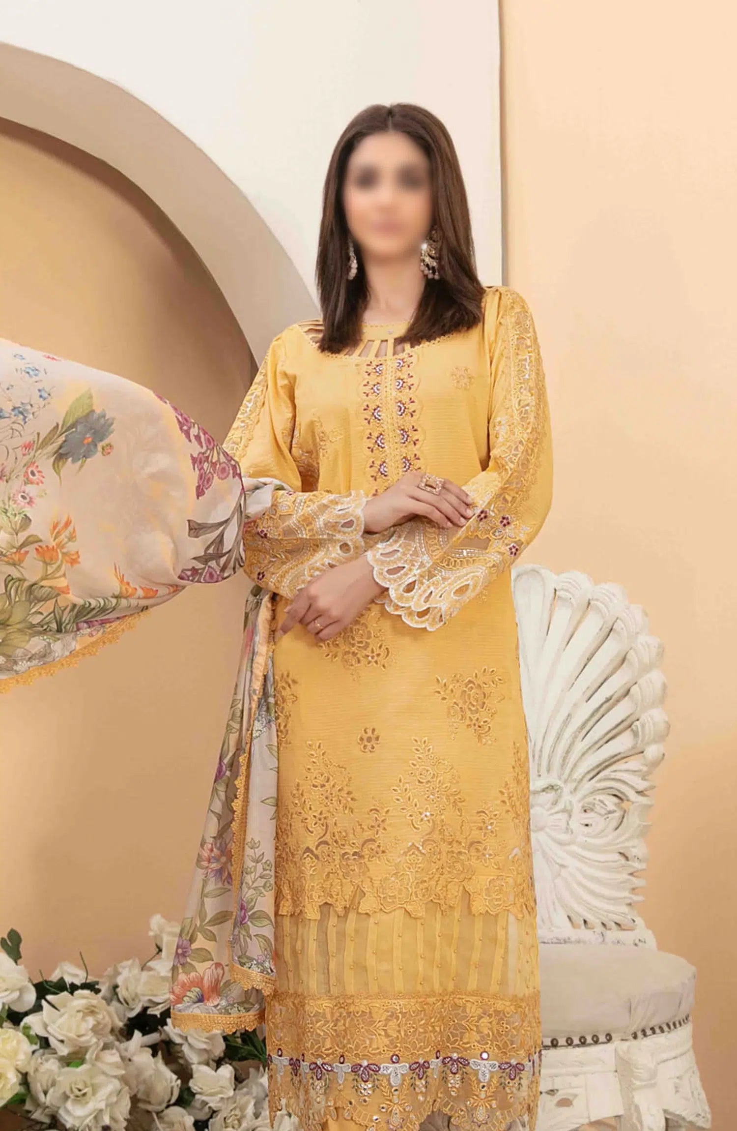 Semi-Stitched Fancy Heavy Embroidered Lawn Shirt with embellishments Exclusive Embroidered Digital Printed Silk Dupatta Unstitched Plain cotton Shalwar