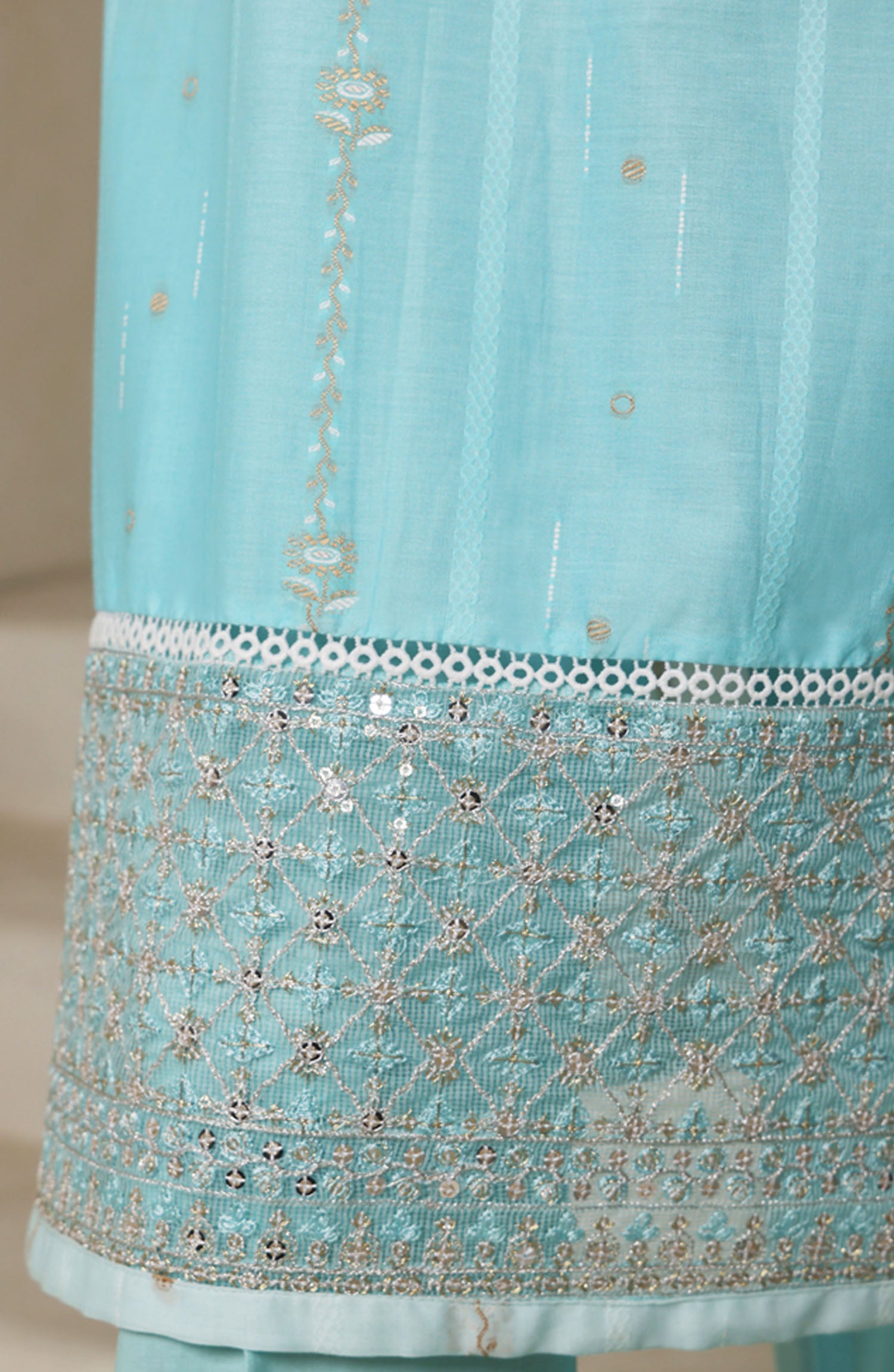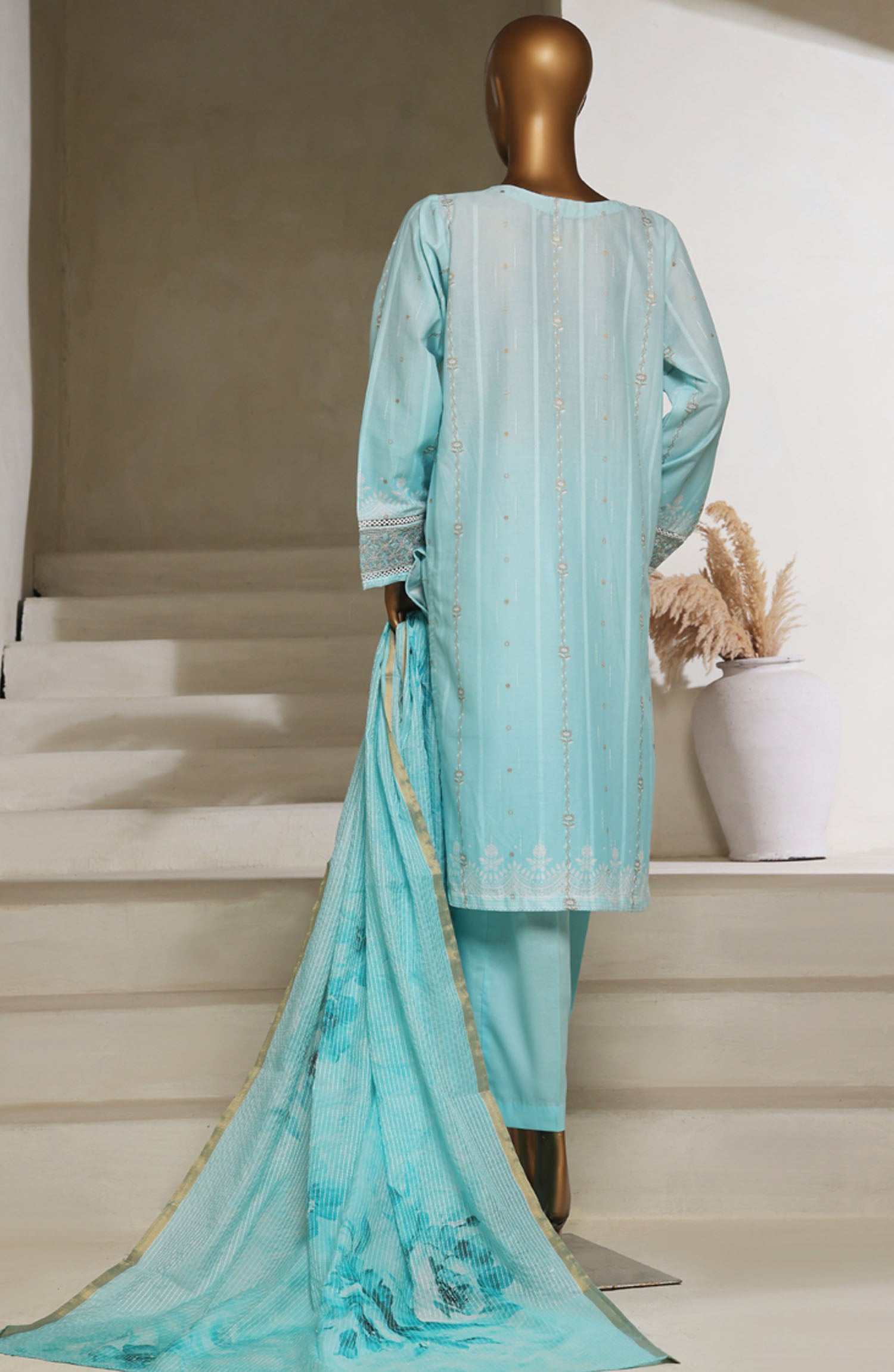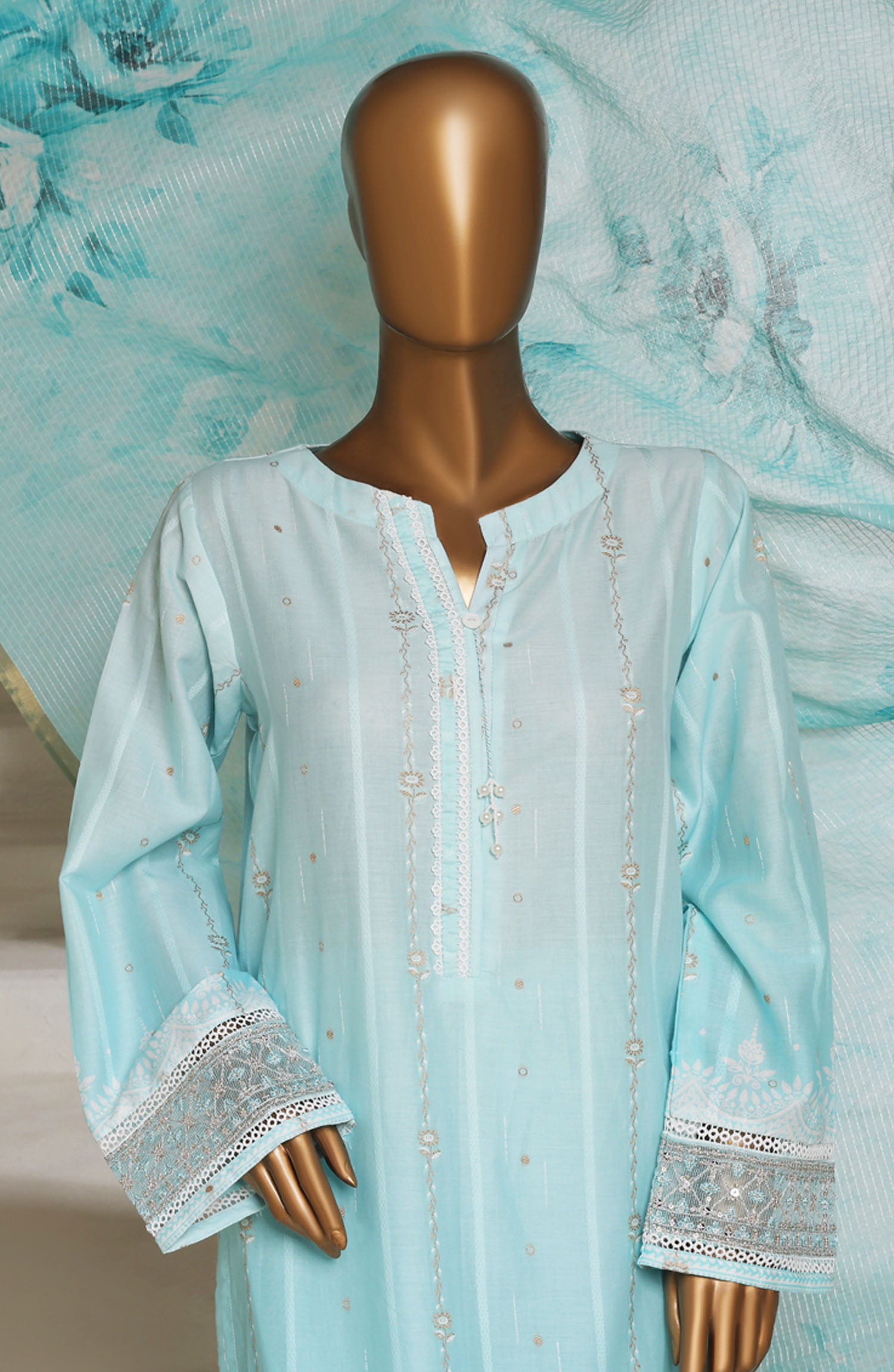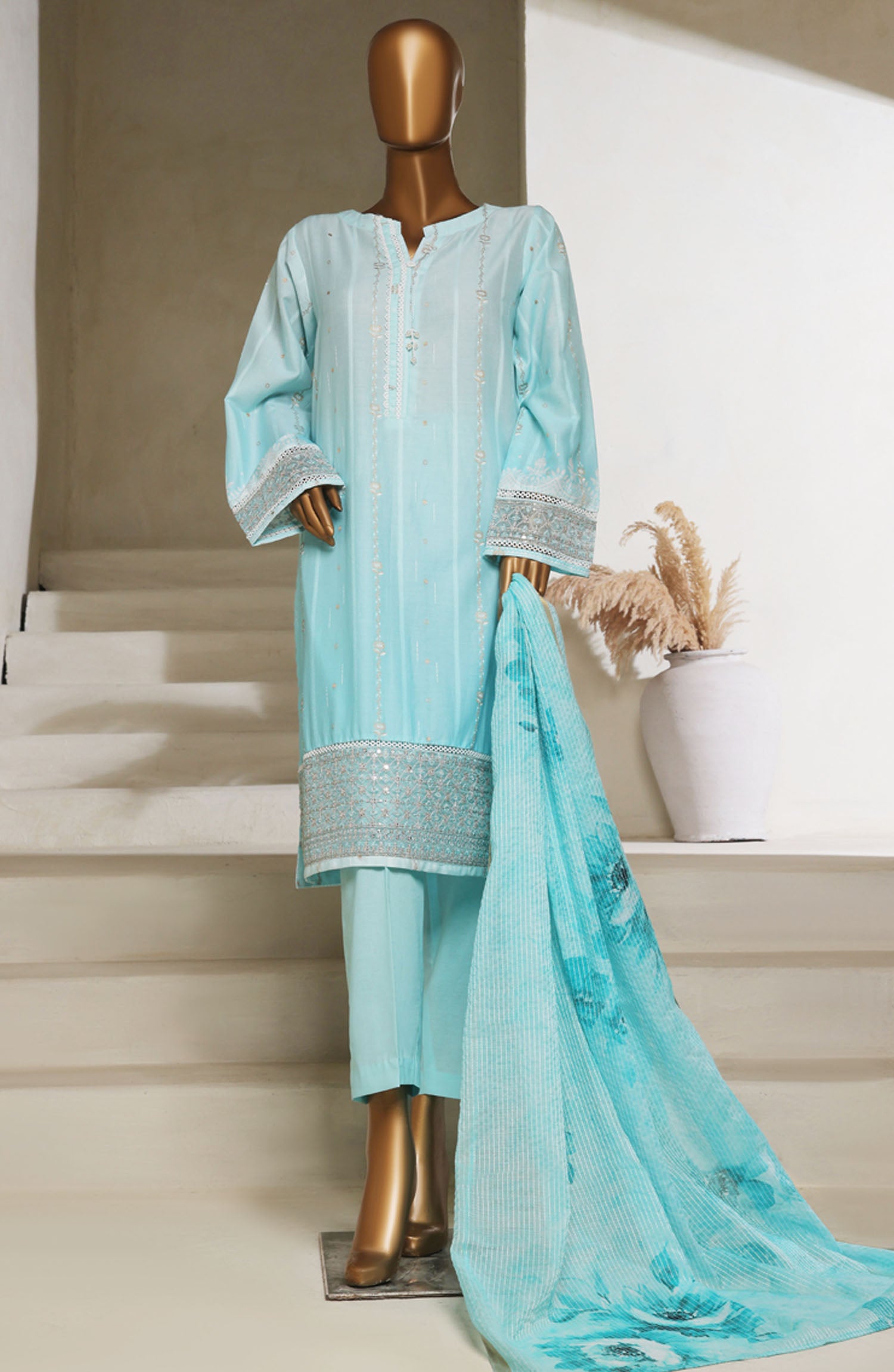 Digital Printed Lawn Shaded Jacquard Shirt with Highlights of Embroidered Borders & Stitching Details