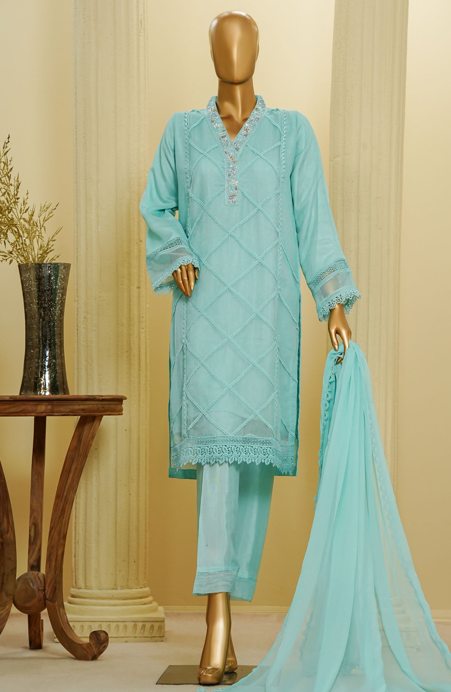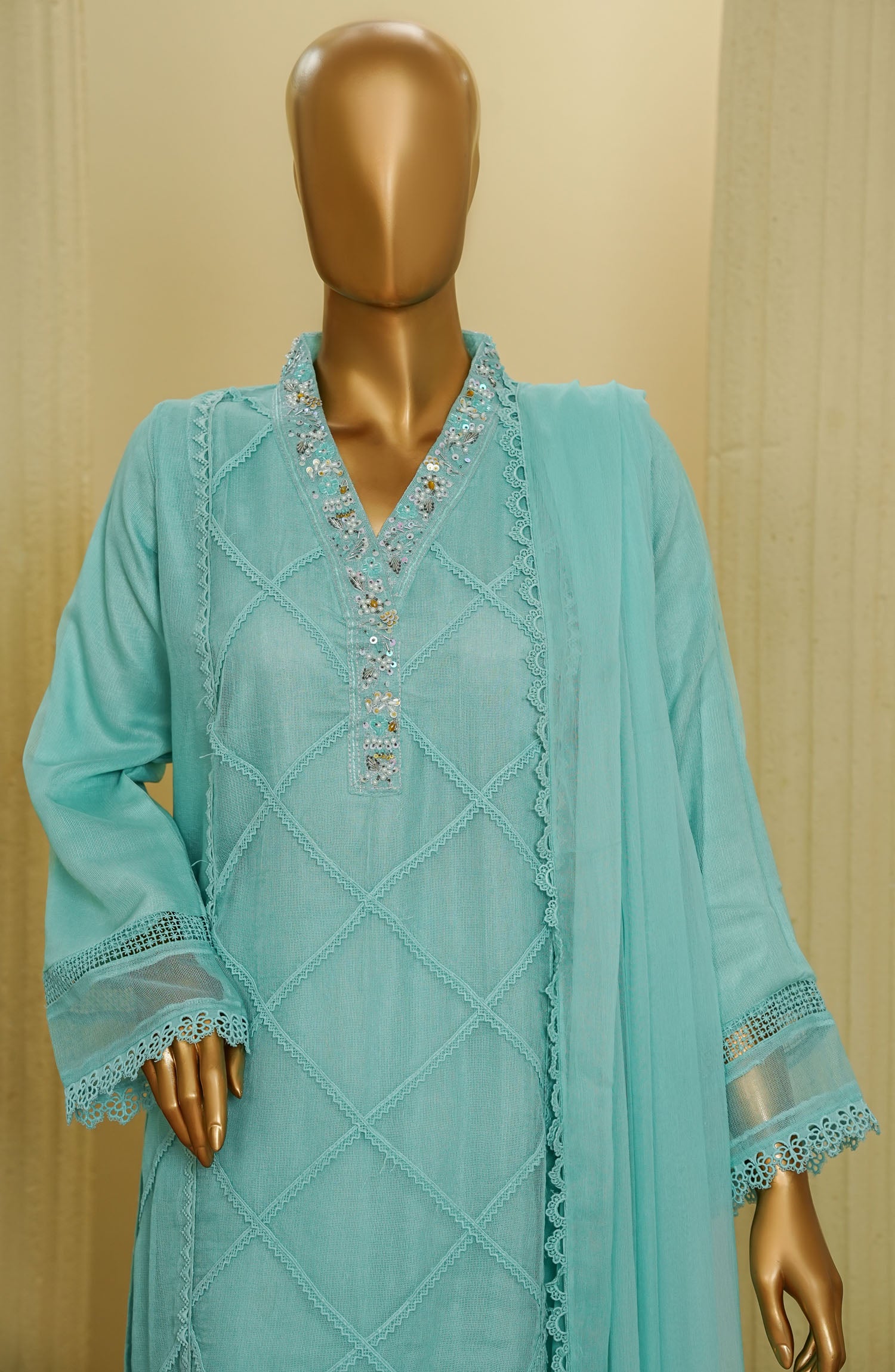 Exclusive Handwork Embroidered Stitched Khaddi Net Shirt with Lacework and Raw Silk Inner
