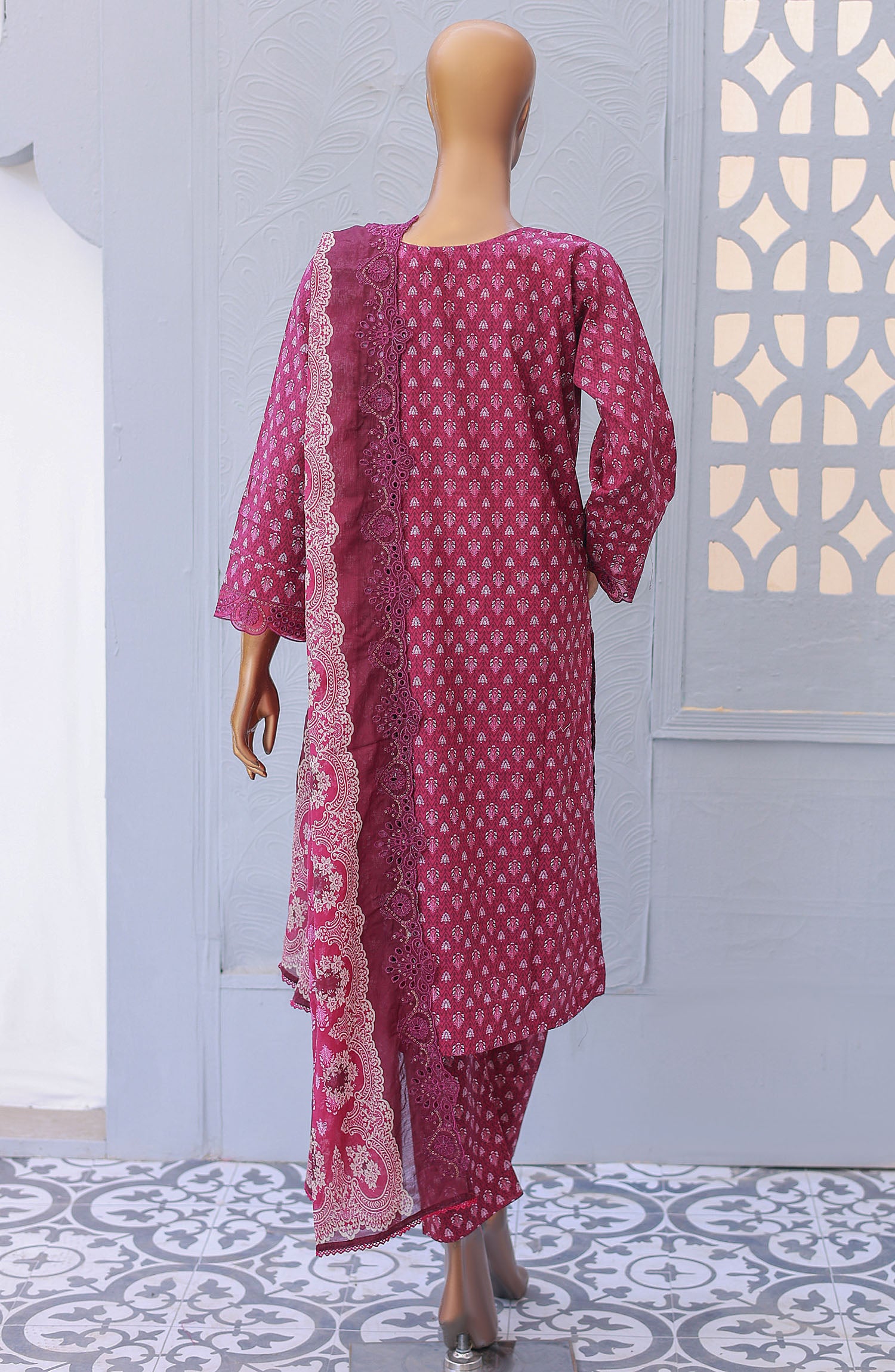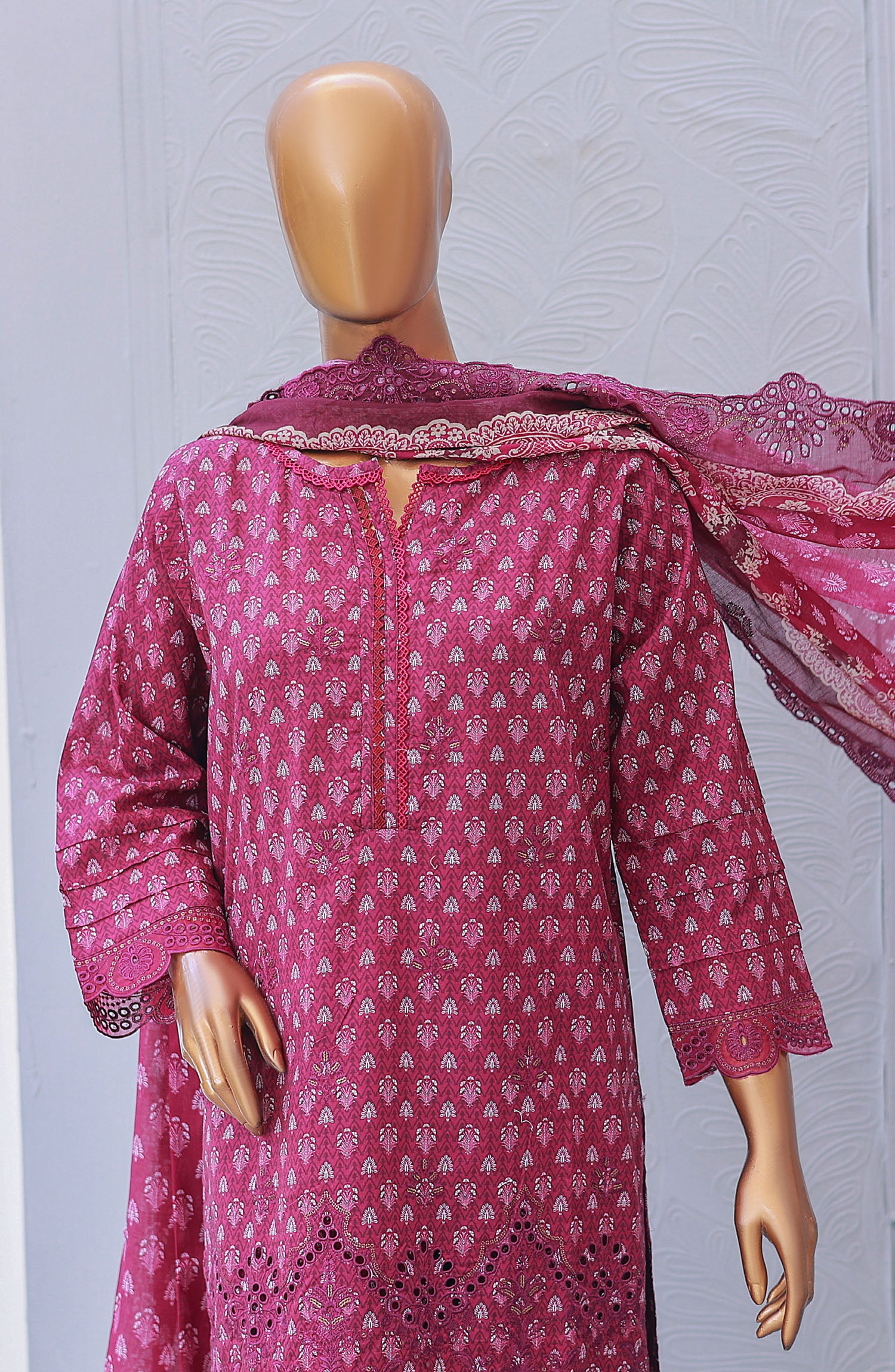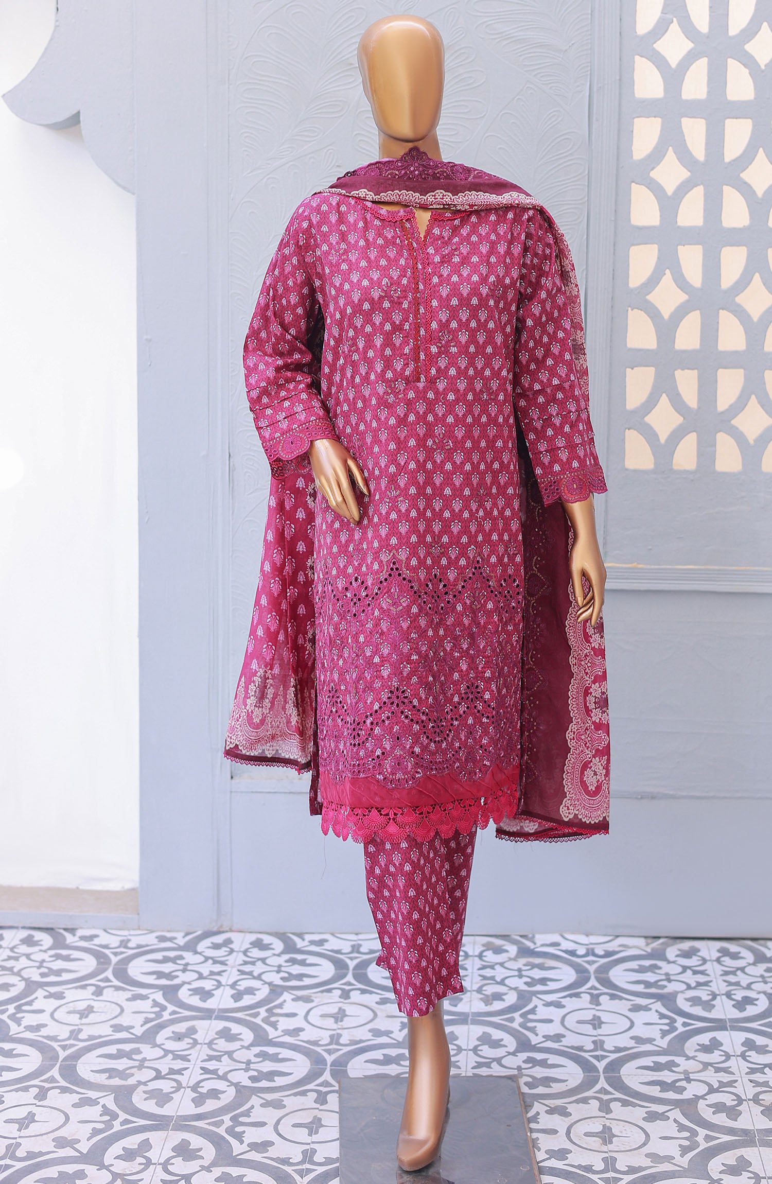 Printed Chikankari Embroidered Front And Sleeves With Lace