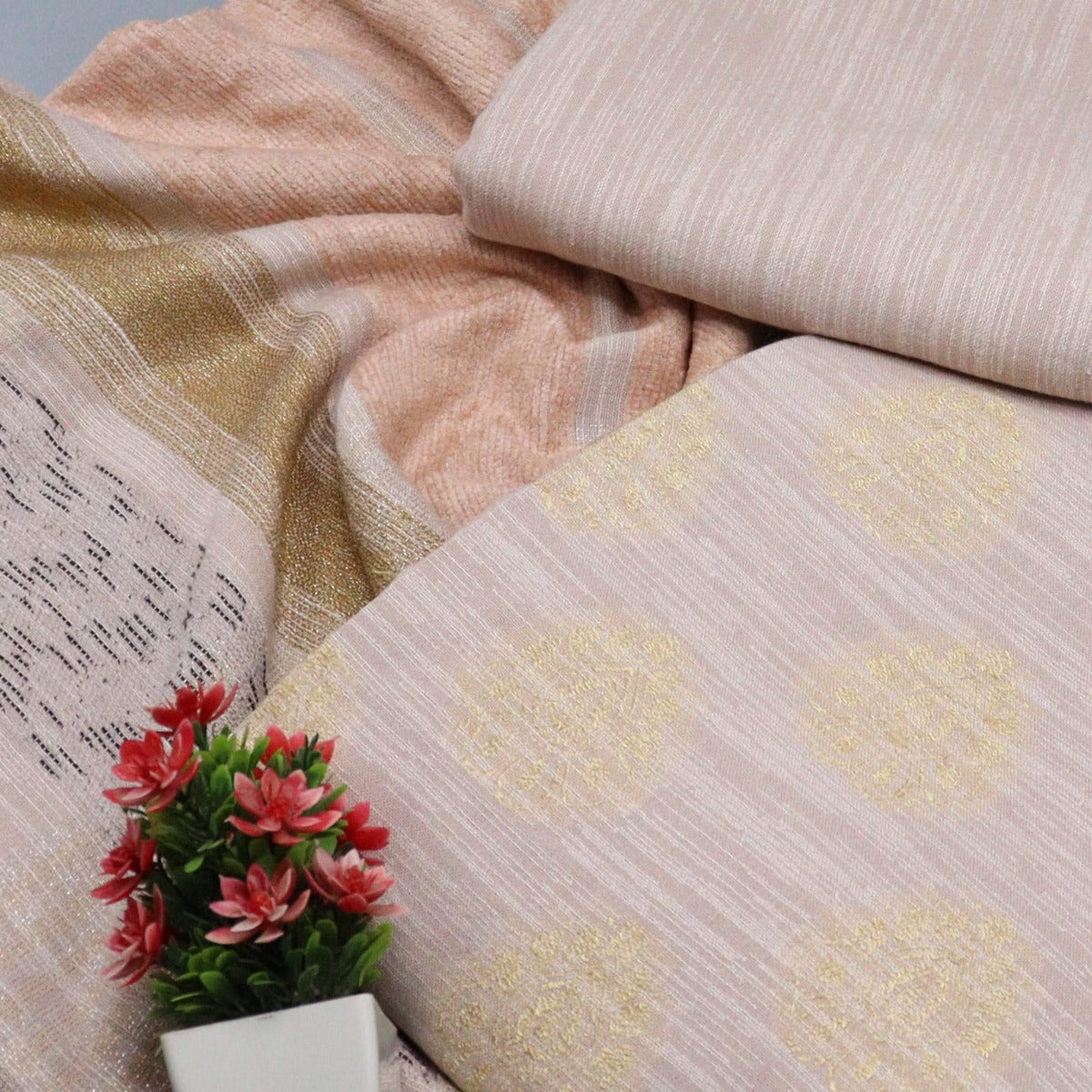 Peach Unstitched Dhanak Jacquard Collection has been styled in the image for photography and illustrative purposes.