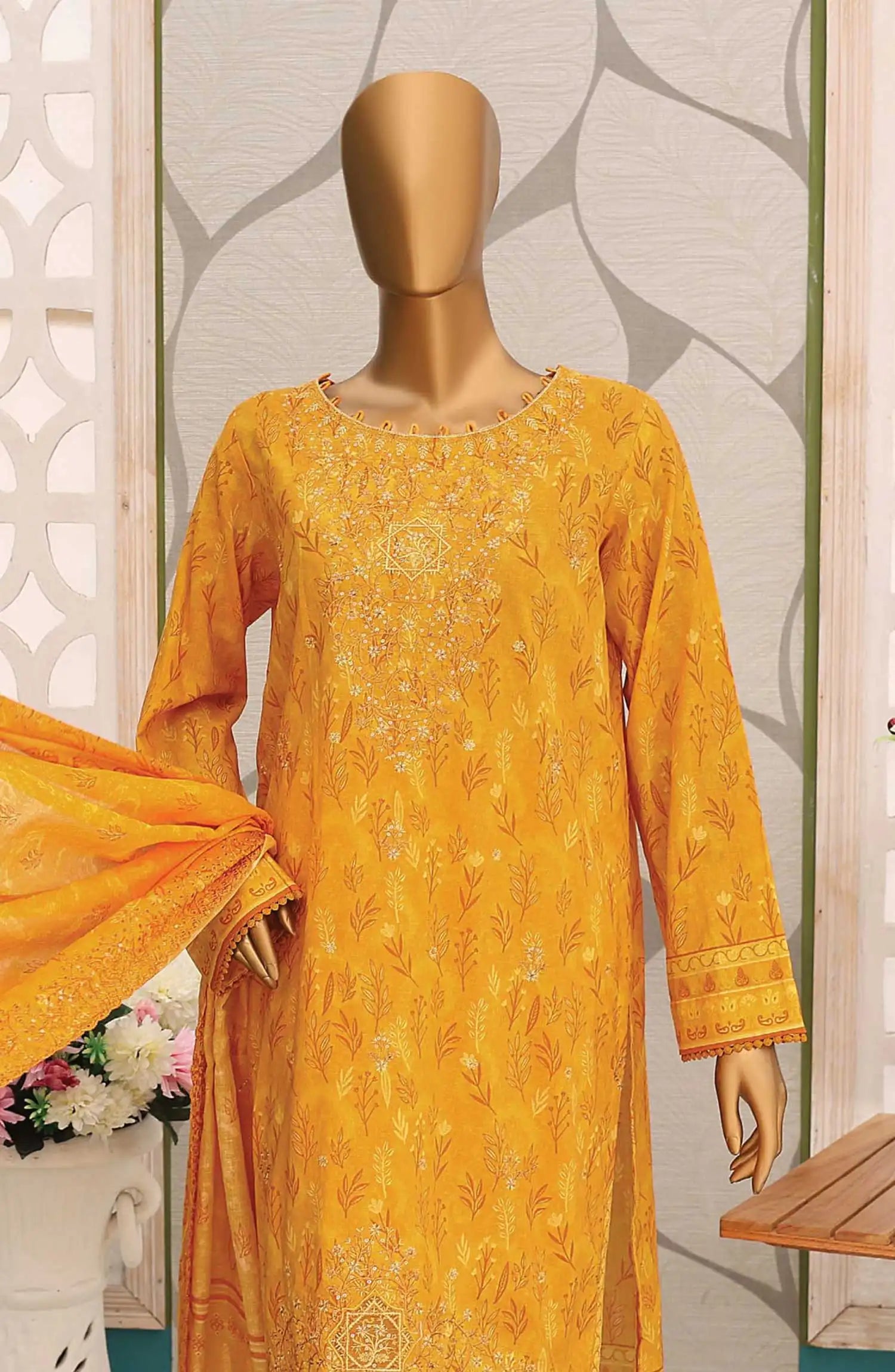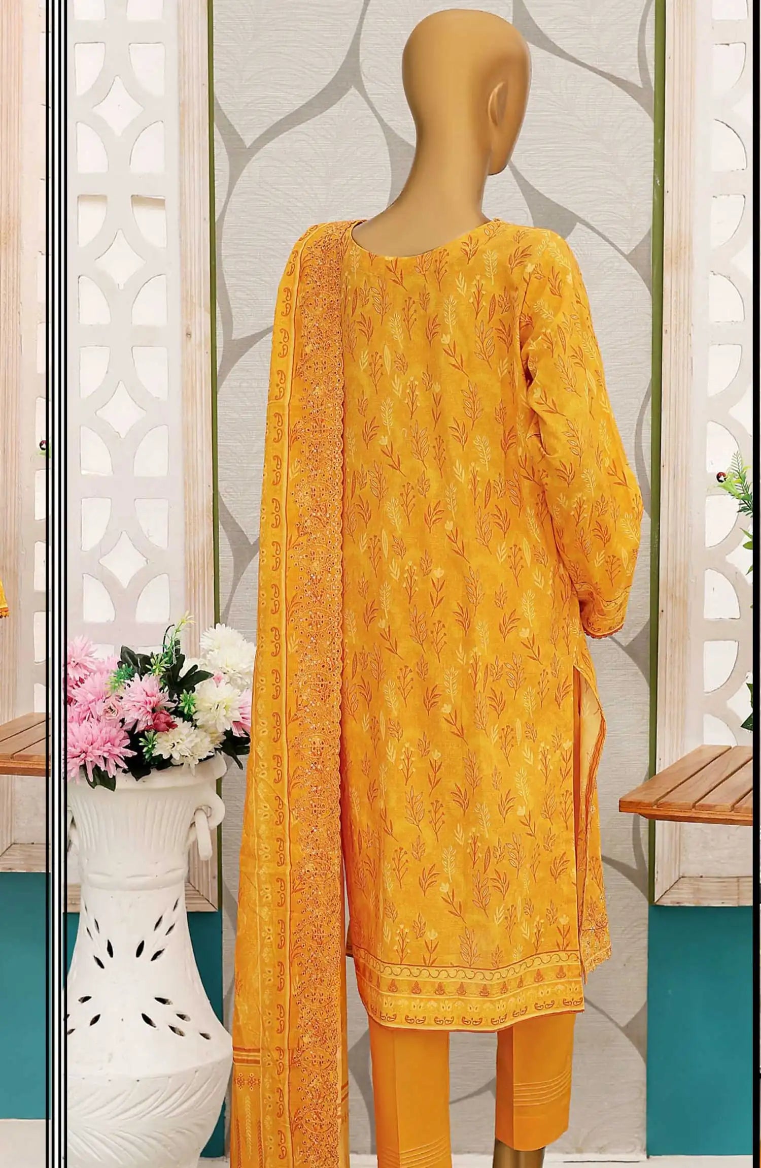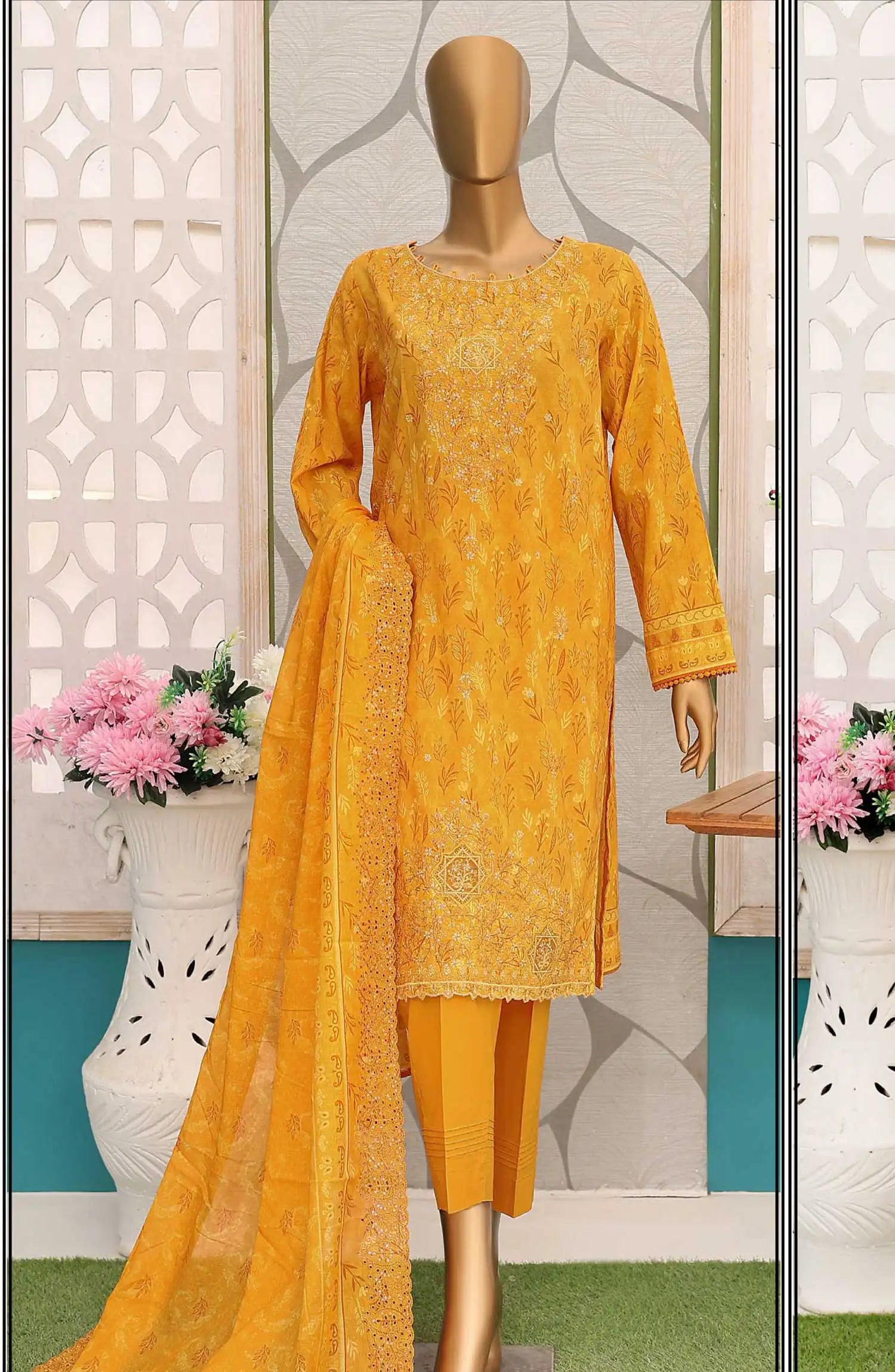 Premium Embroidered Cotton Lawn Shirt With Embroidered Cutwork Lawn Dupatta Vol 02 has been styled in the image for photography and illustrative purposes.