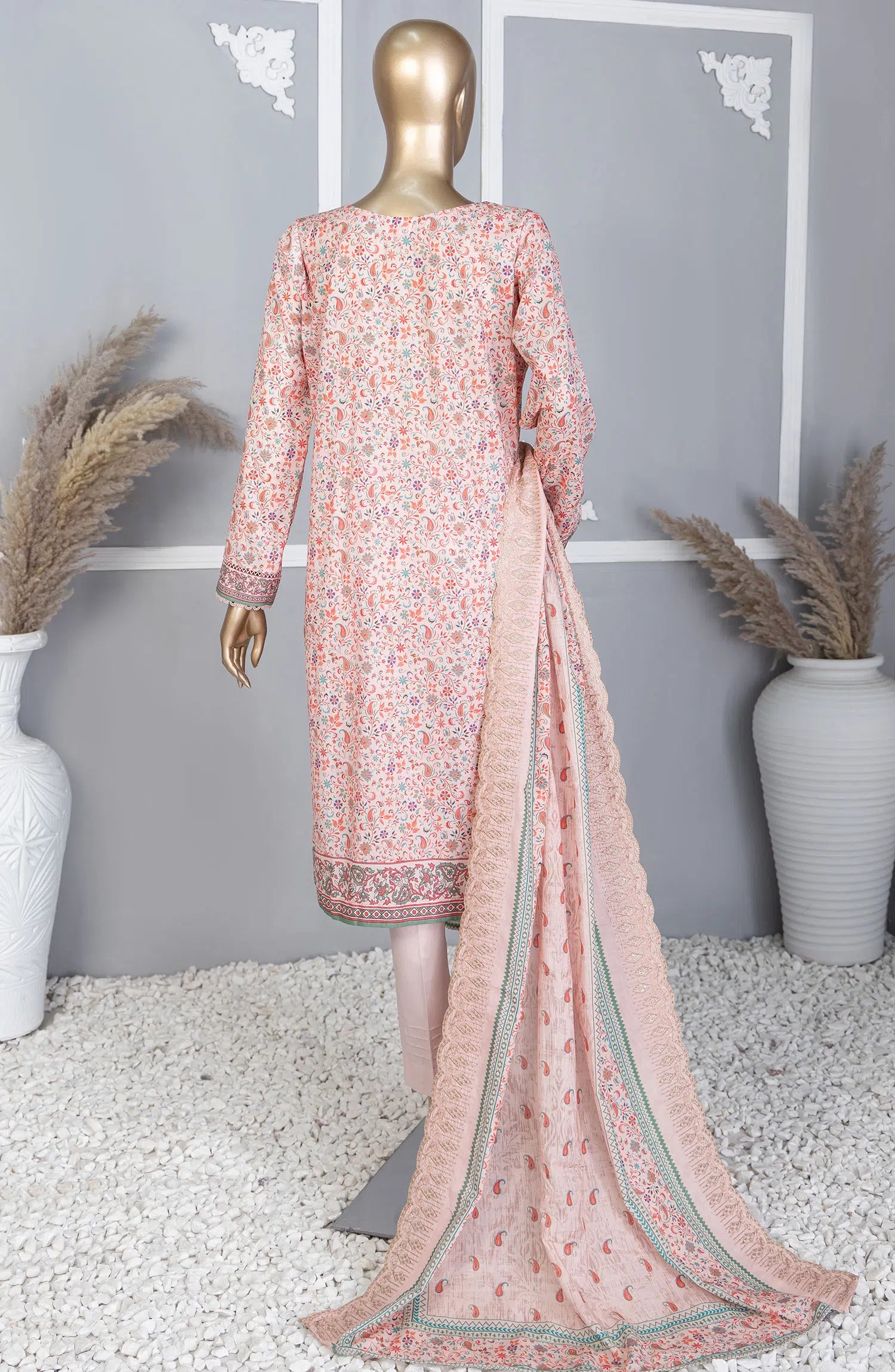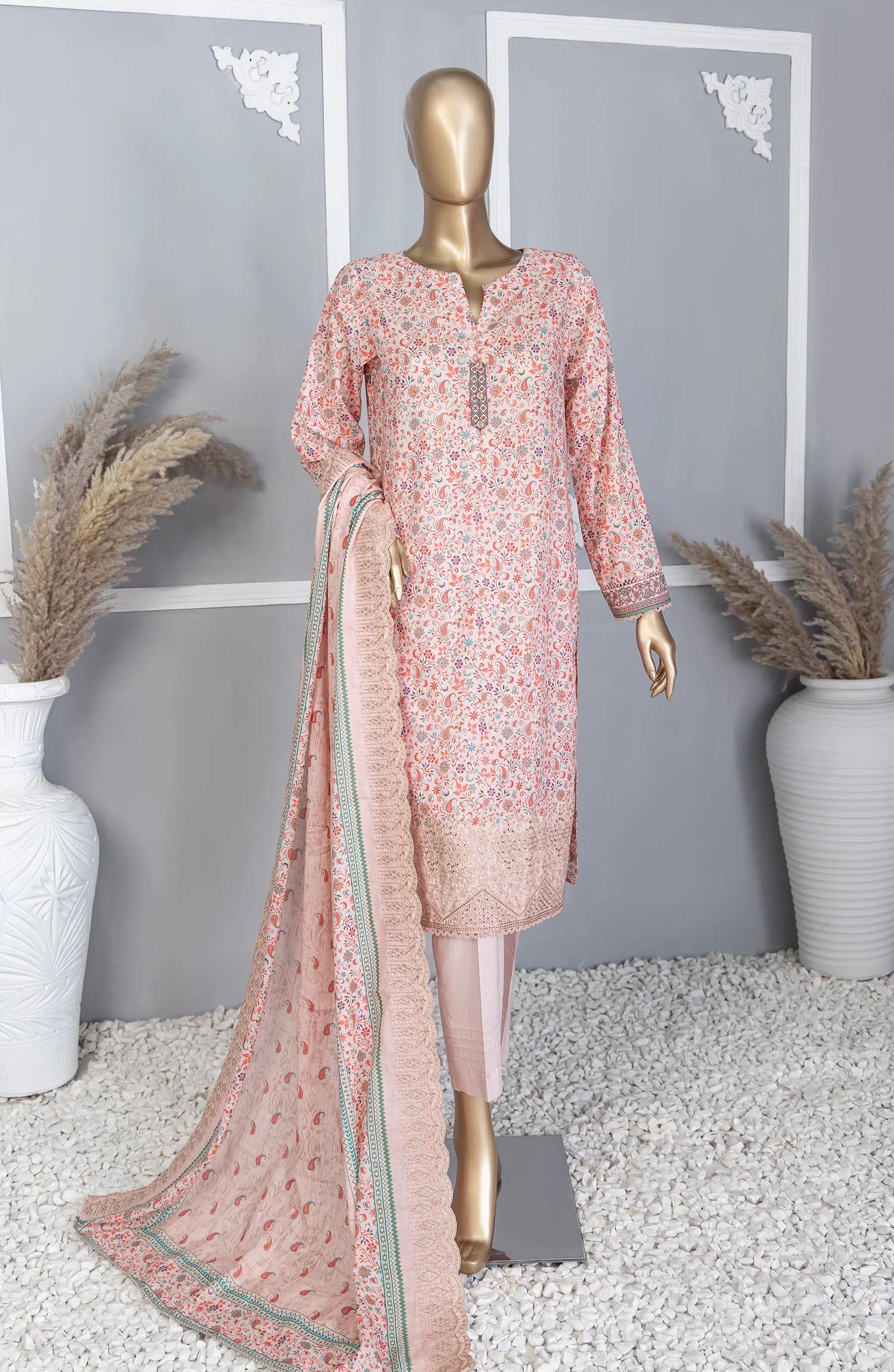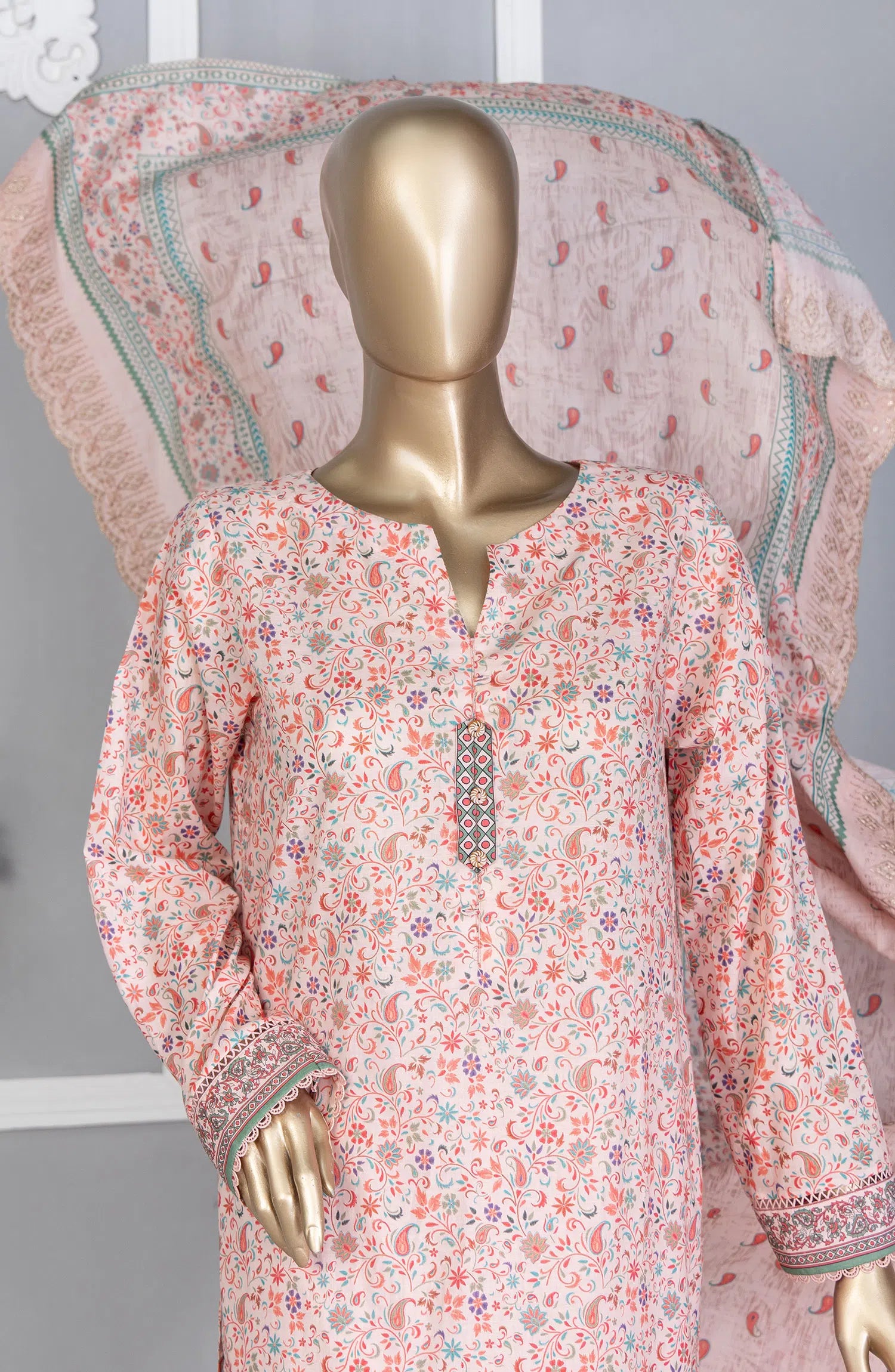 Premium Lawn Embroidered Shirt With Embroidered Cutwork Lawn Dupatta Vol-04 has been styled in the image for photography and illustrative purposes.