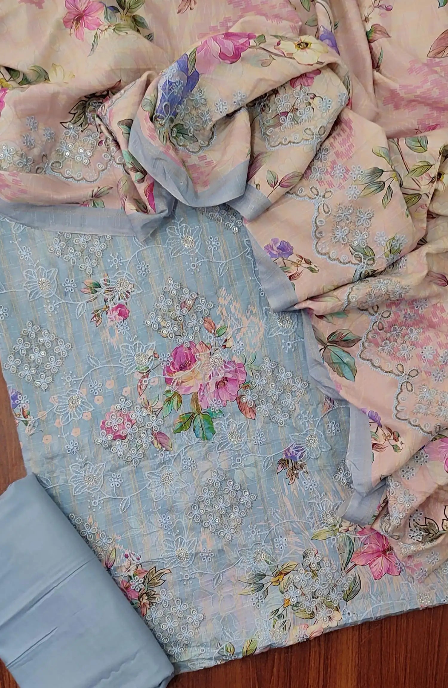 Premium Sequence Emb Linen 3 Pcs with Emb Dupatta Collection - Design 08