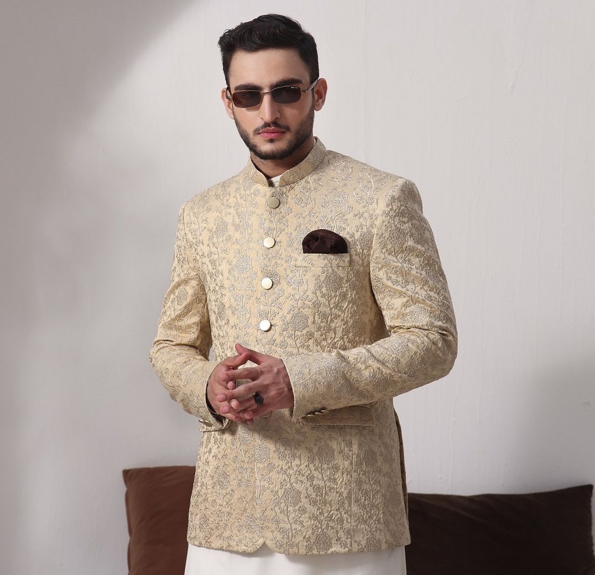 Mens Designer Prince Coat on Maesuri Fabric with Chikan Embroidery