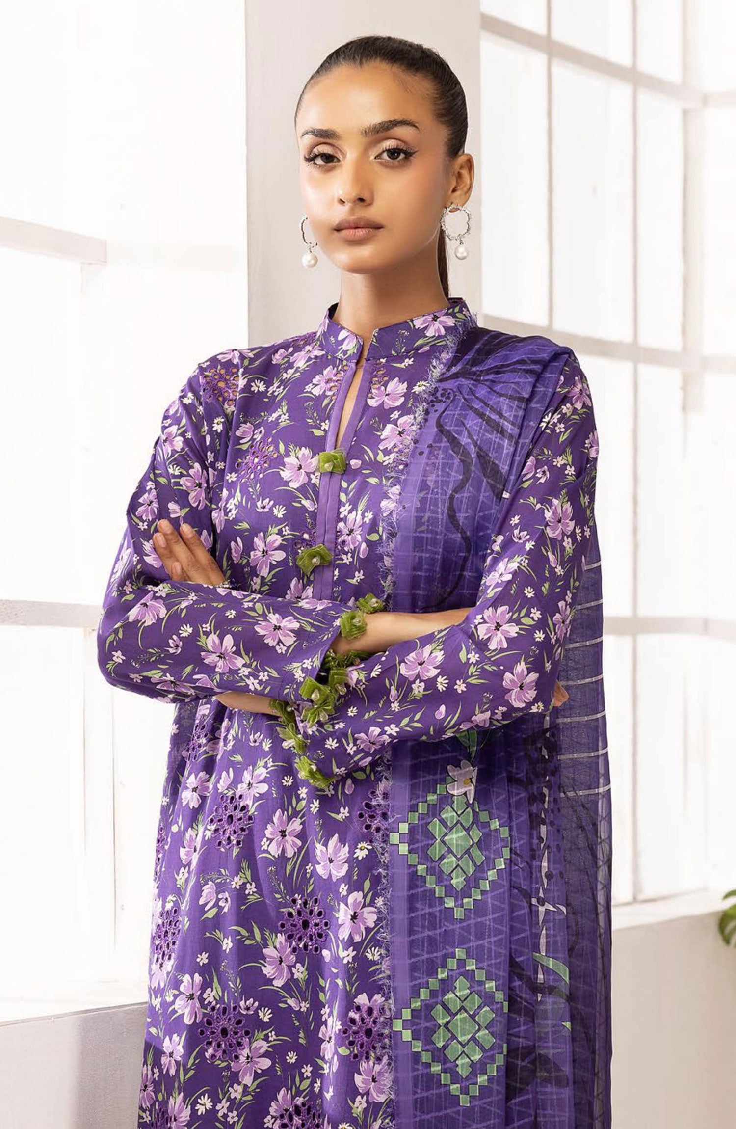 Printkari Embroidered and Printed Unstitched Collection By NUR Vol 03 has been styled in the image for photography and illustrative purposes.