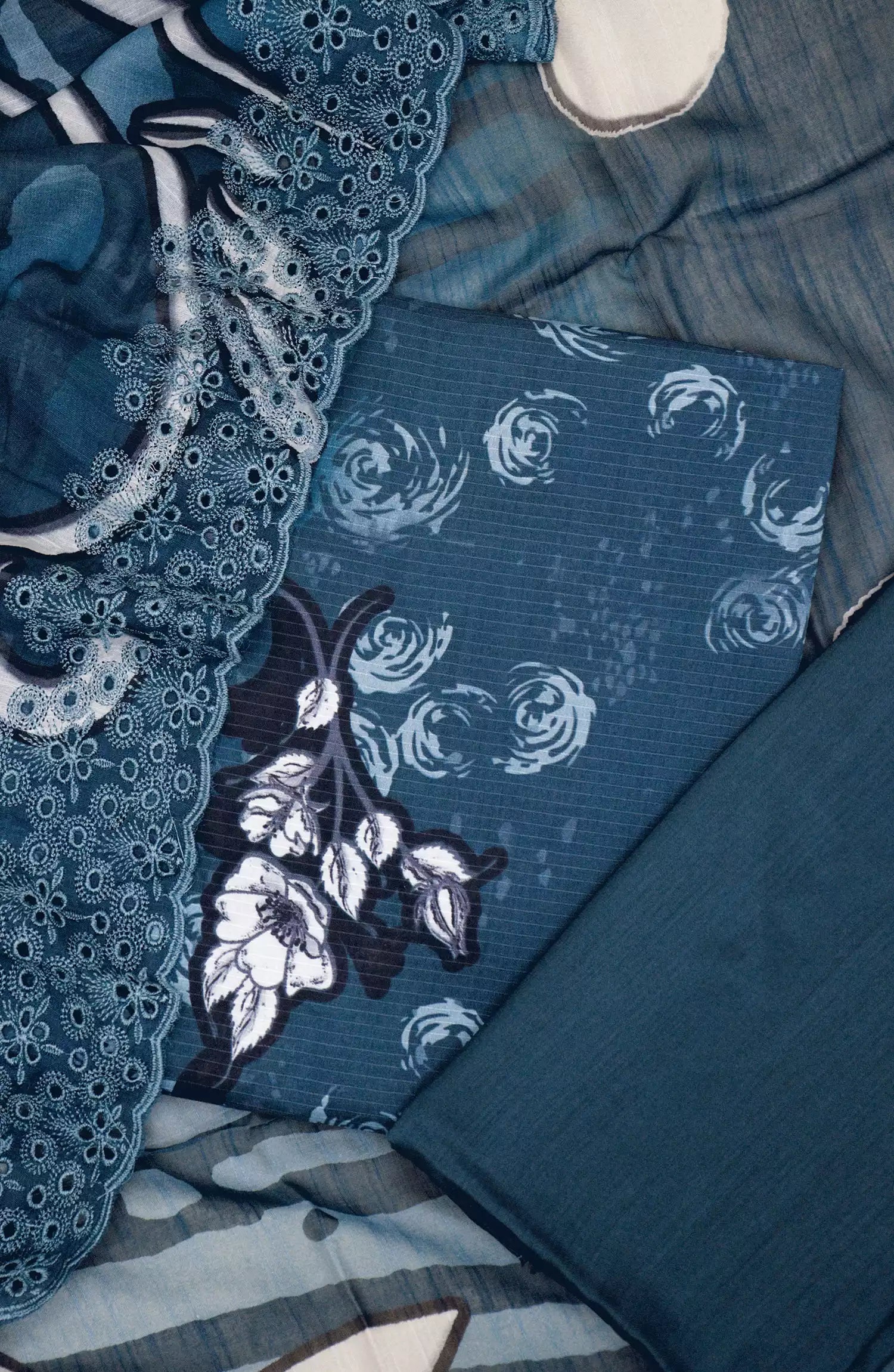 Printkari Unstitch Printed Viscose Collection with Emb Slub Voile Dupatta has been styled in the image for photography and illustrative purposes.