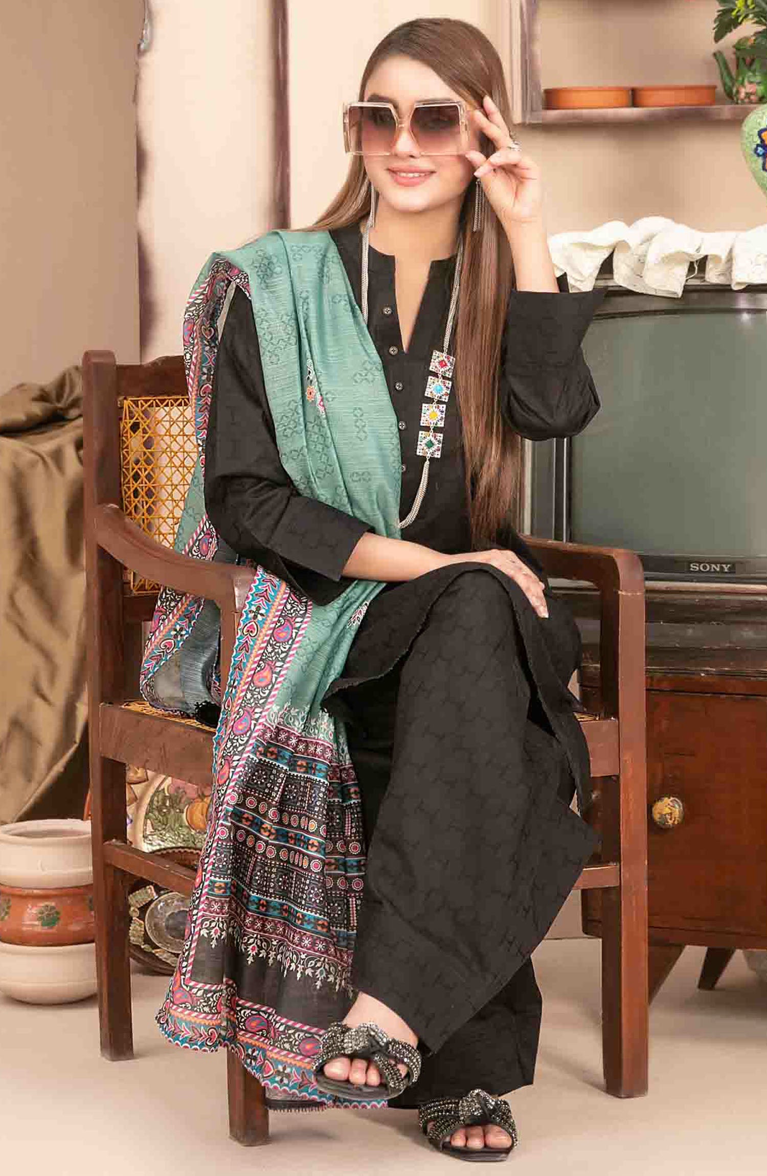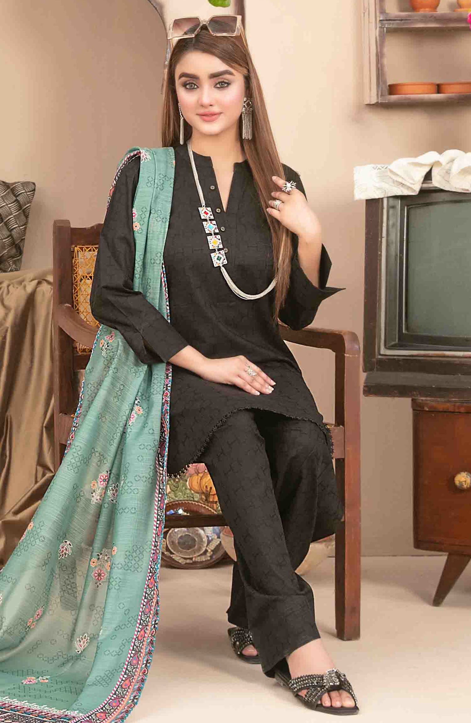 Modest Embroidered Khaddar Stitched 3 Piece Suit - 9990-Blk - MOD25WNT - Black - Winter Collection