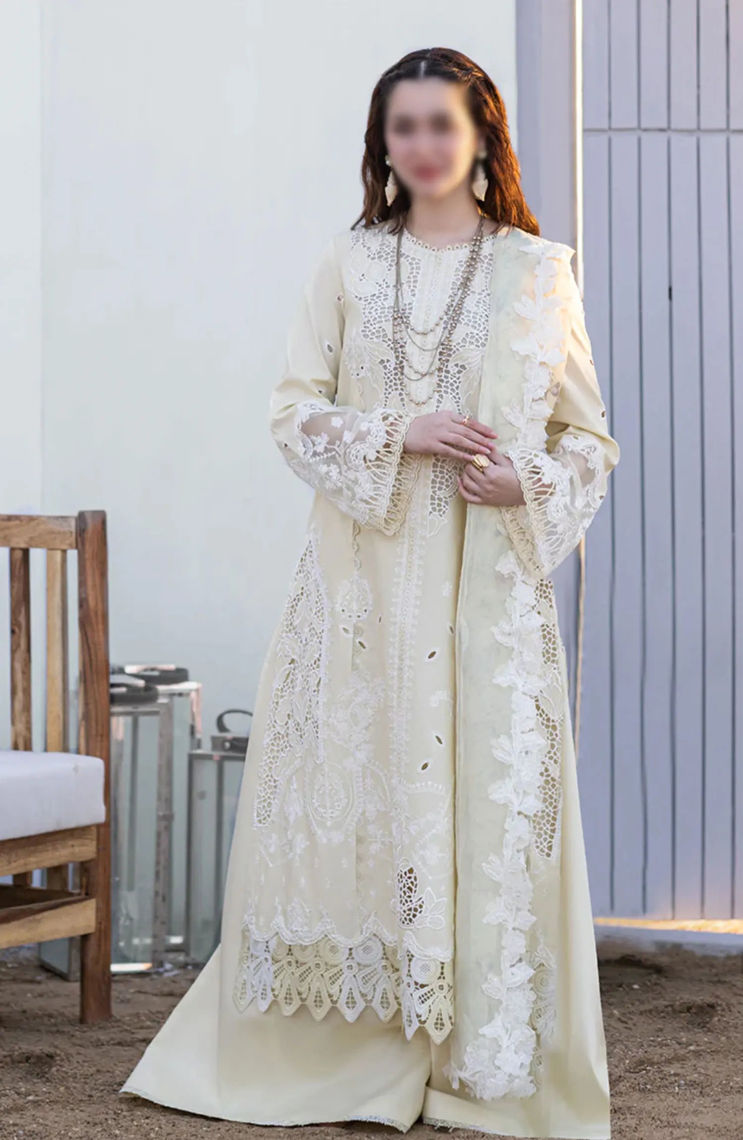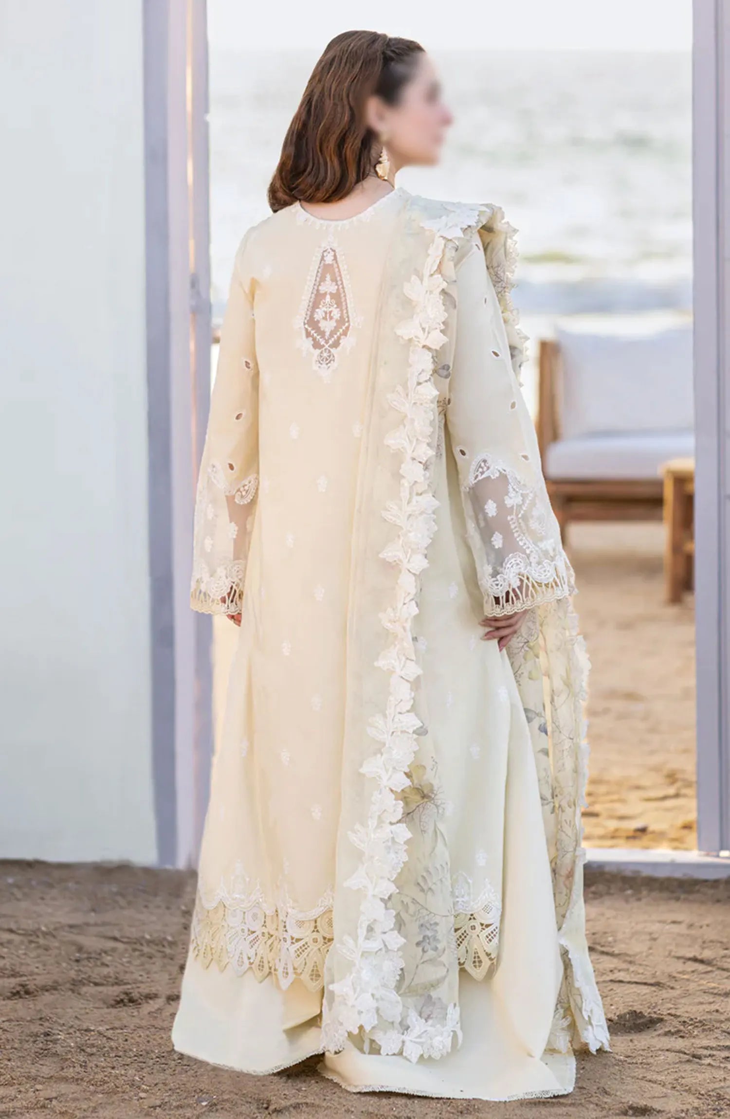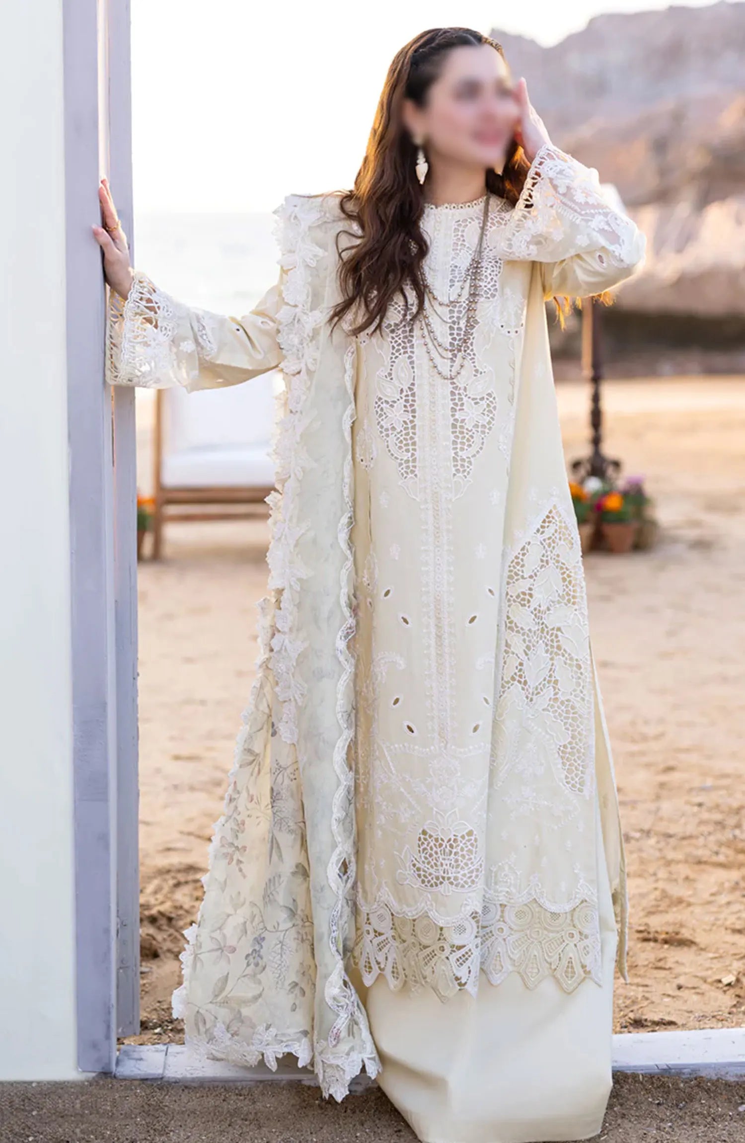 Qalamkar SAHIL KINARE Luxury Lawn Collection 2024 has been styled in the image for photography and illustrative purposes.