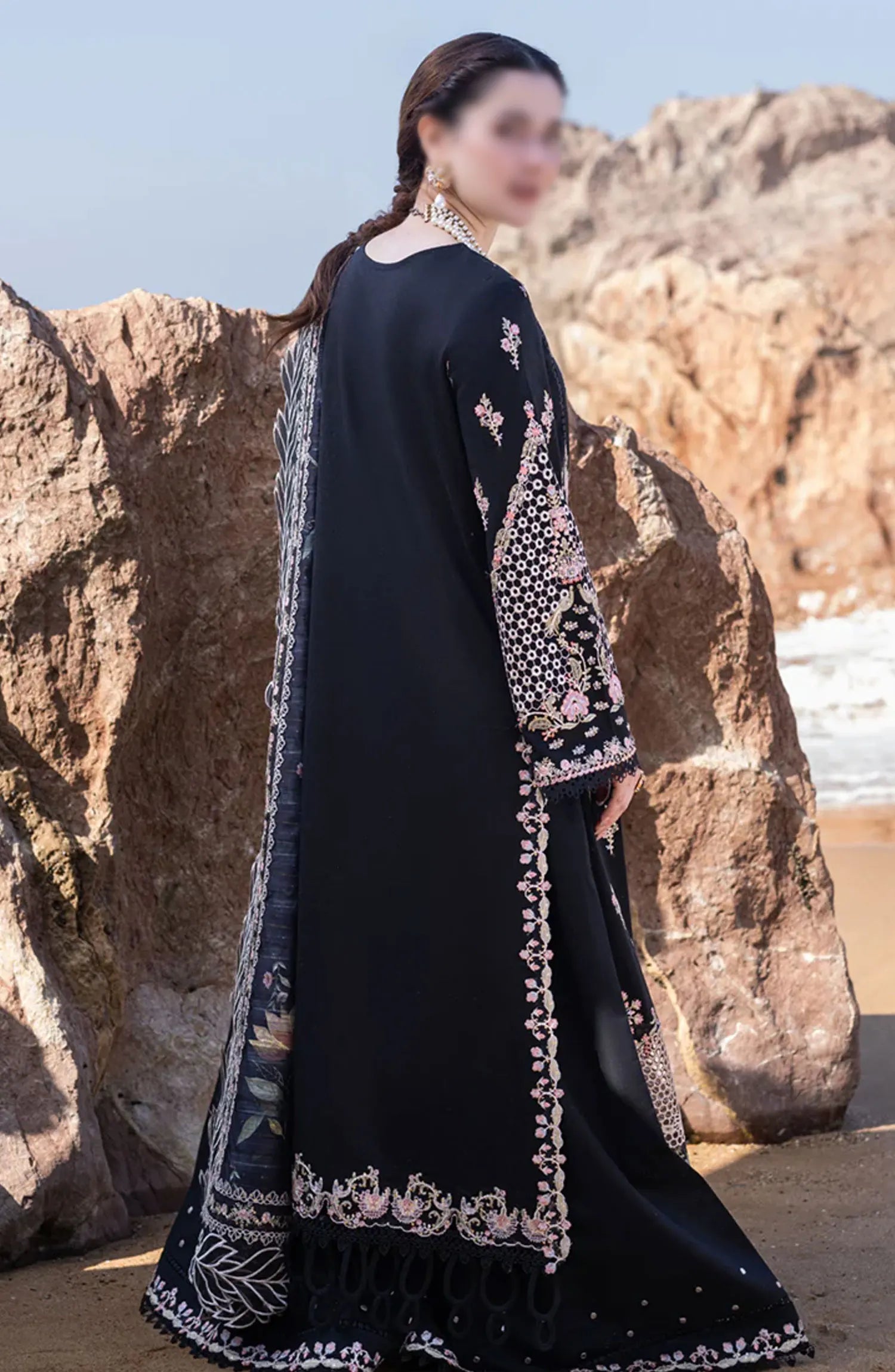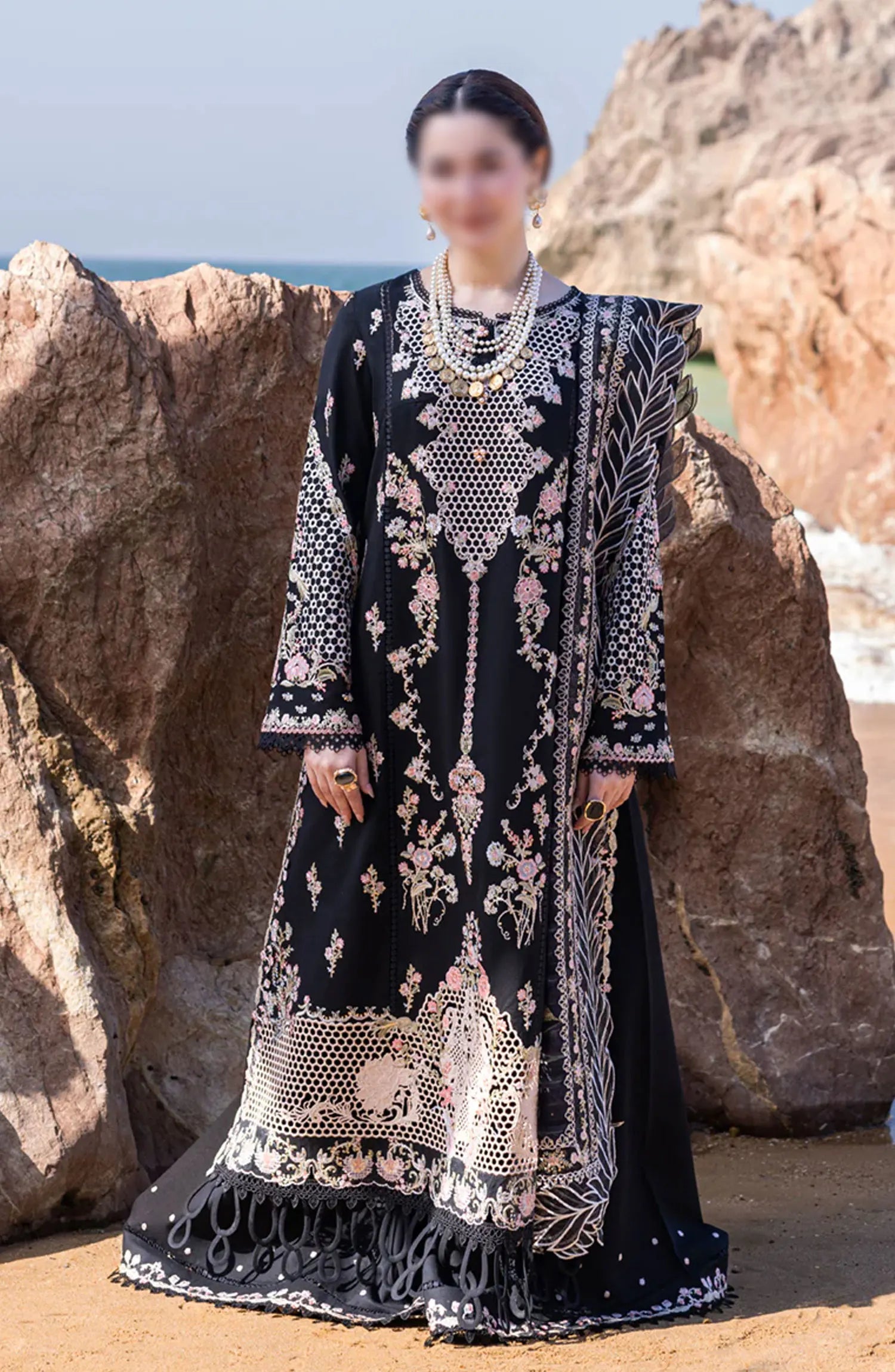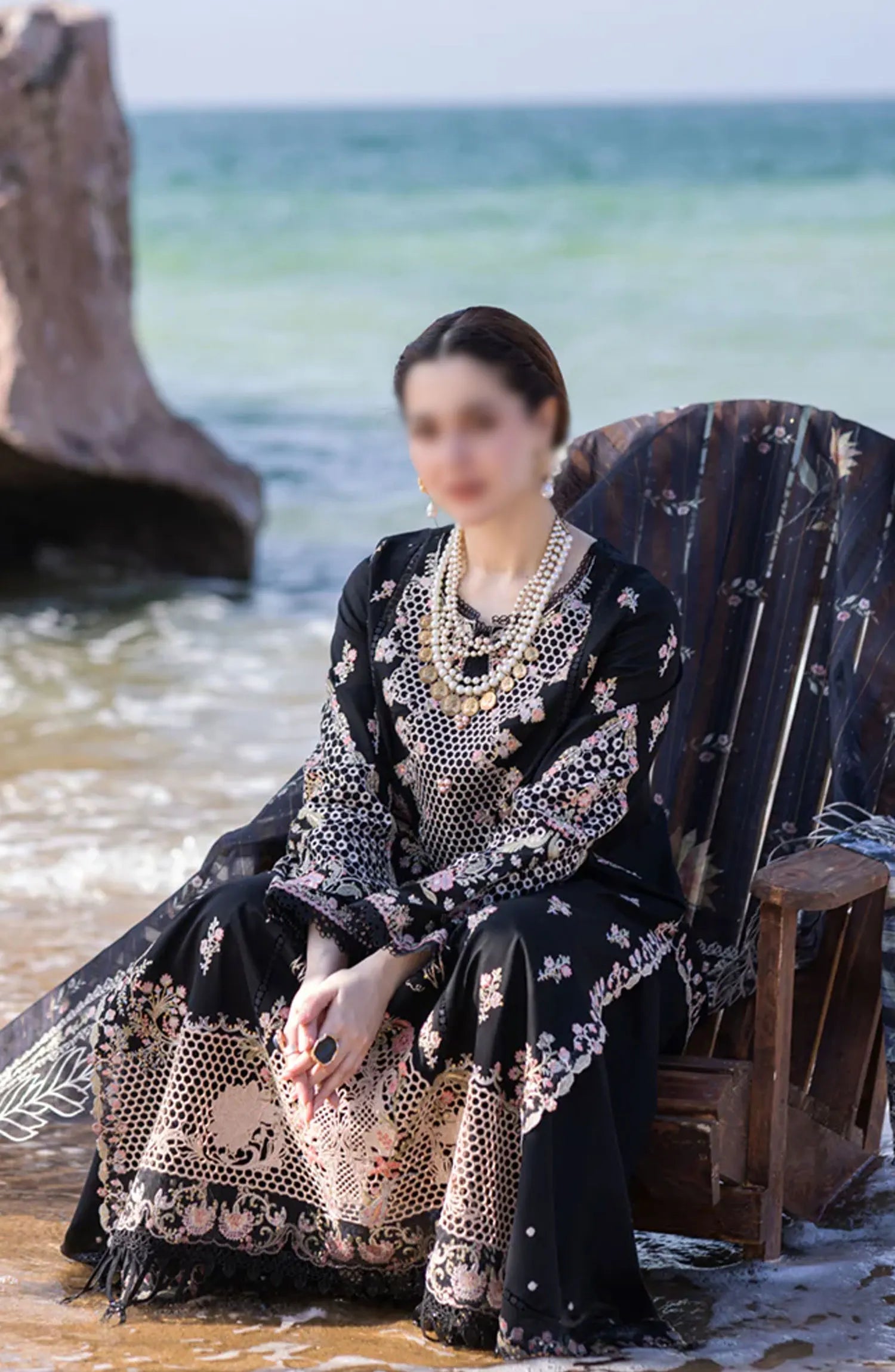 Qalamkar SAHIL KINARE Luxury Lawn Collection 2024 has been styled in the image for photography and illustrative purposes.
