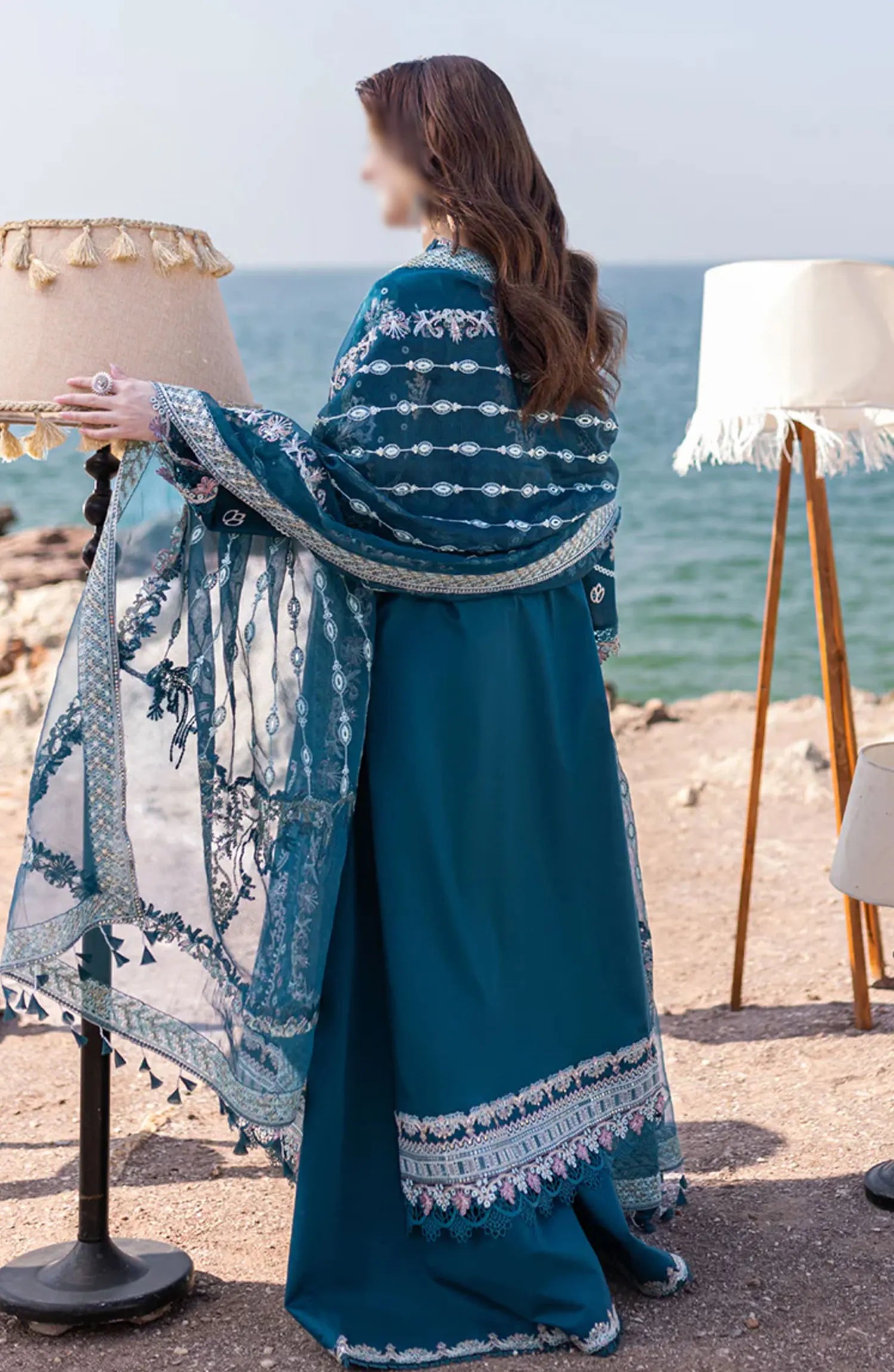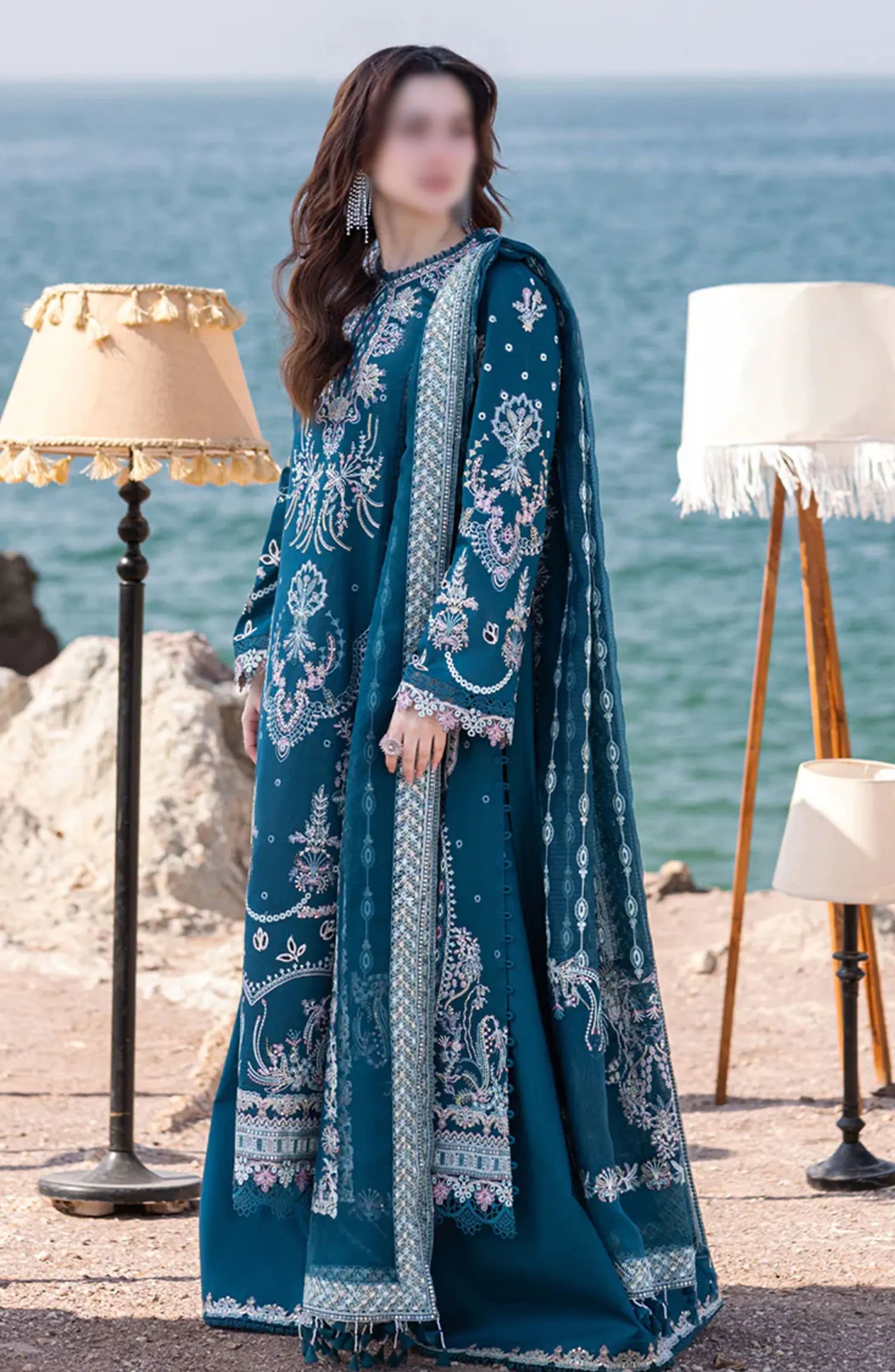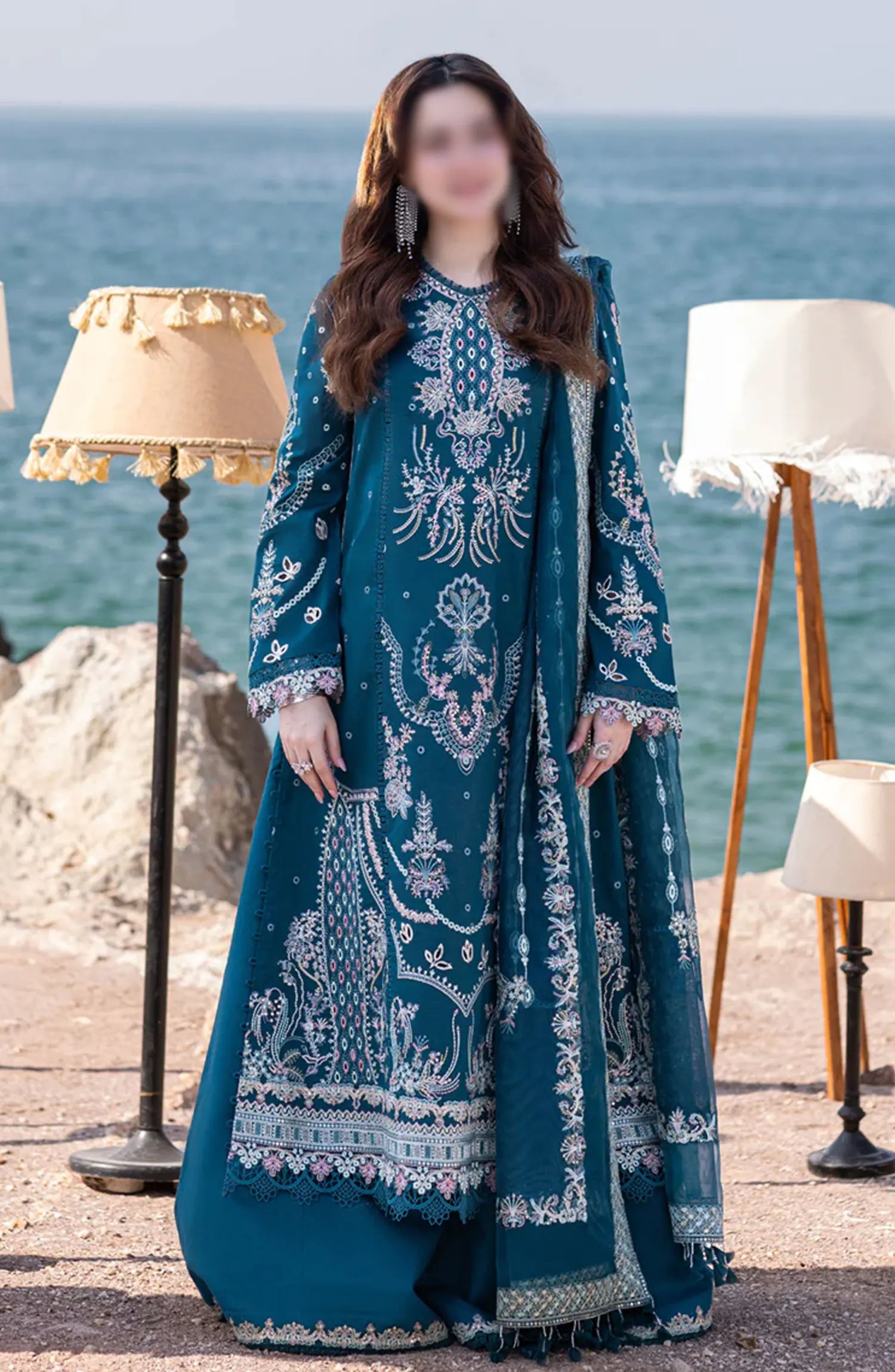 Qalamkar SAHIL KINARE Luxury Lawn Collection 2024 has been styled in the image for photography and illustrative purposes.
