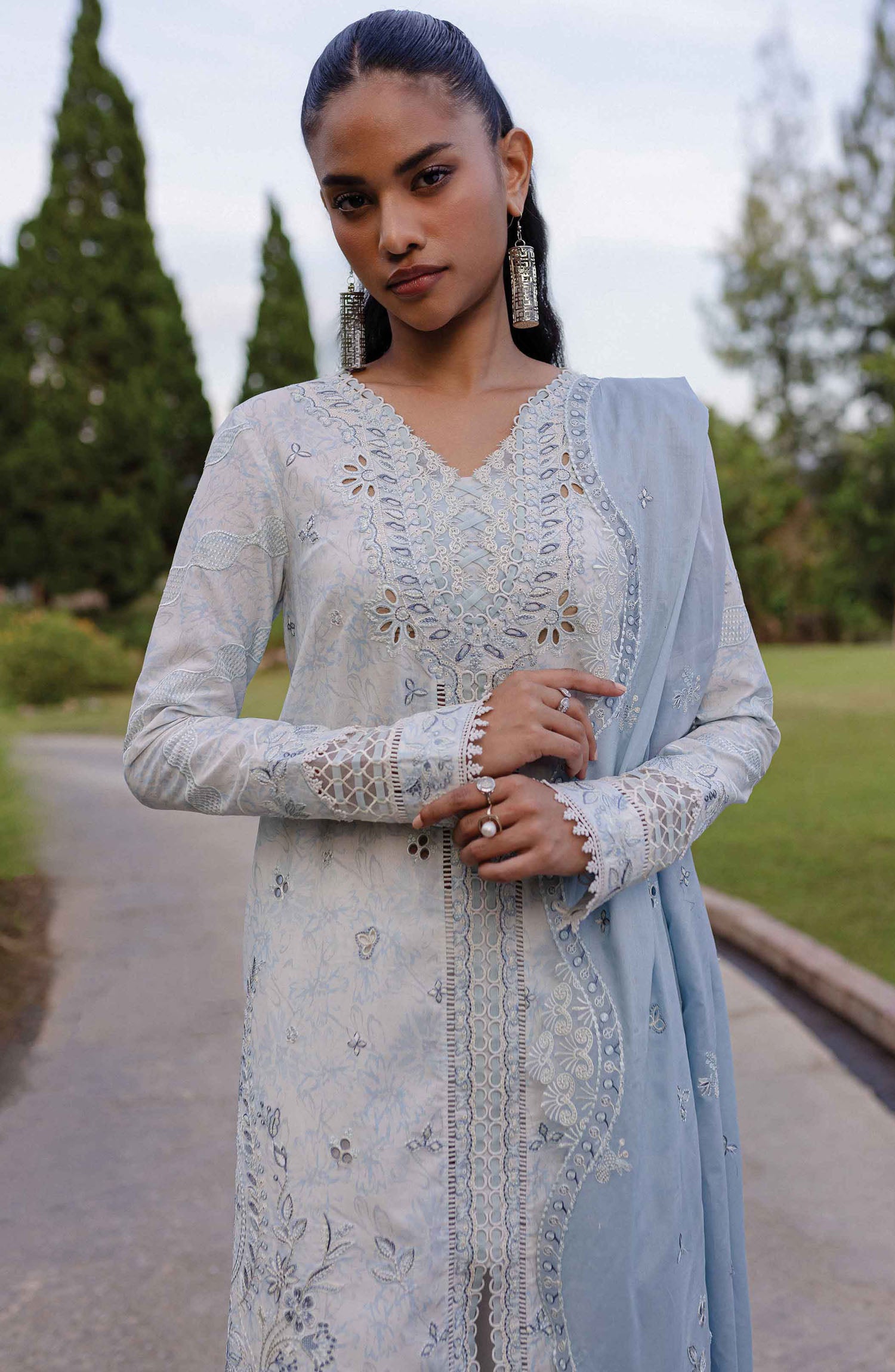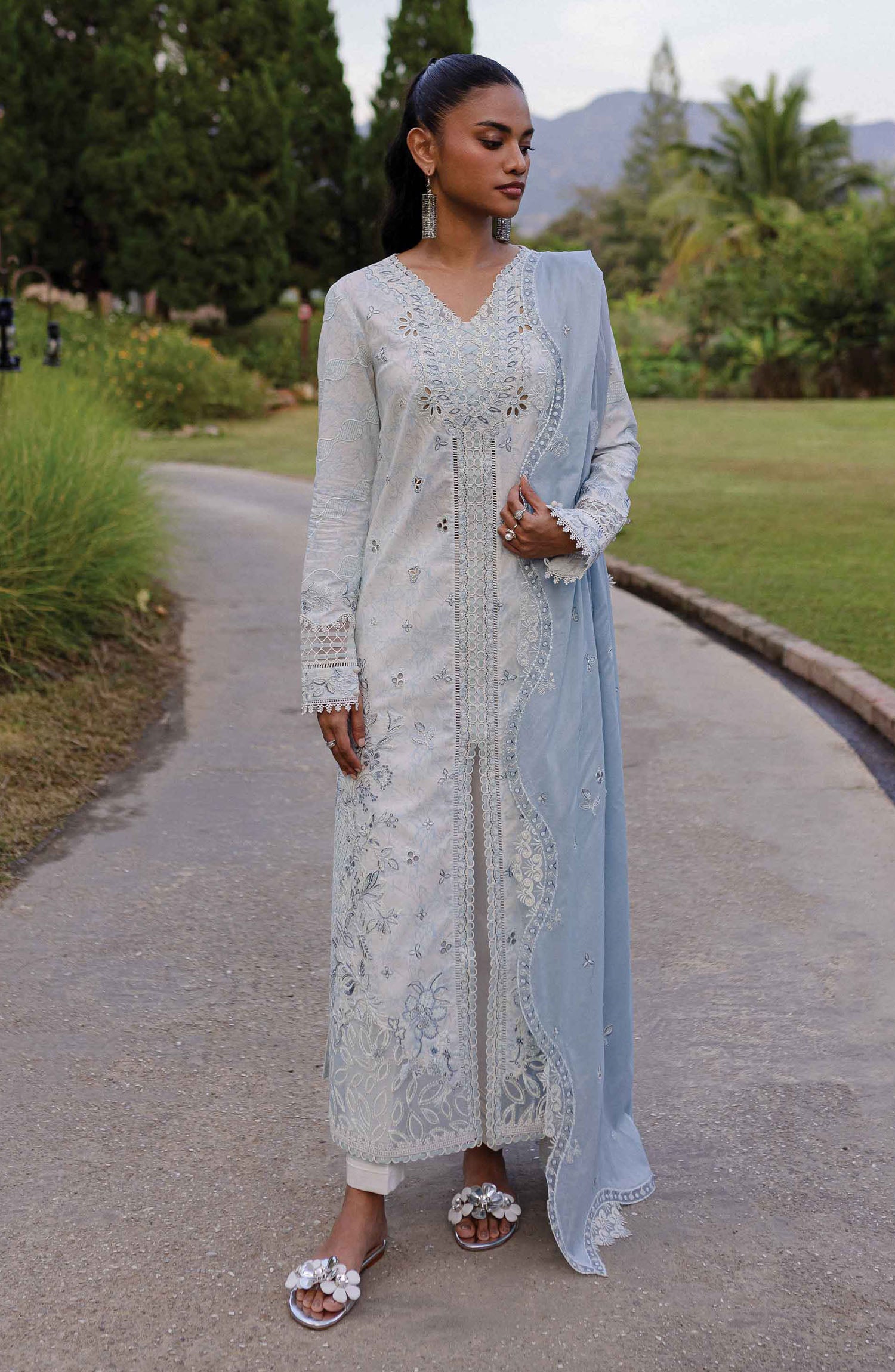 The standard style comes as a long-sleeved kameez with dupatta and trouser/shawlar.