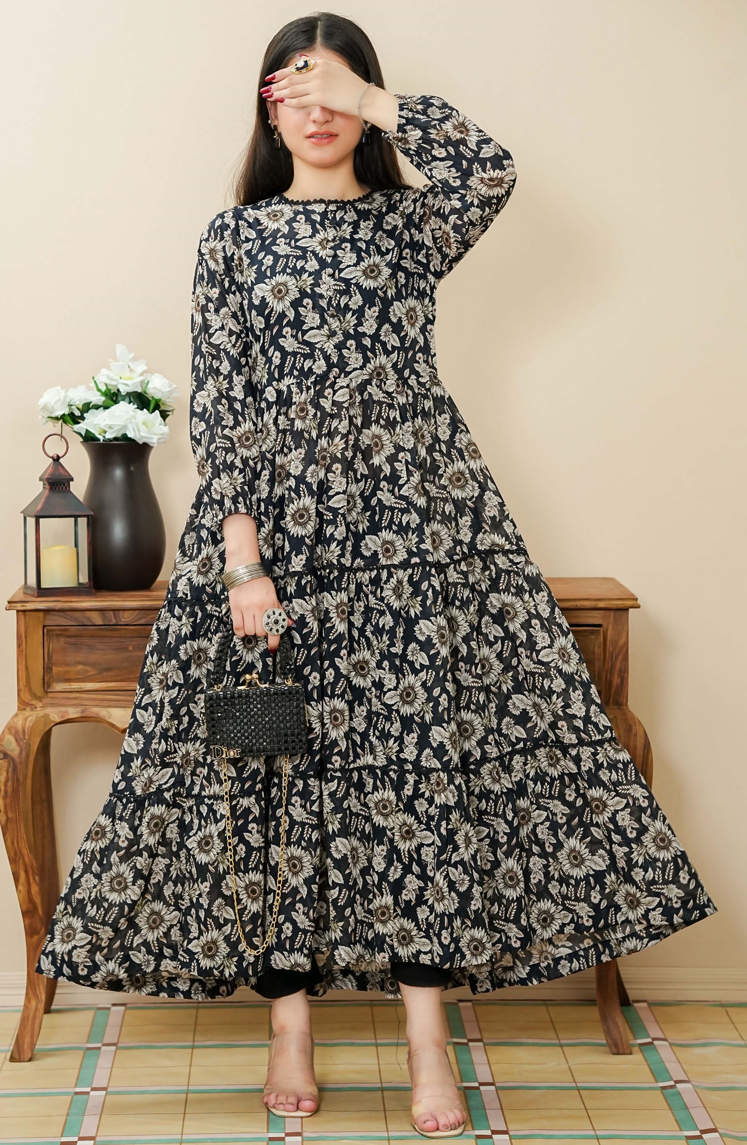 Home Quadra Floral by Amna Khadija Printed Lawn Stitched 1 Piece Frock - QFLD-15 - AM25QFL - Black - Casual Collection