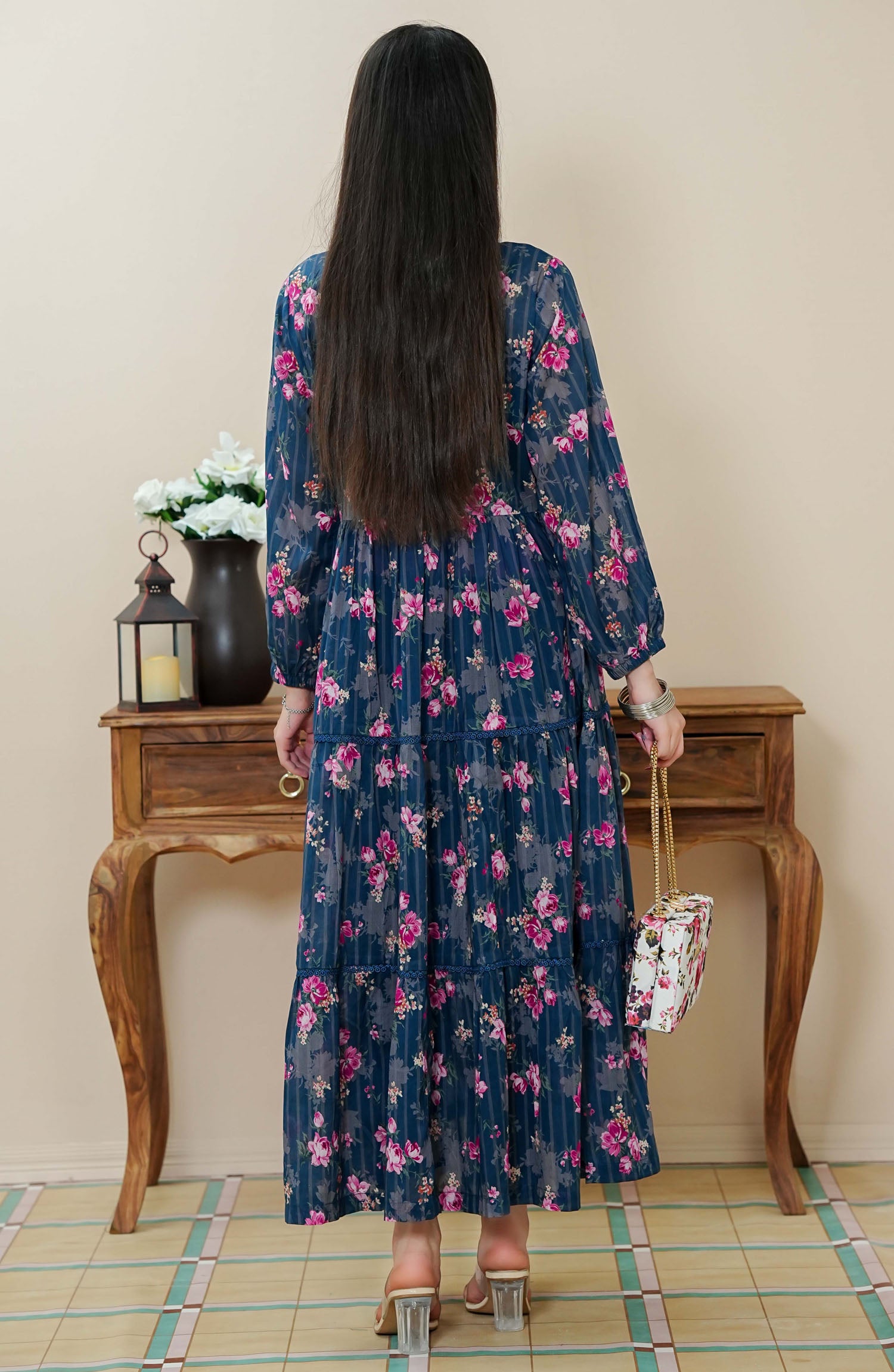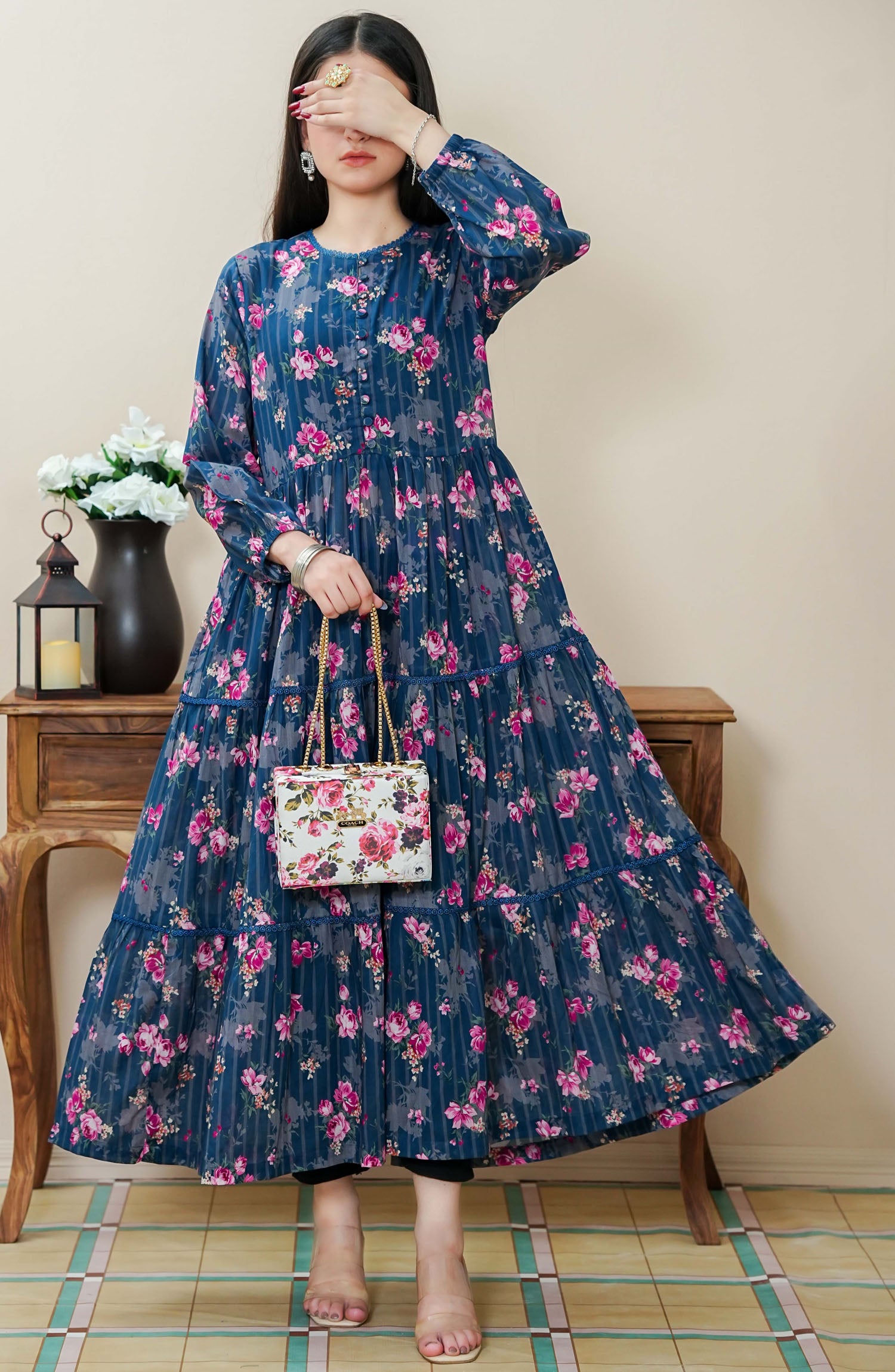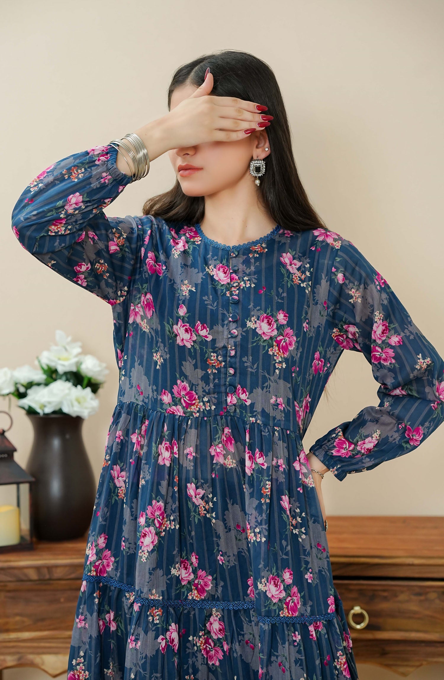 Quadra Floral by Amna Khadija Printed Lawn Stitched 1 Piece Frock - QFLD-17 - AM25QFL - Blue - Casual Collection