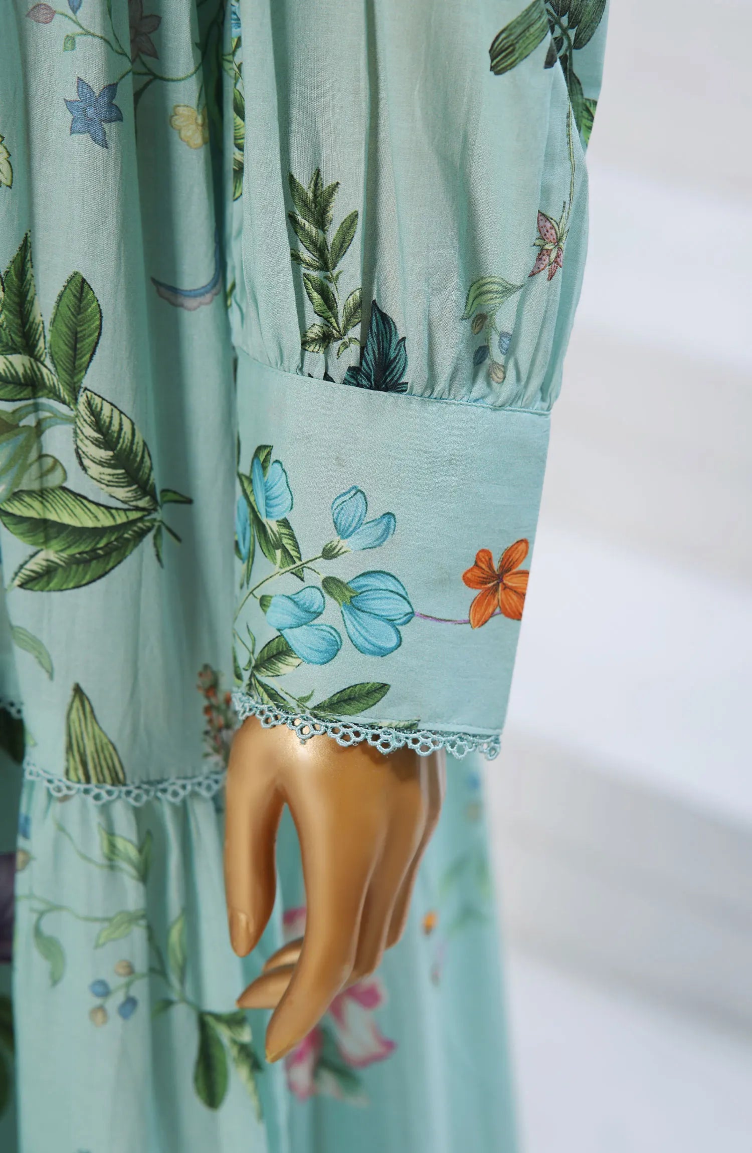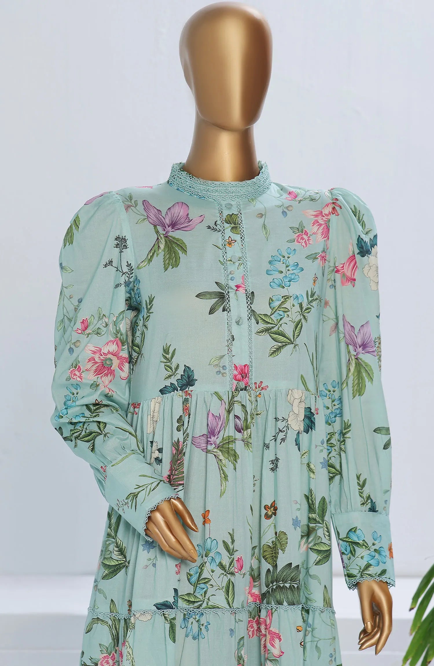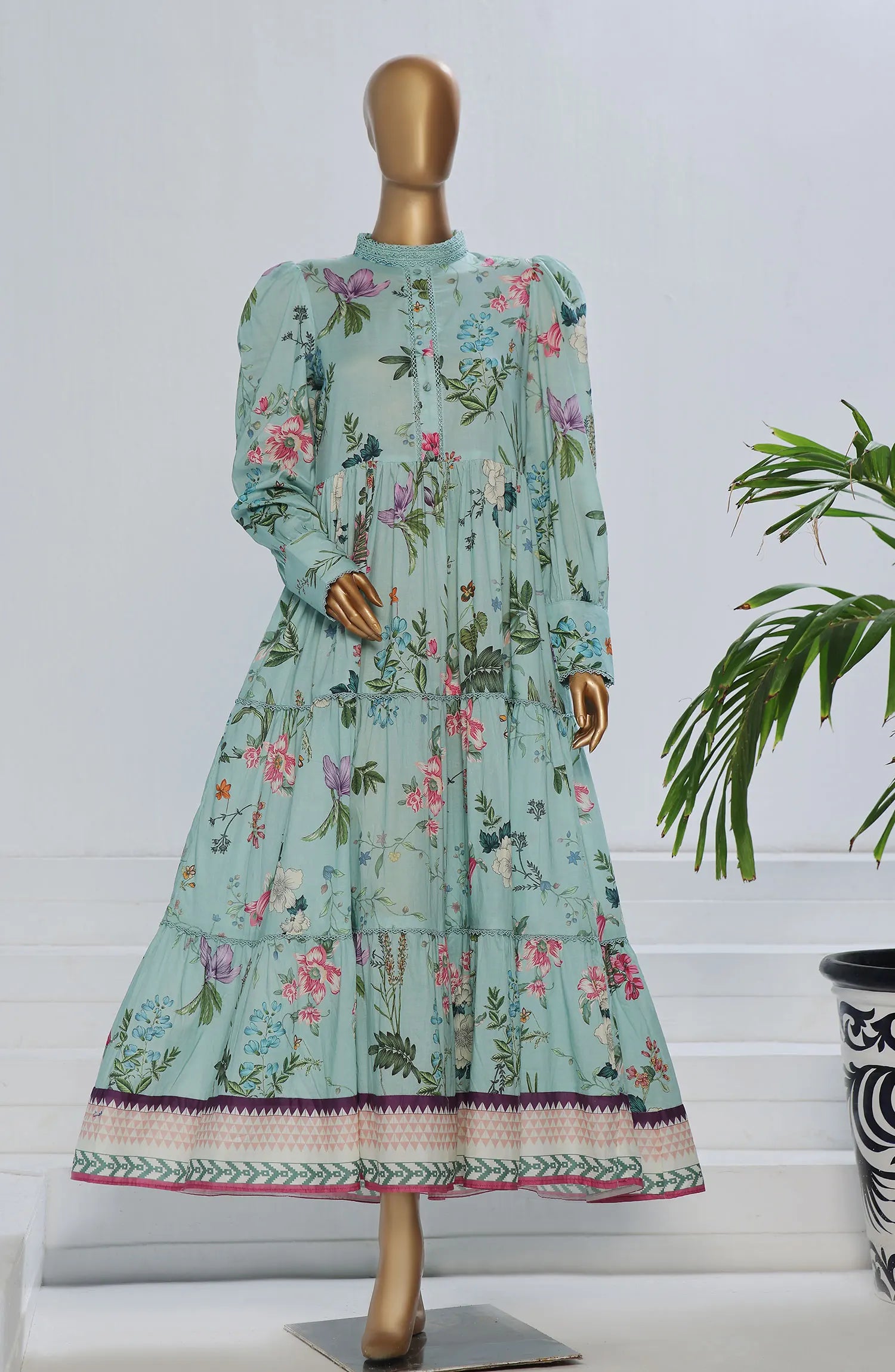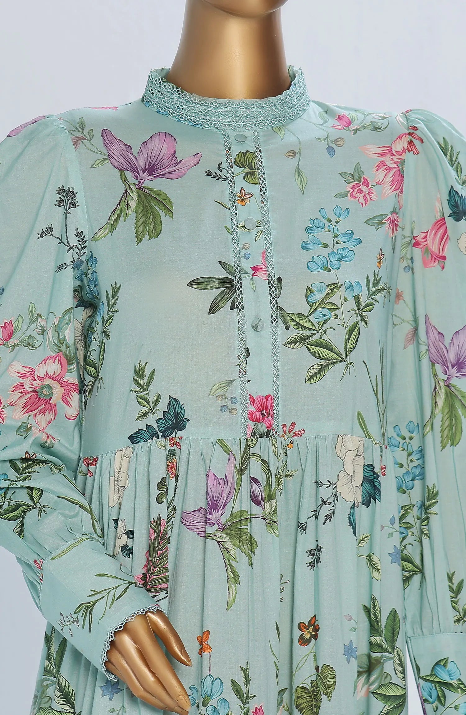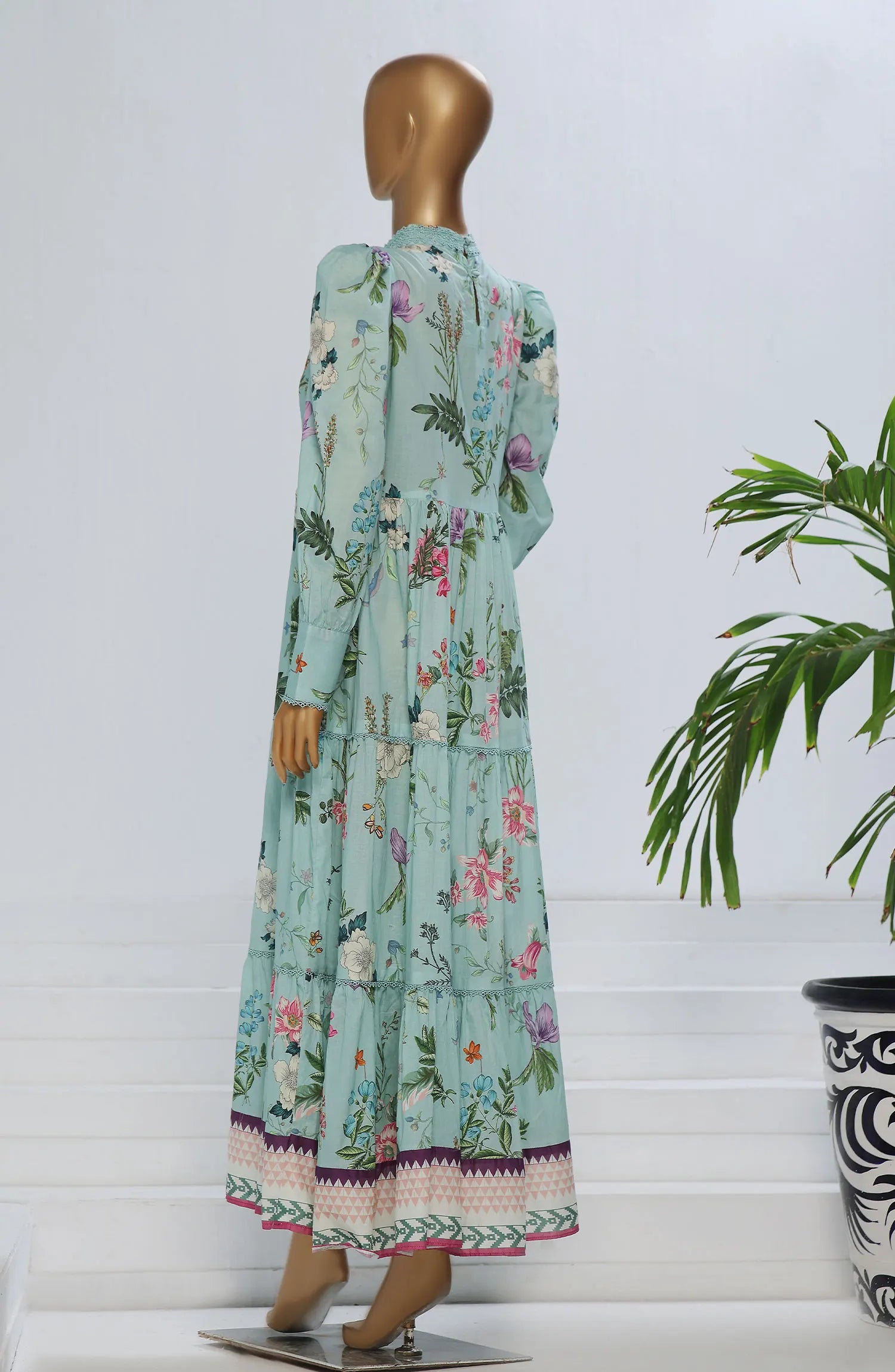 Digital Printed Exclusive Premium Lawn stitched long frock with embellishments.