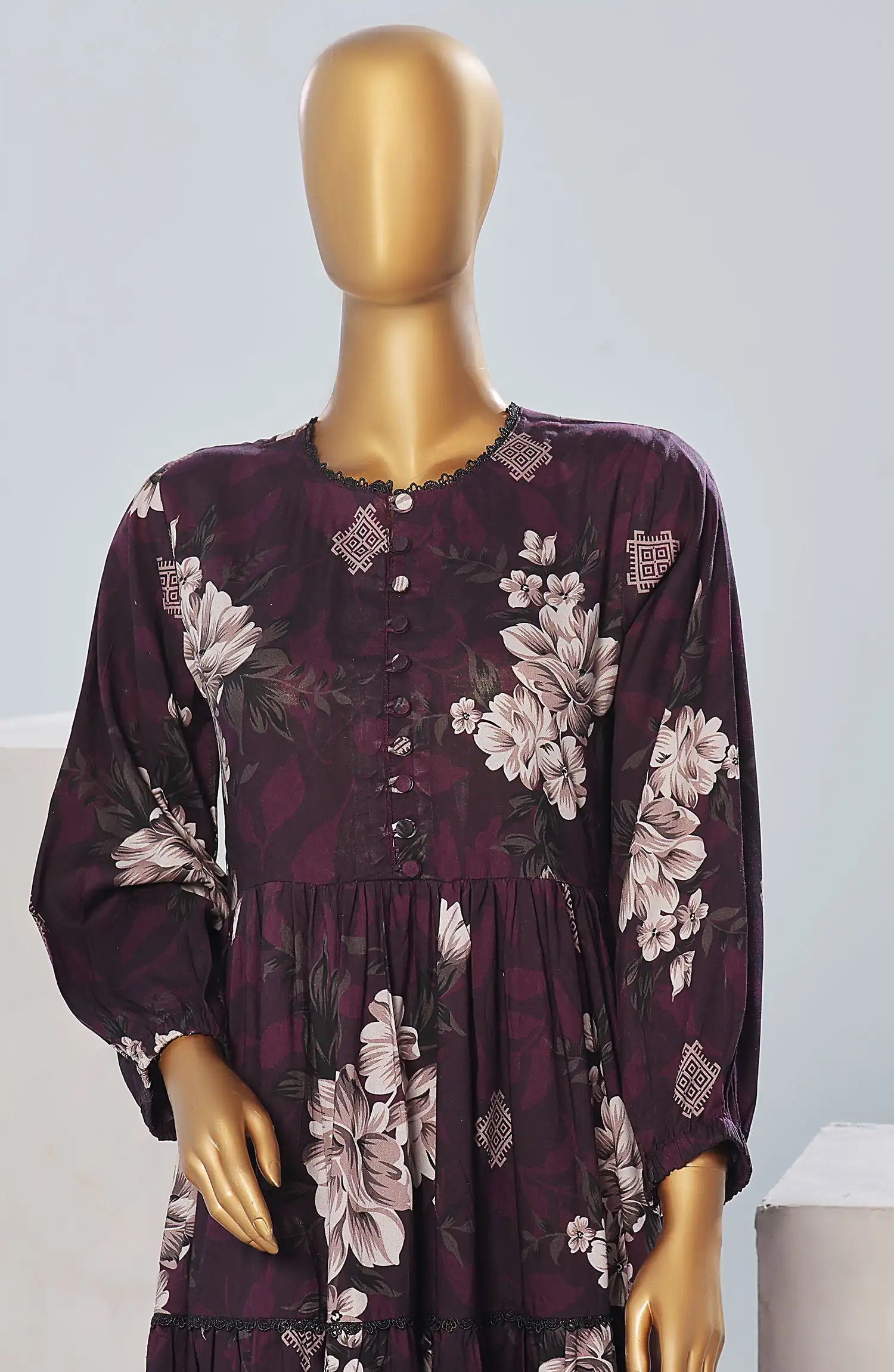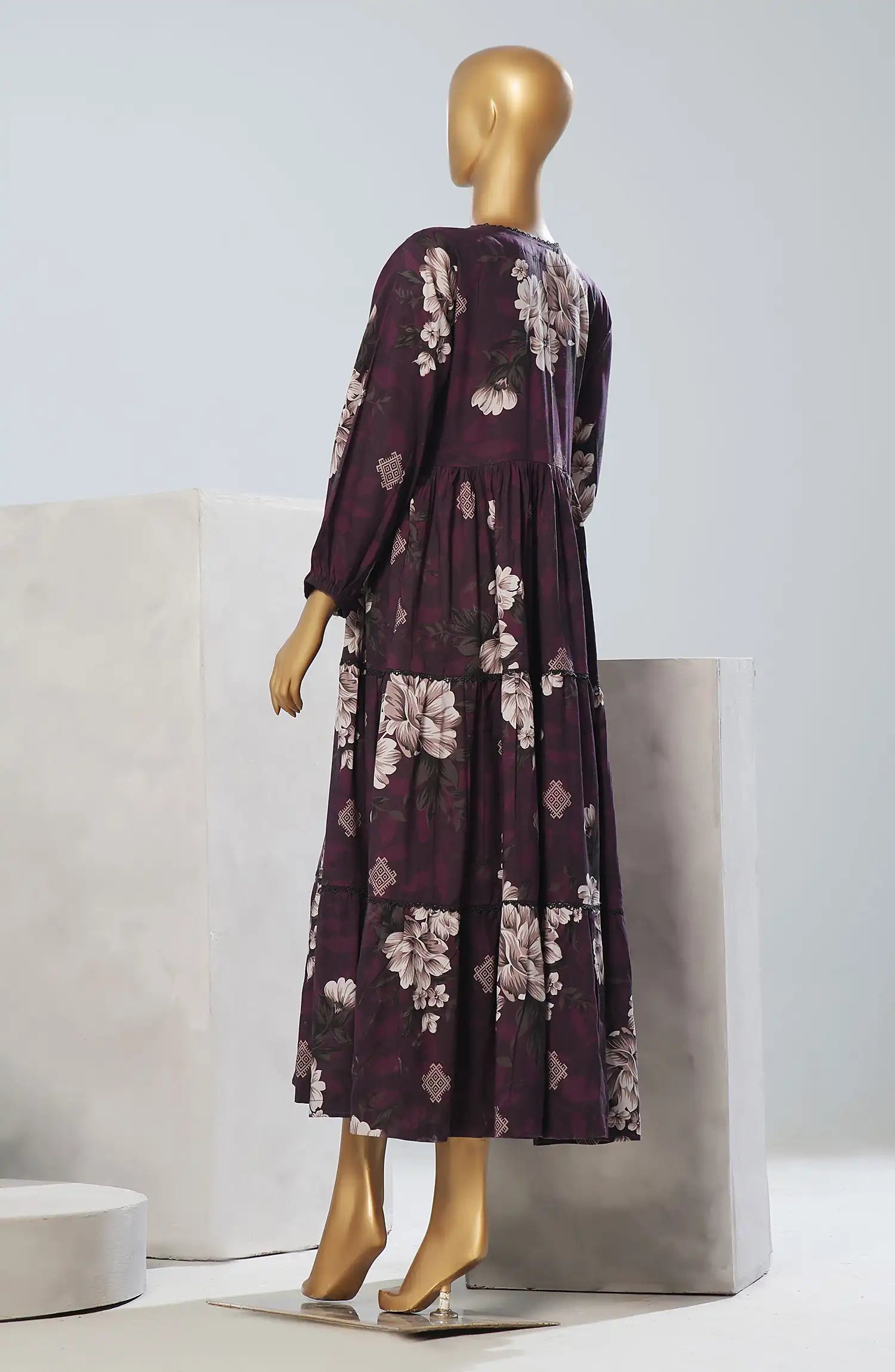 Digital Printed Exclusive Staple linen stitched long frock with embellishments.