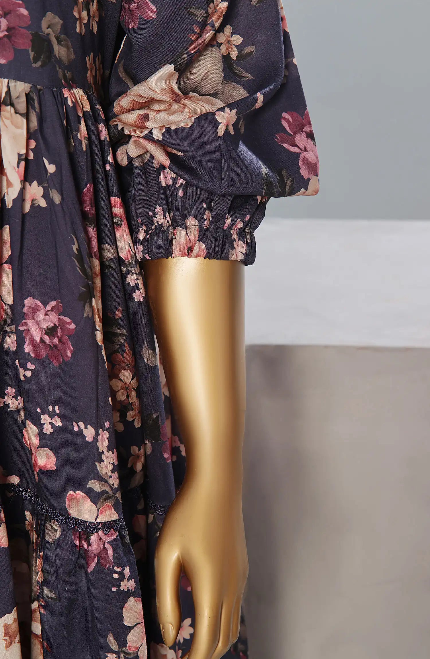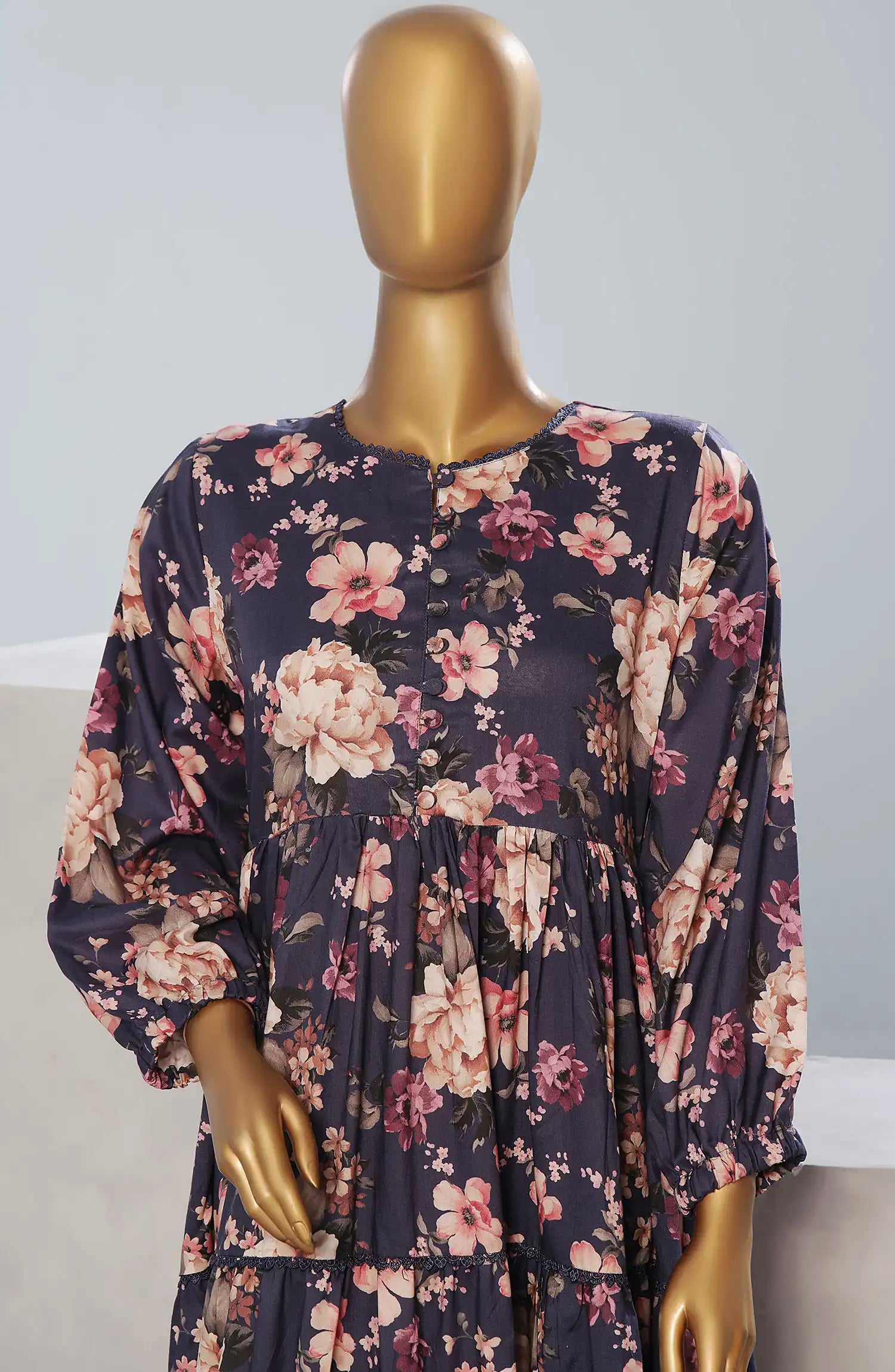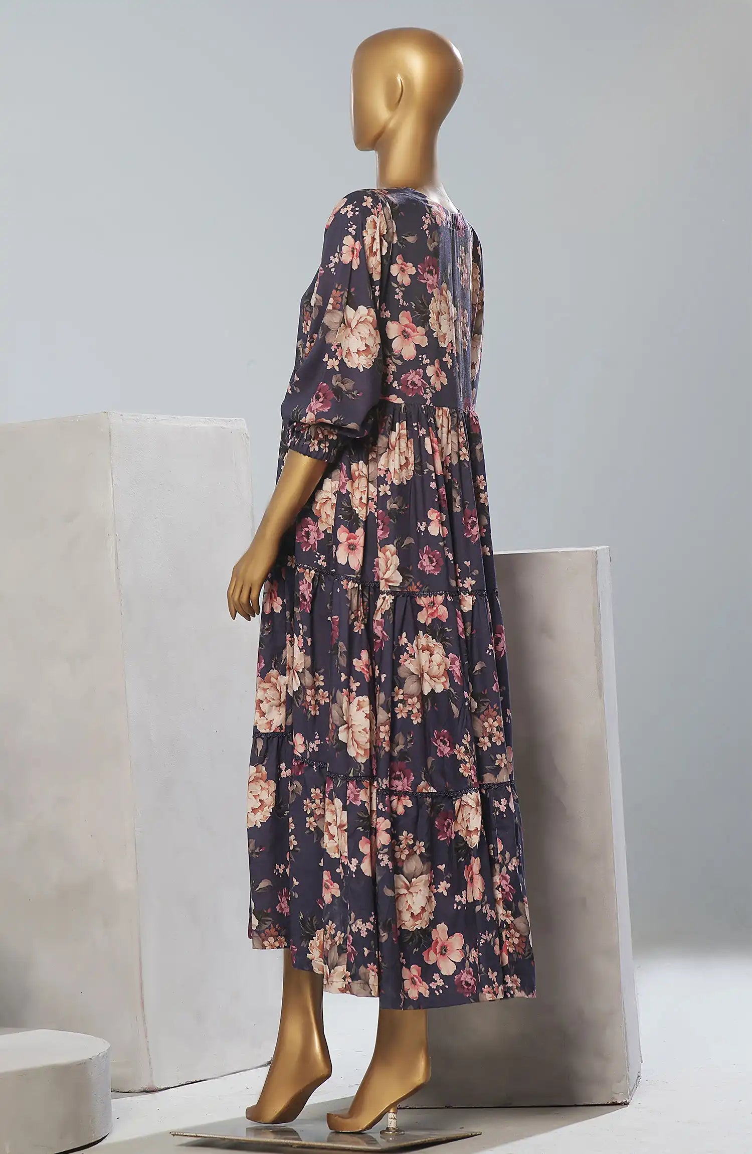 Digital Printed Exclusive Staple linen stitched long frock with embellishments.