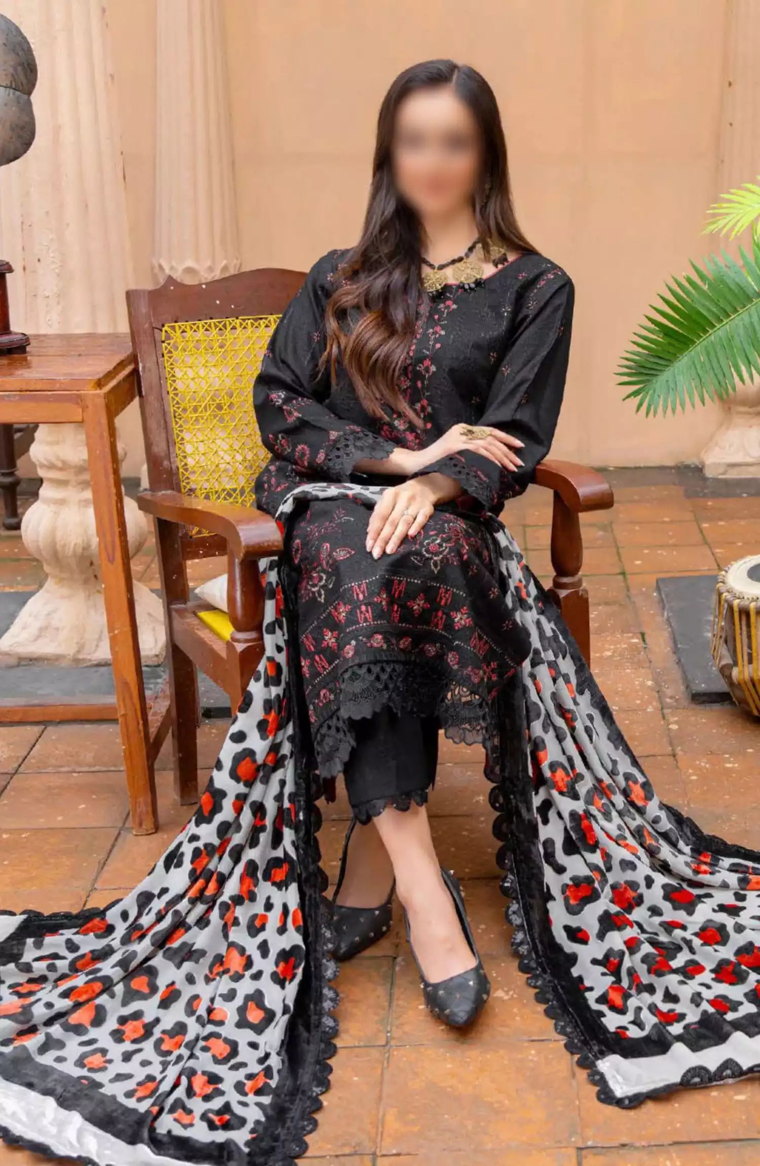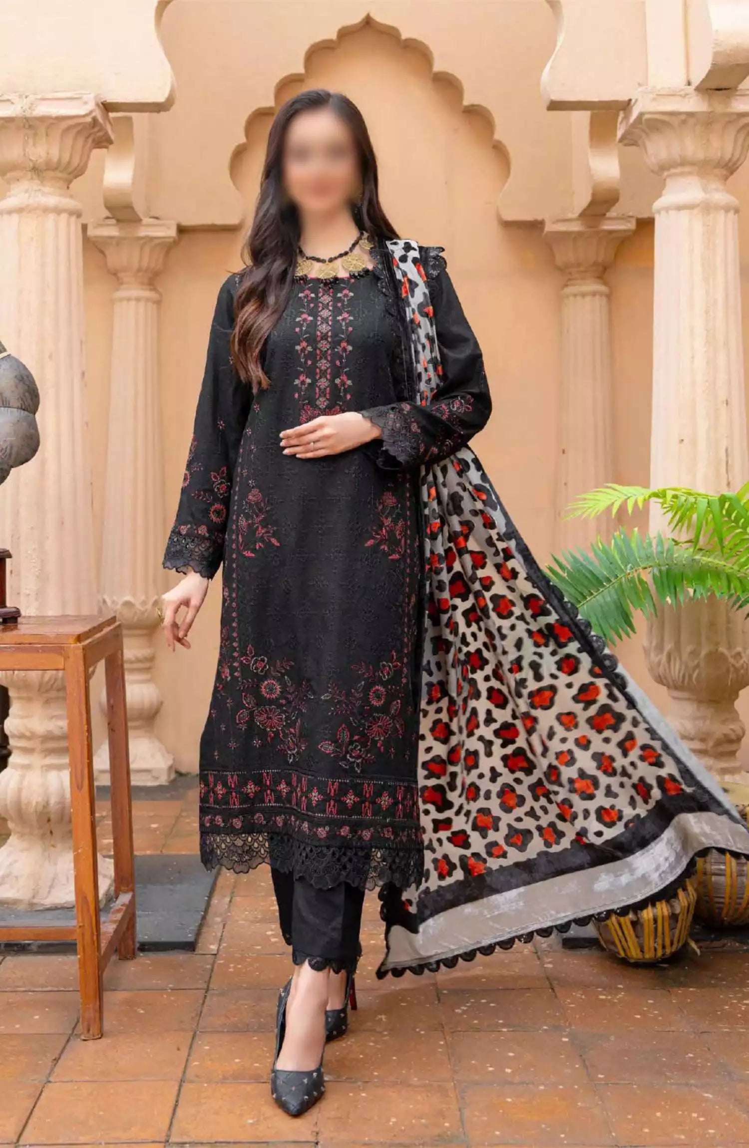 Queen Winter Palachi Shawl Embroidered Collection has been styled in the image for photography and illustrative purposes.