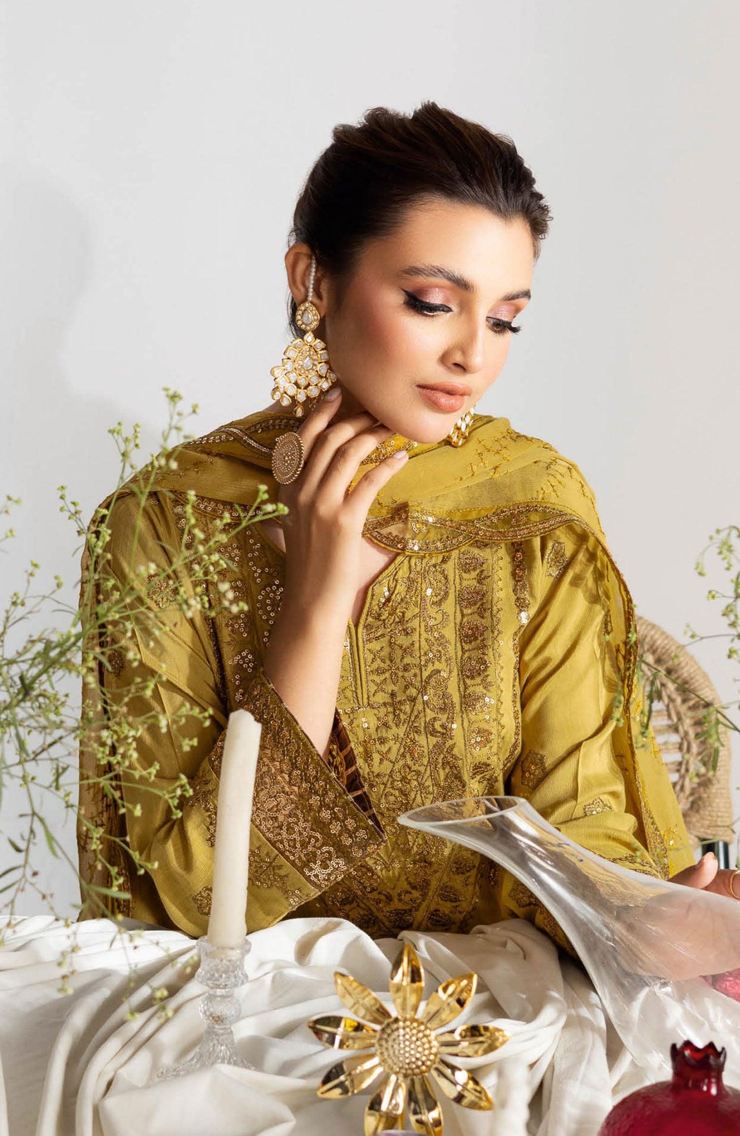 Ramsha Aangan Luxury Rawsilk Collection Vol 01 has been styled in the image for photography and illustrative purposes.