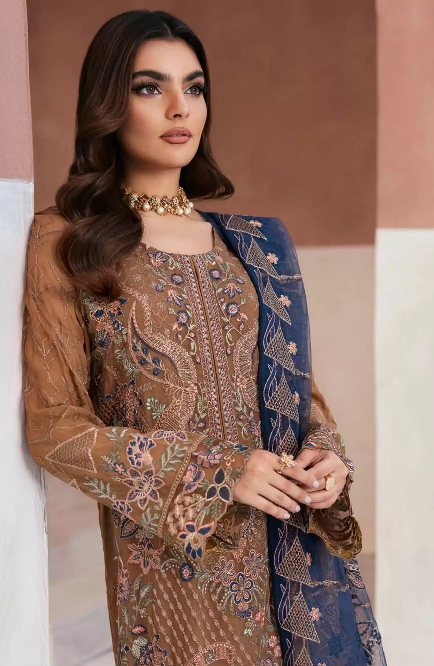 Ramsha Arzoo Chiffon Collection Vol 01 has been styled in the image for photography and illustrative purposes.
