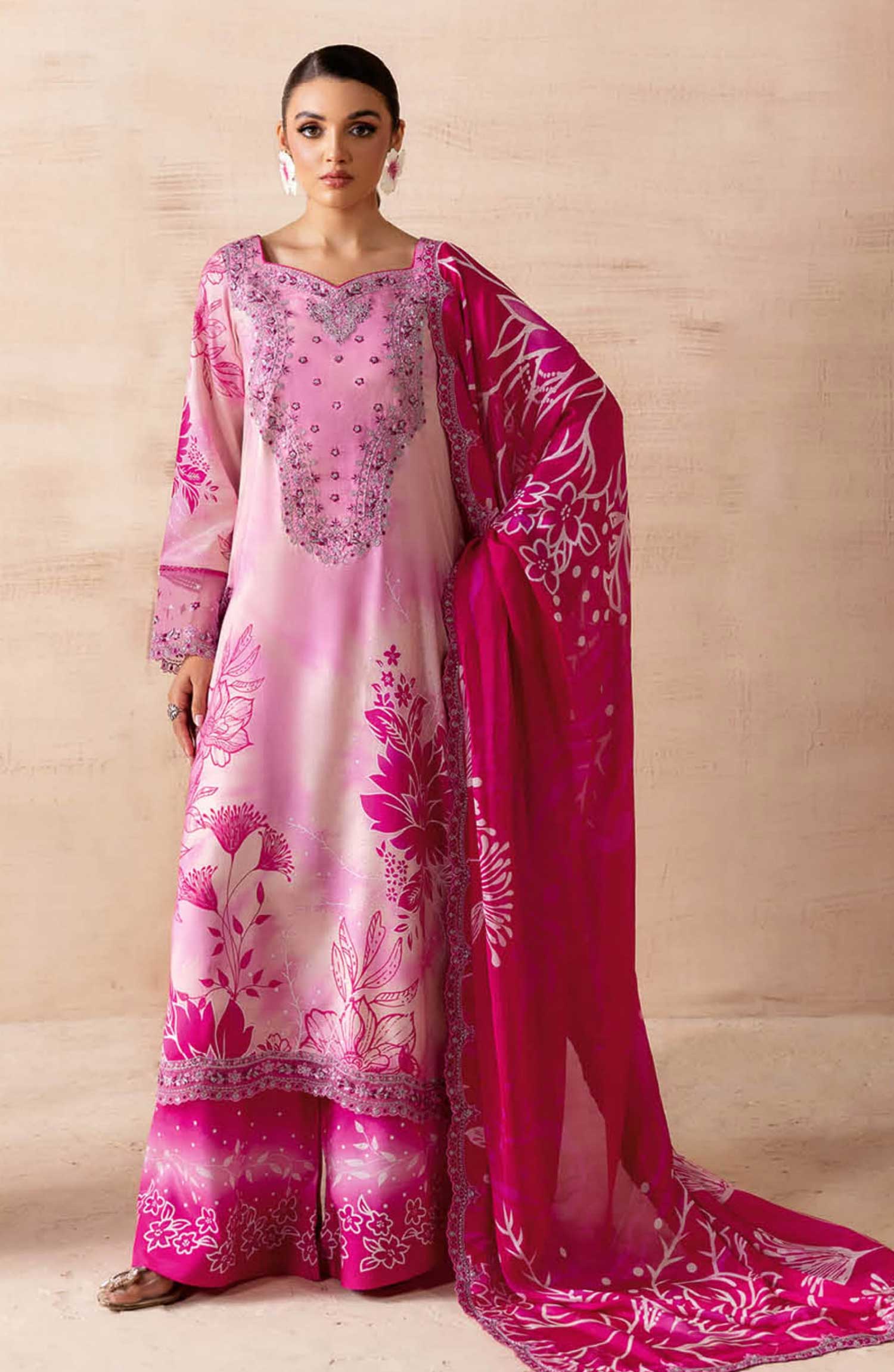 Shanzey Printed Cambric Stitched 3 Piece Suit - SHK-4906 - SHZ25CAM - Shocking Pink - Girls Winter Collection