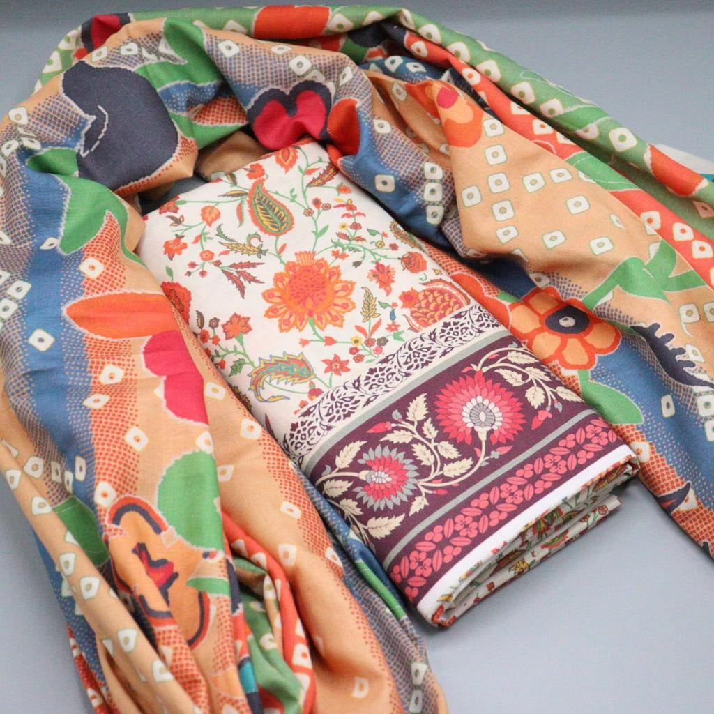 Modest Printed Cotton Stitched 3 Piece Suit - 9705-Wht - MOD25PRF - White - Festive Girls Collection