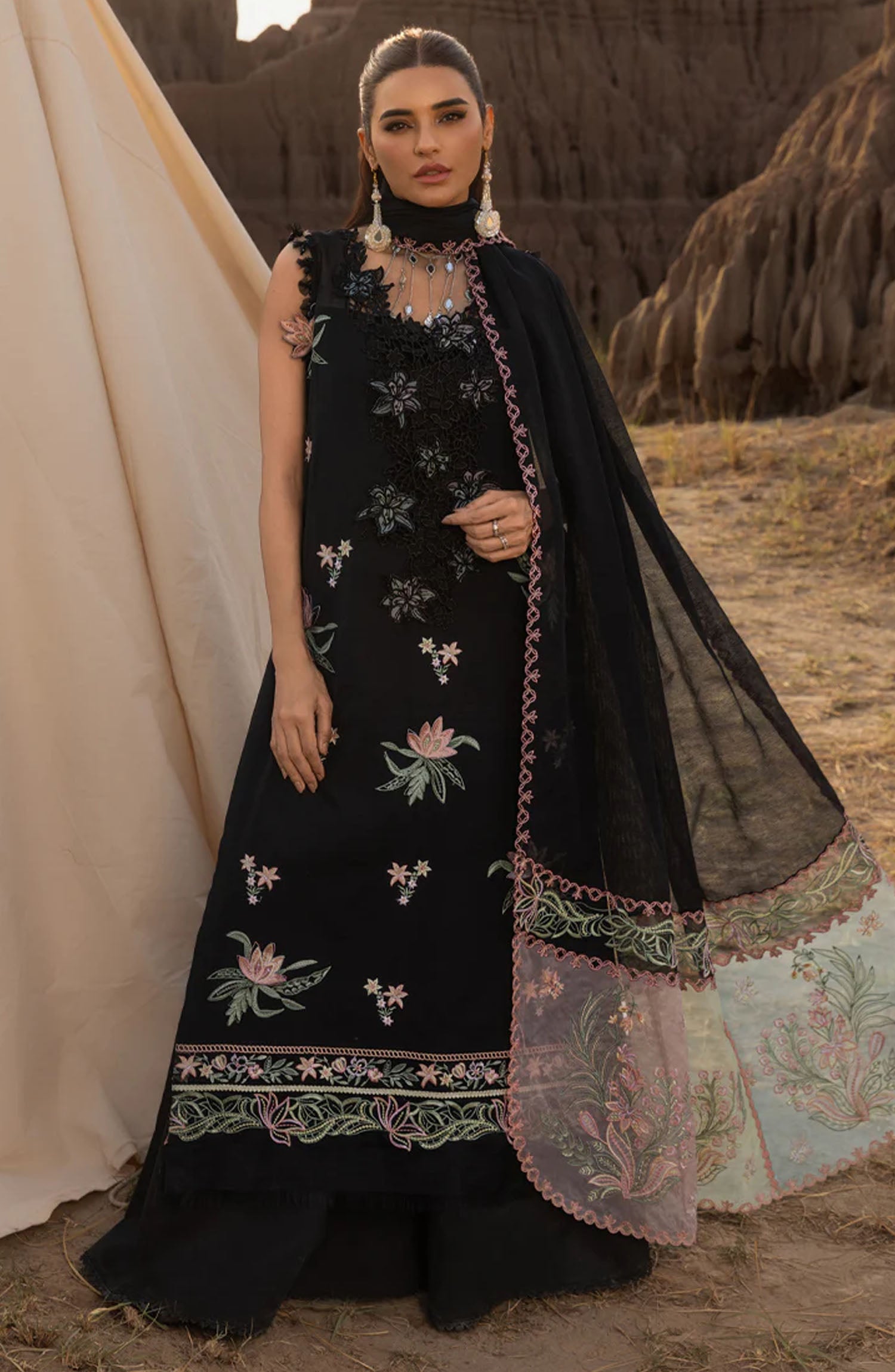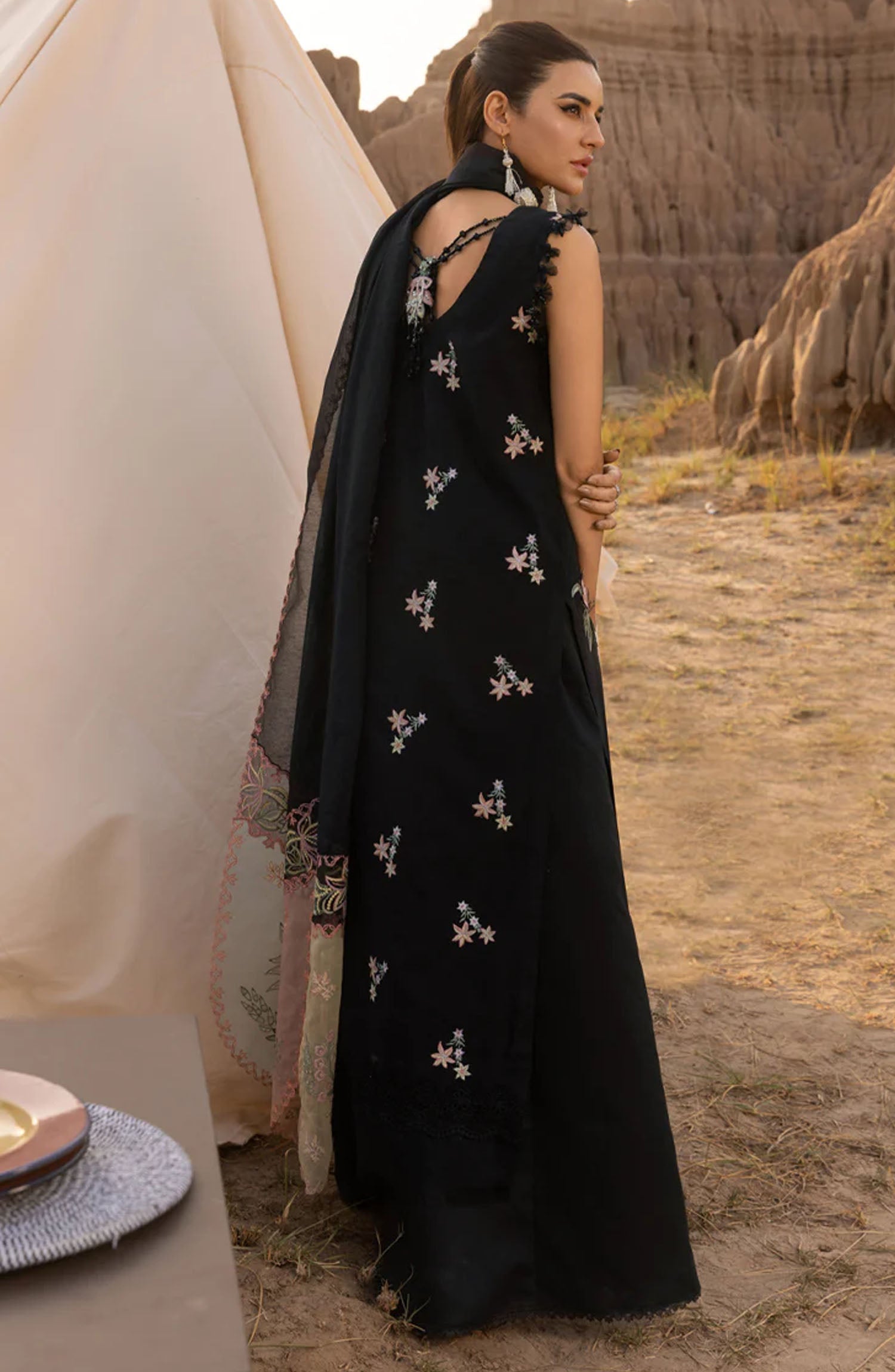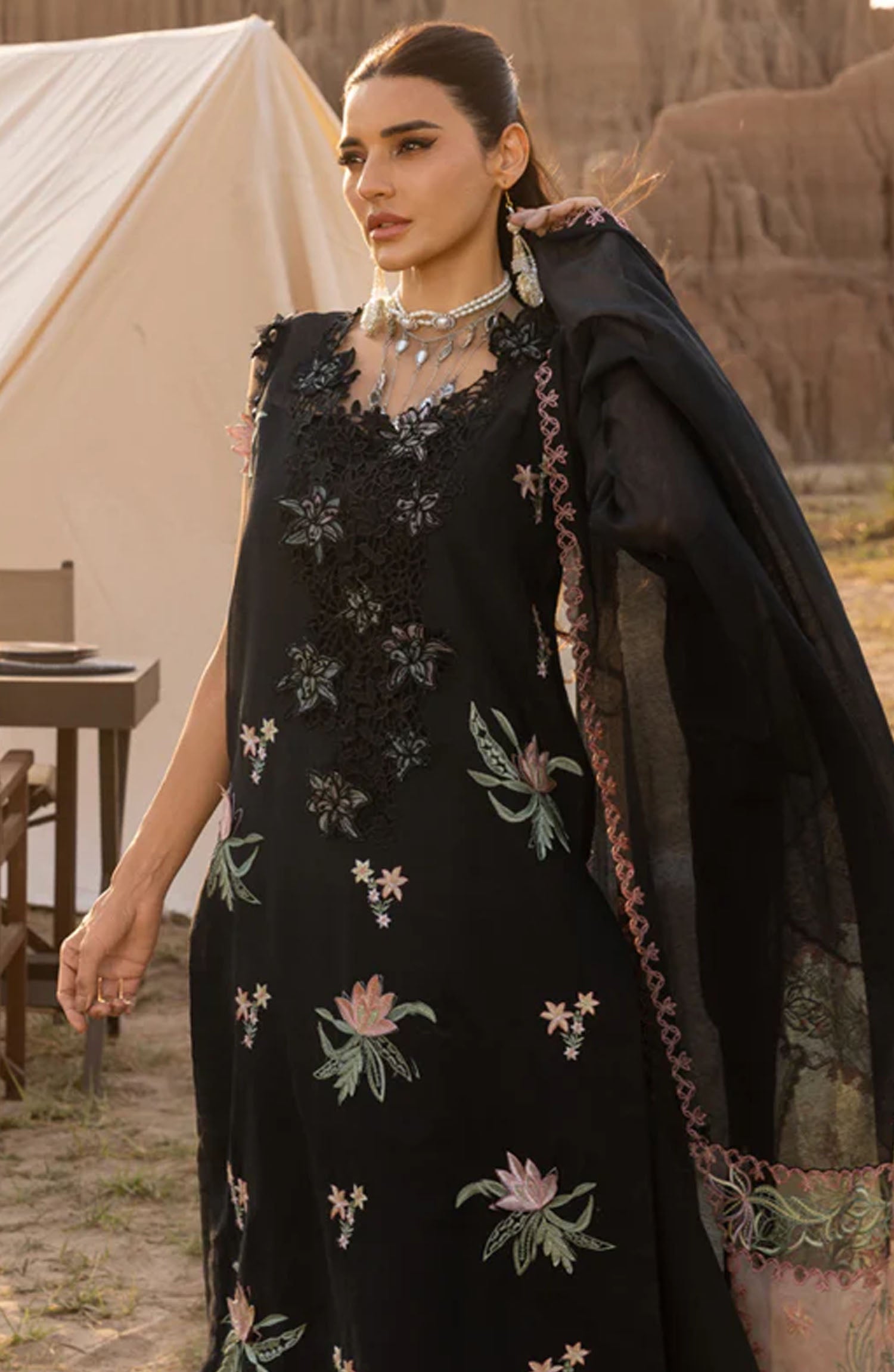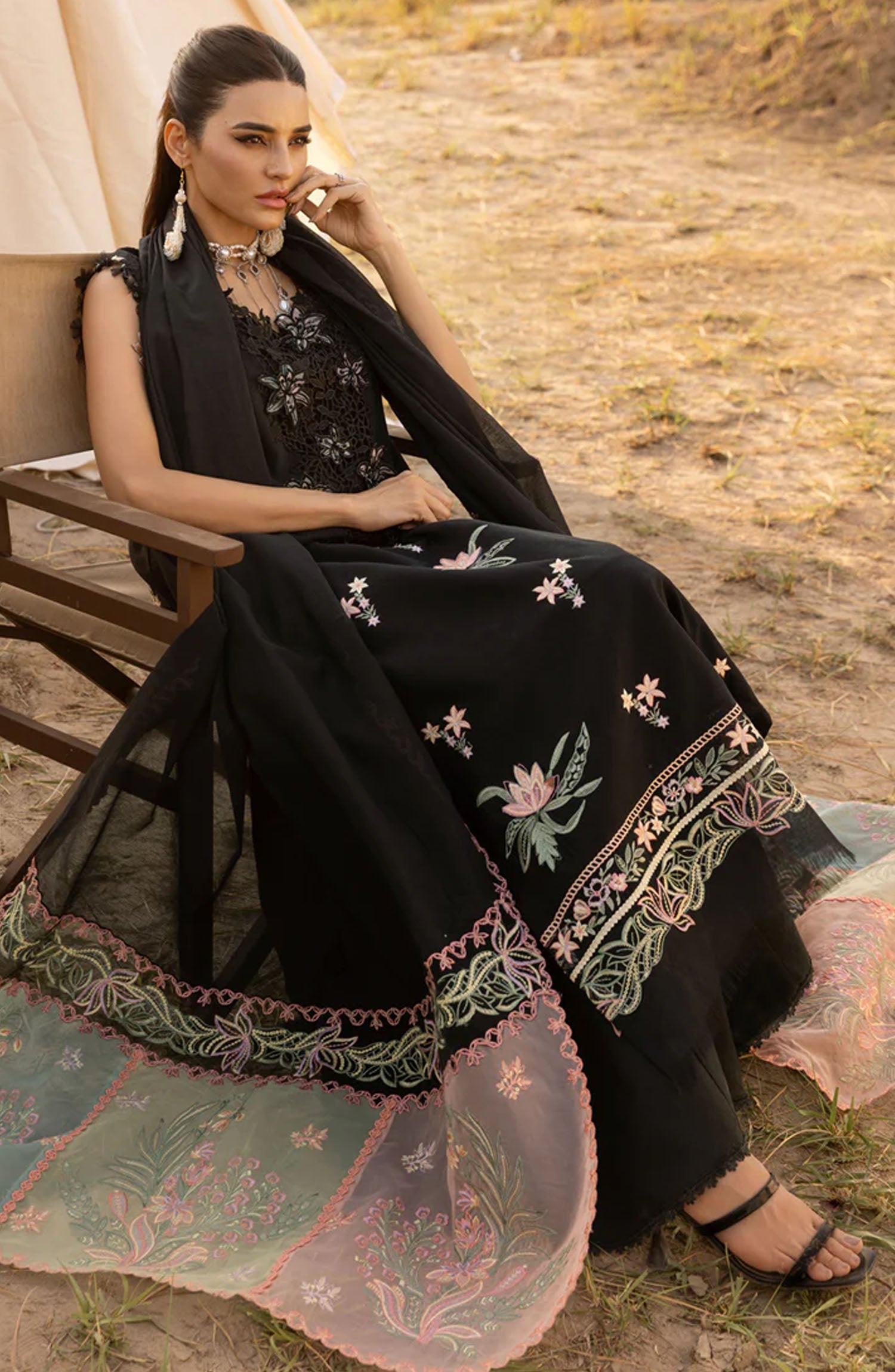 Dyed Black Organza Embroidered Neck 3D Flowers 02 Pieces