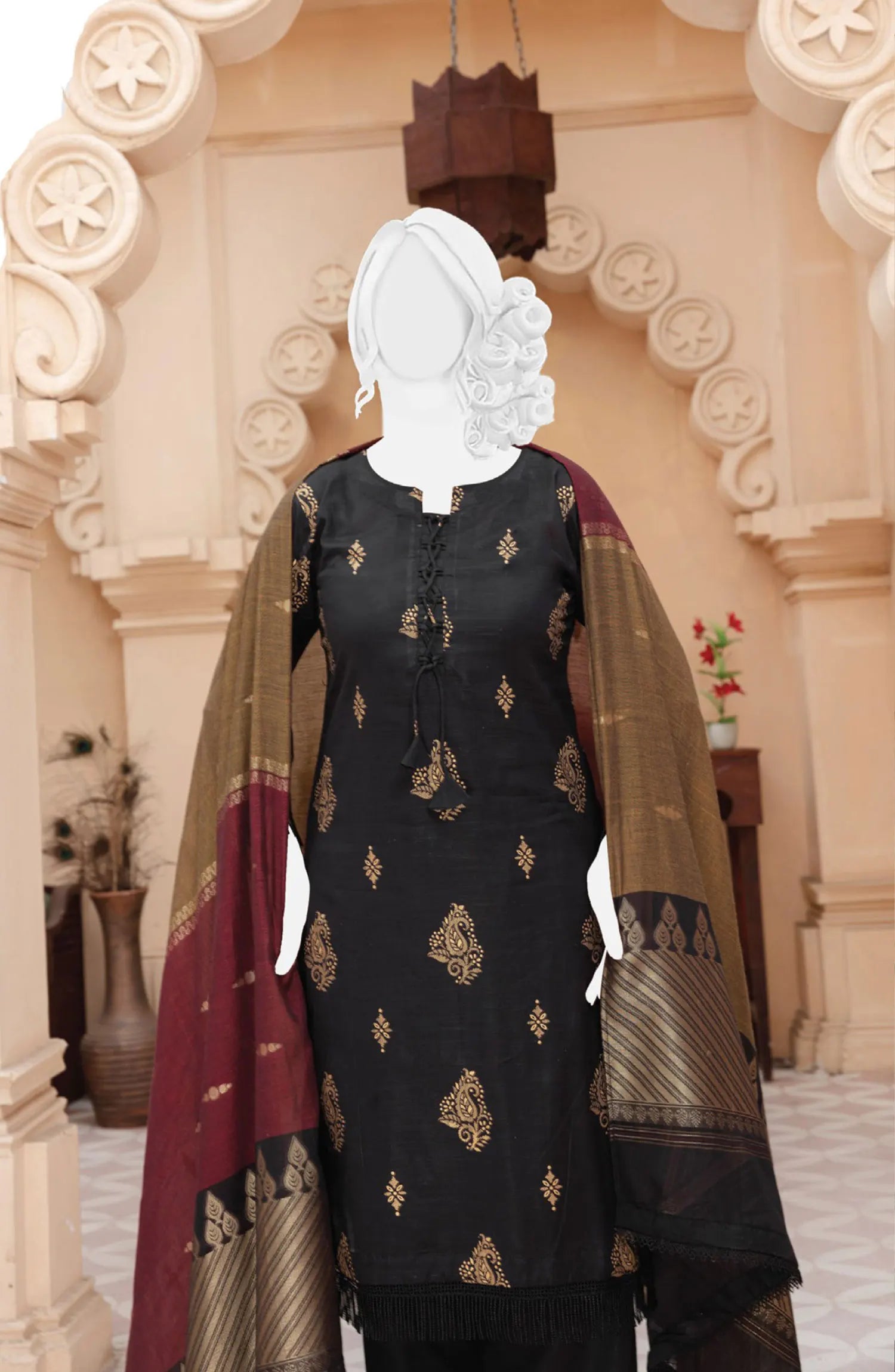 The standard style comes as a long-sleeved kameez with dupatta and trouser/shawlar.