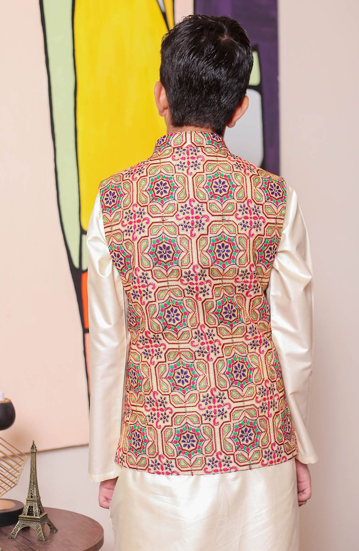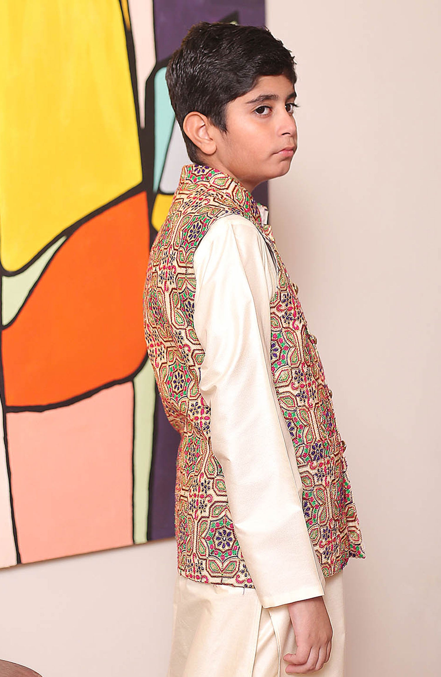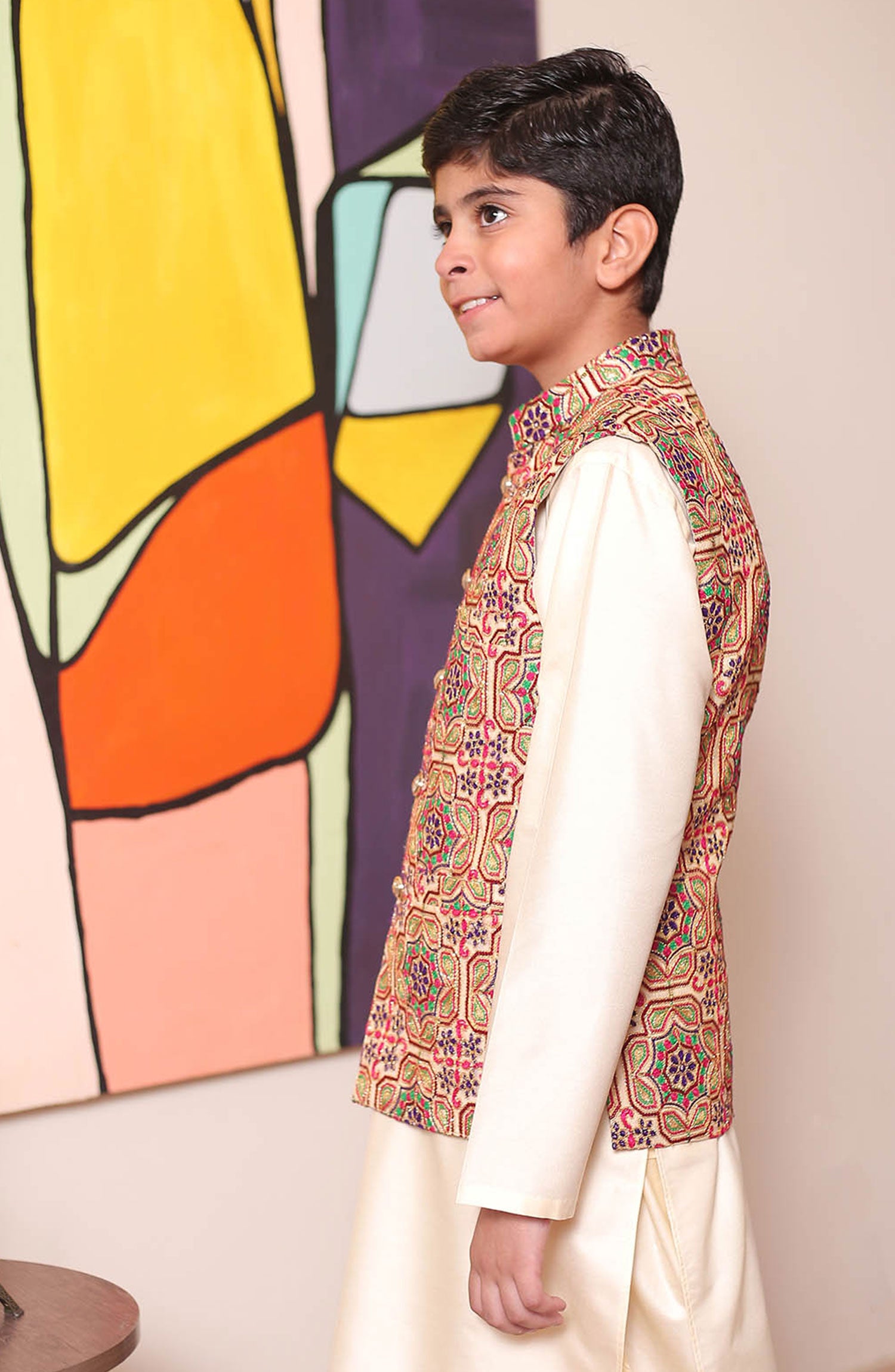 Formal Style Waist Coat for Kids , Jamawar Fabric in Multi Colour and Rich Zari in Weaved Design , Special for Festive And Wedding Wear