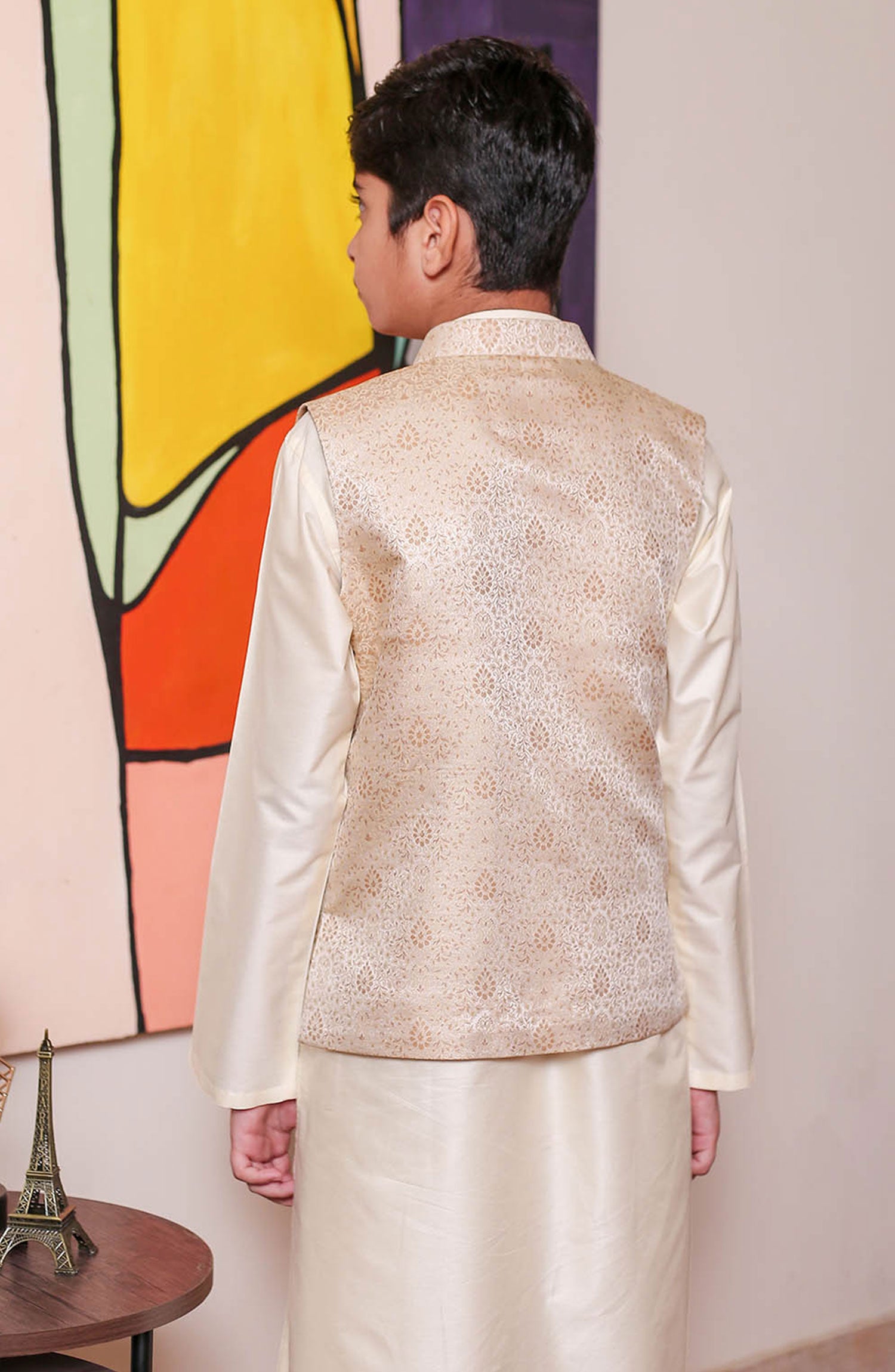 Formal Style Waist Coat for Kids , Jamawar Fabric in Gold Colour and Rich Weaved Design , Special for Festive And Wedding Wear