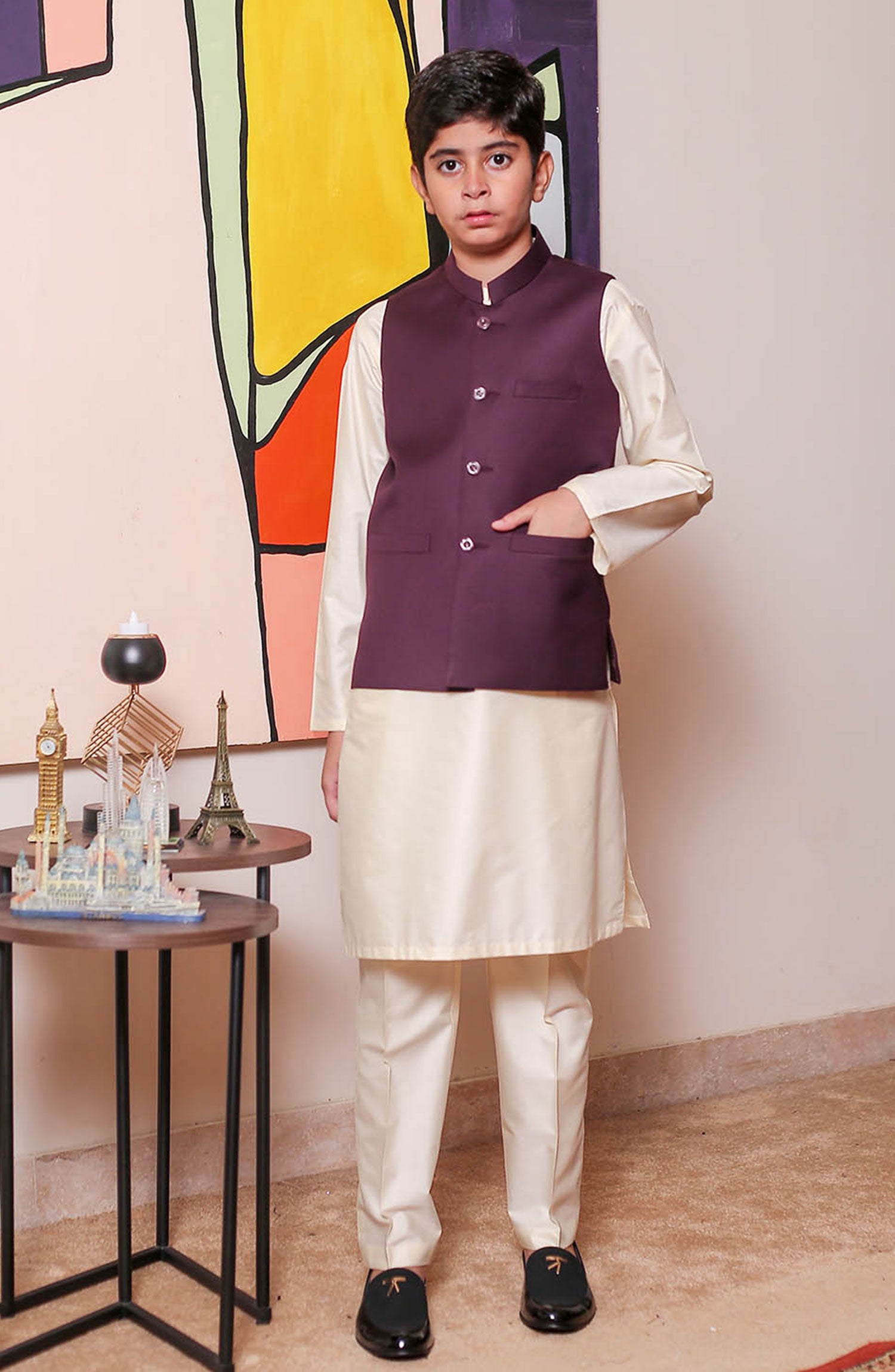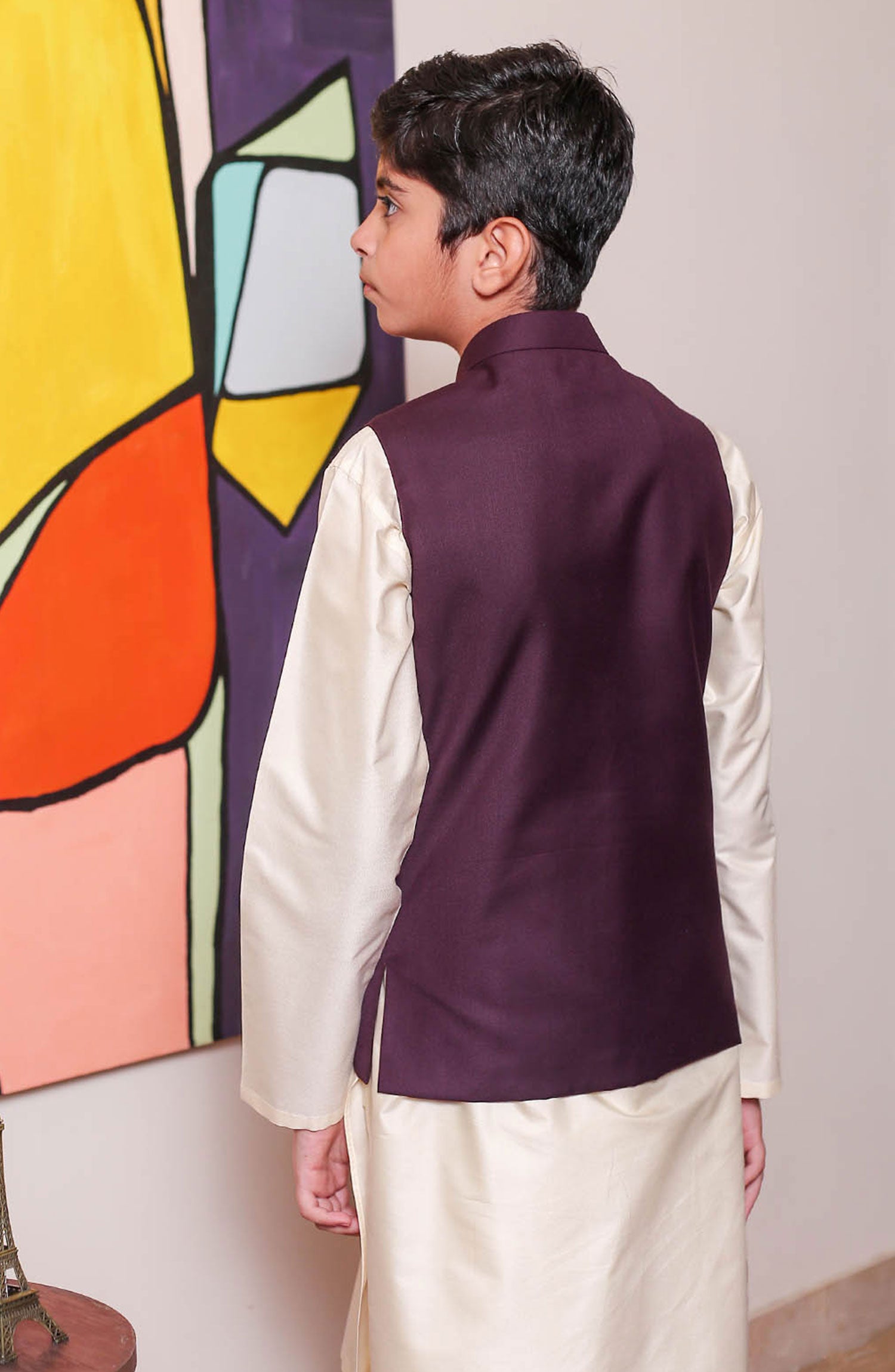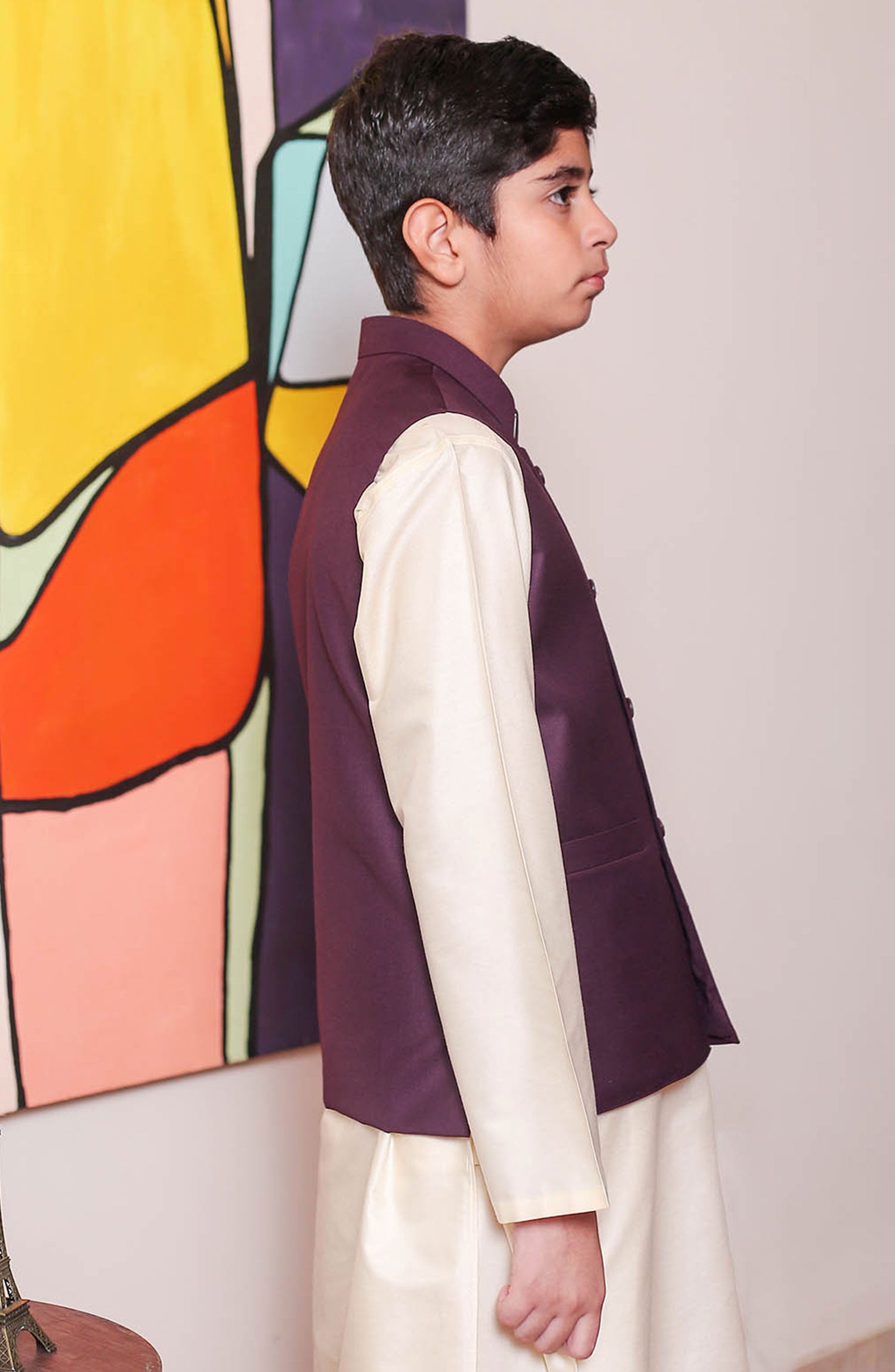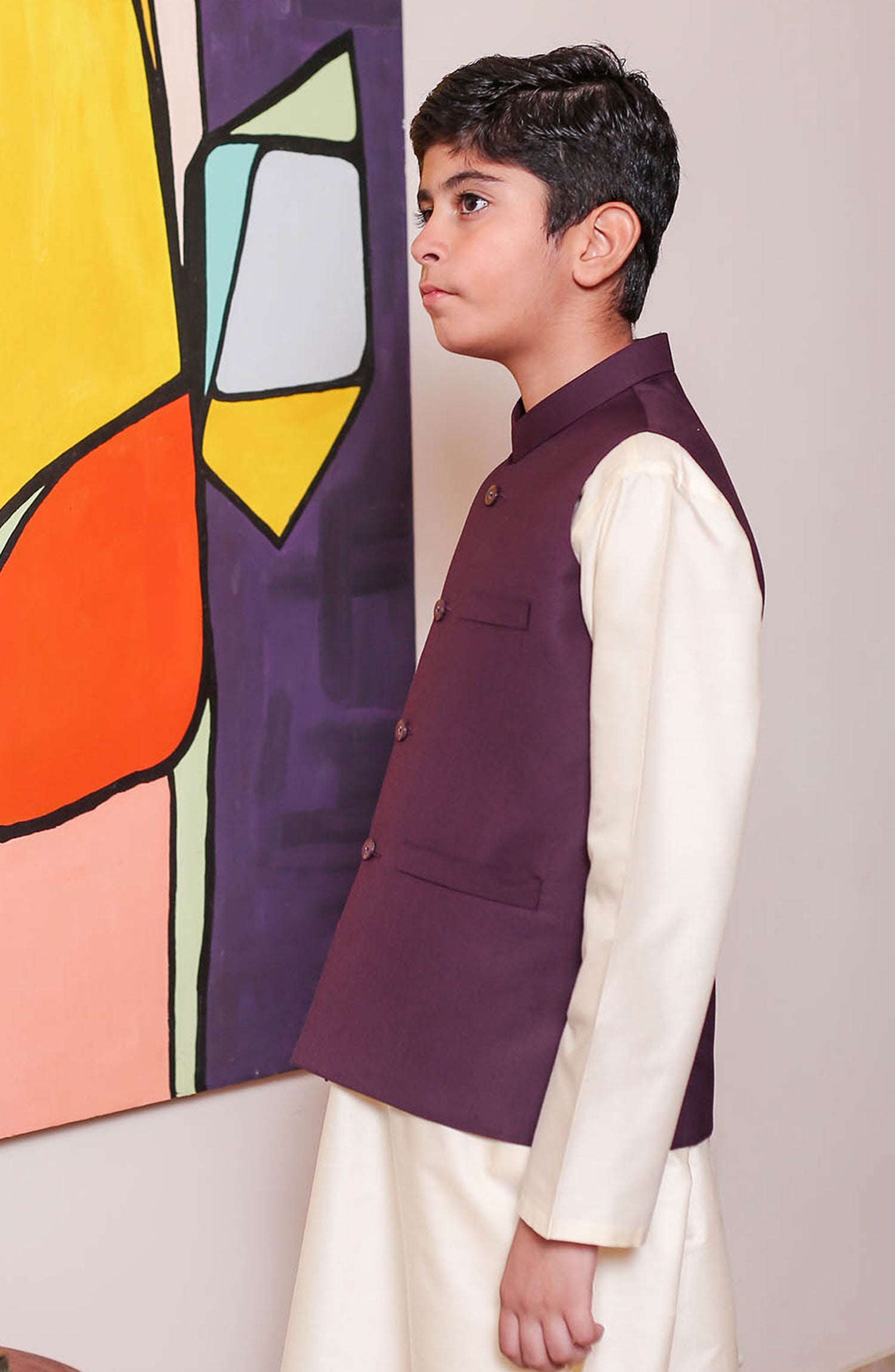 Formal Style Waist Coat for Kids , Suiting Fabric in Magenta Colour with Rich Weaved Design , Special for Festive And Wedding Wear