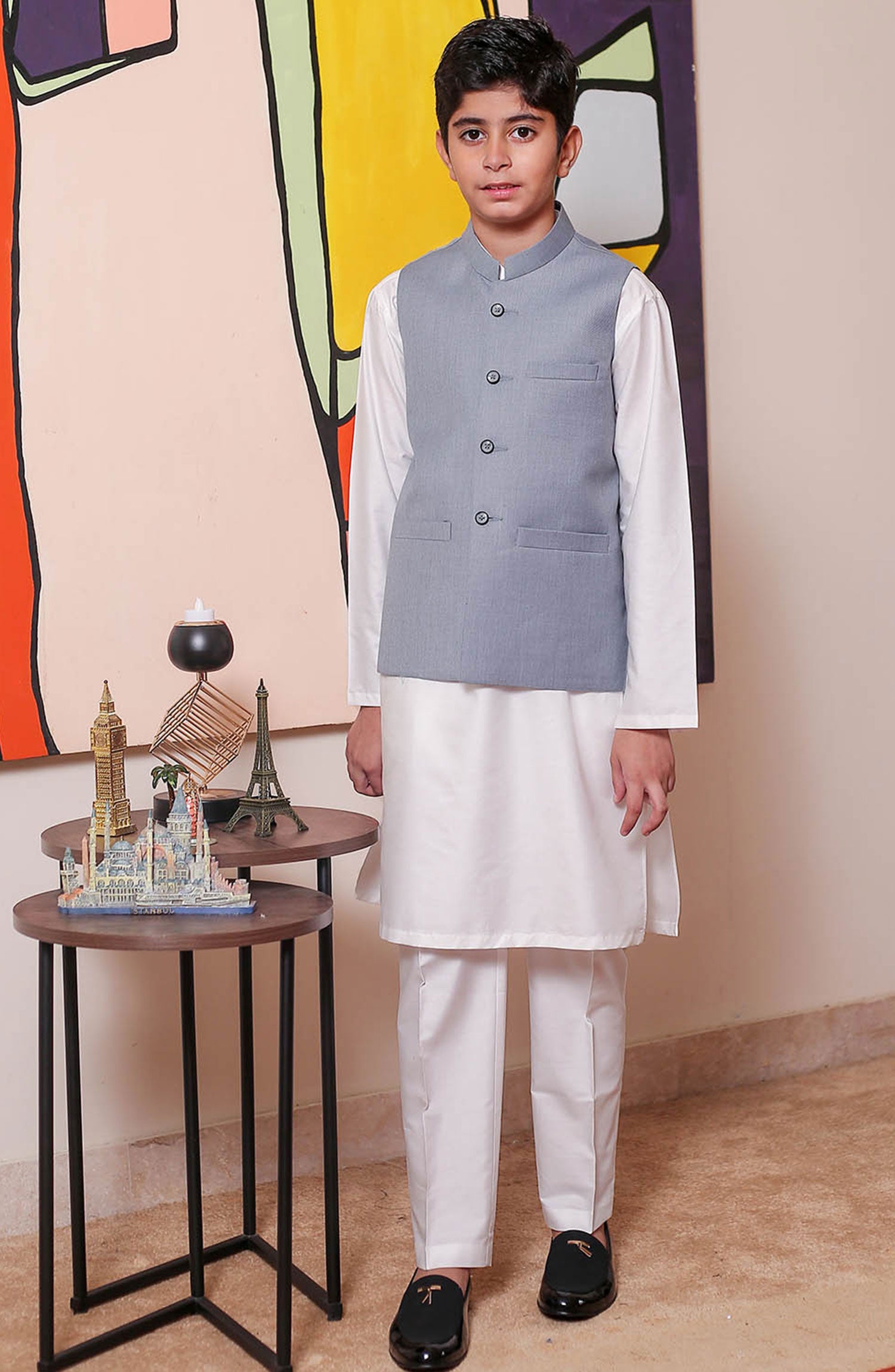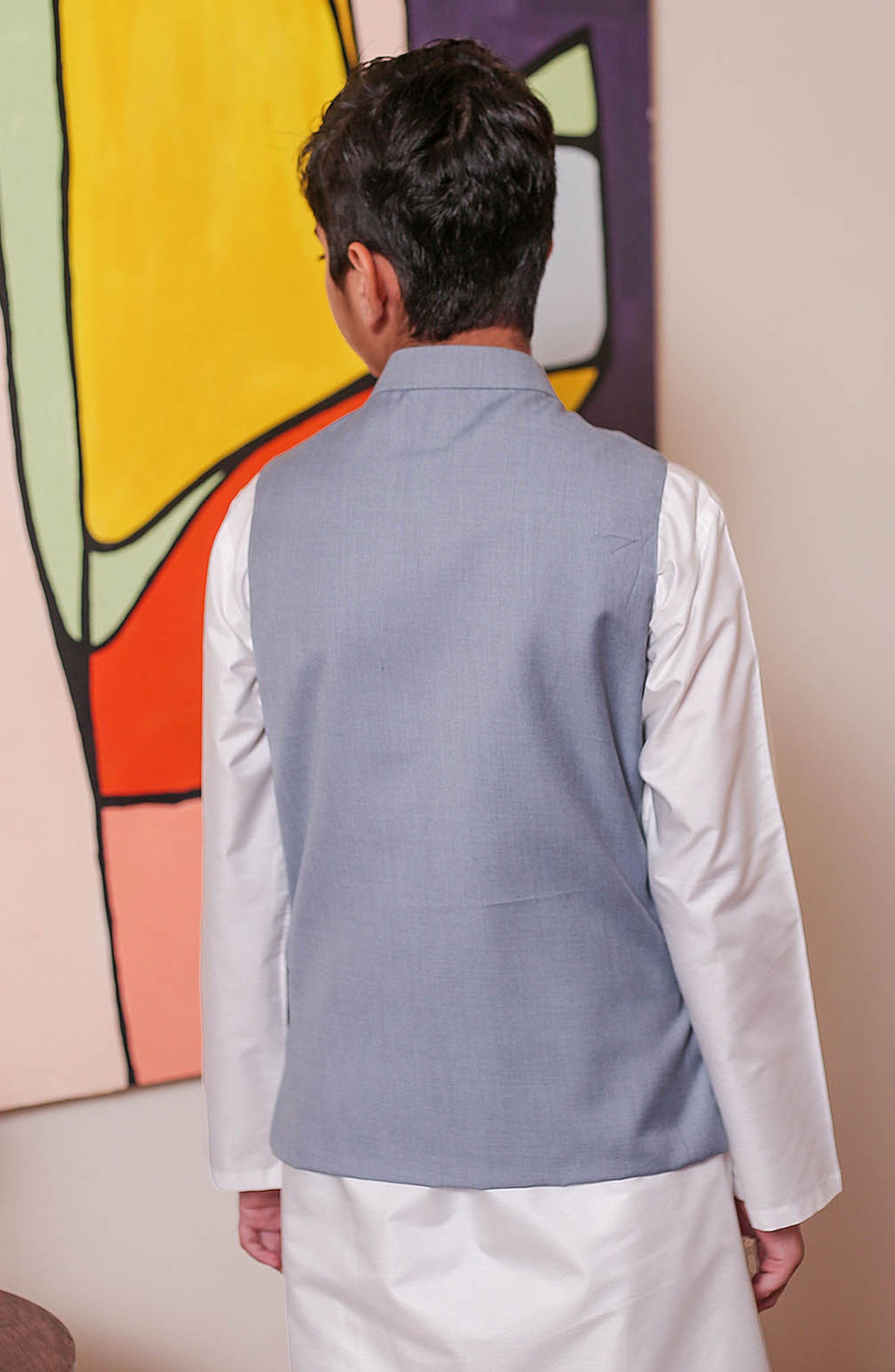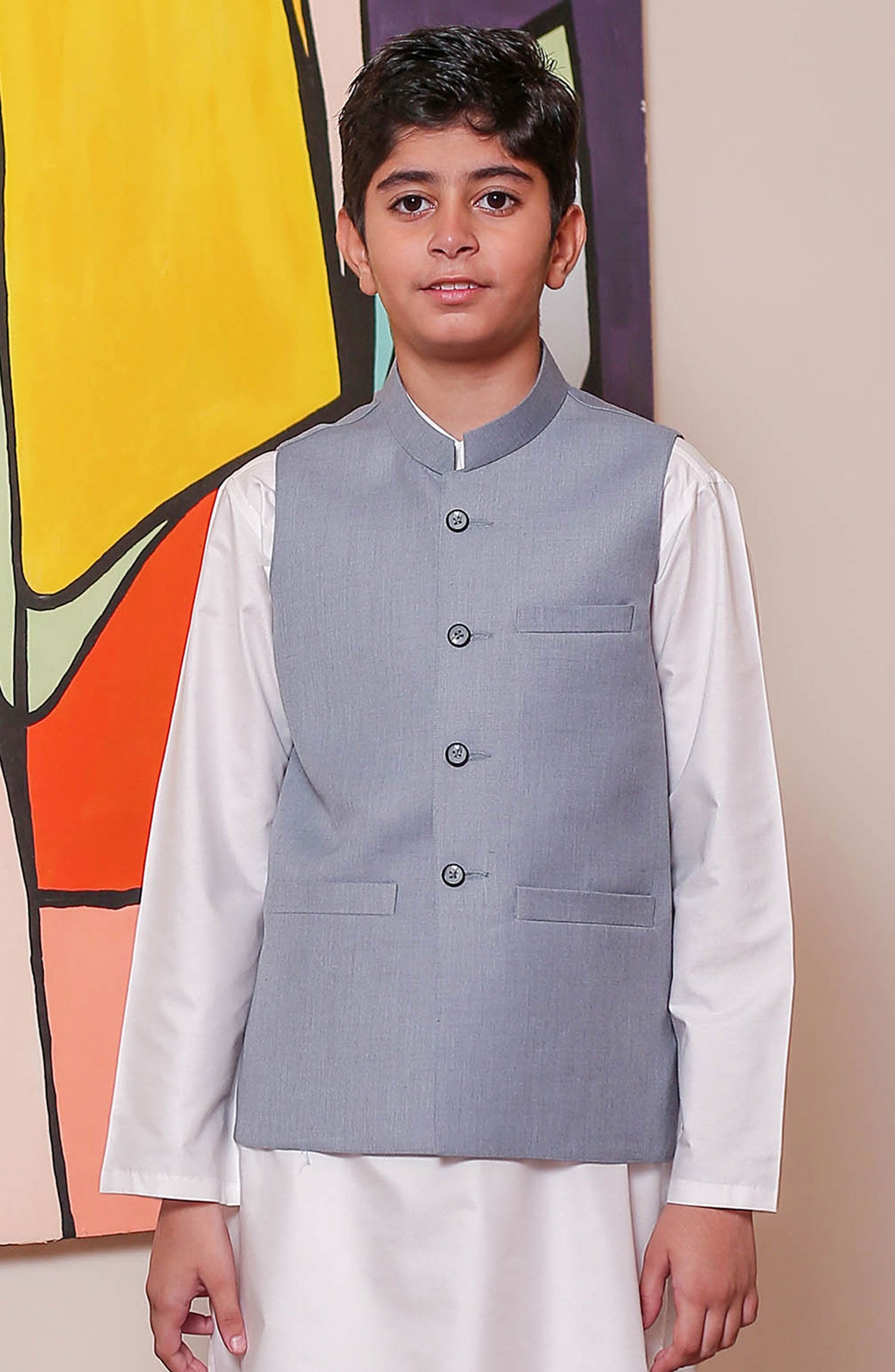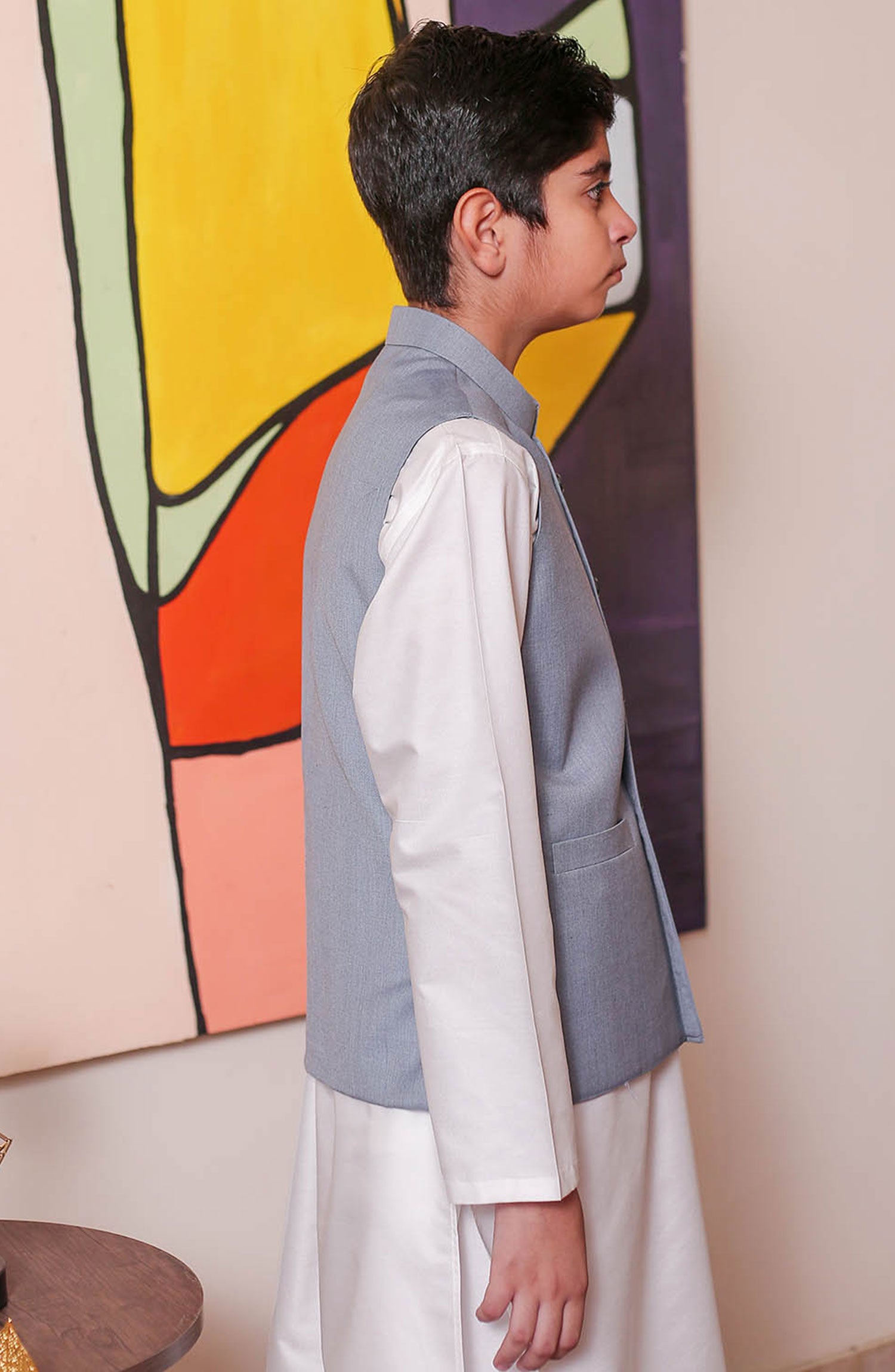 Formal Style Waist Coat for Kids , Suiting Fabric in Ash Grey Colour with Rich Weaved Design , Special for Festive And Wedding Wear
