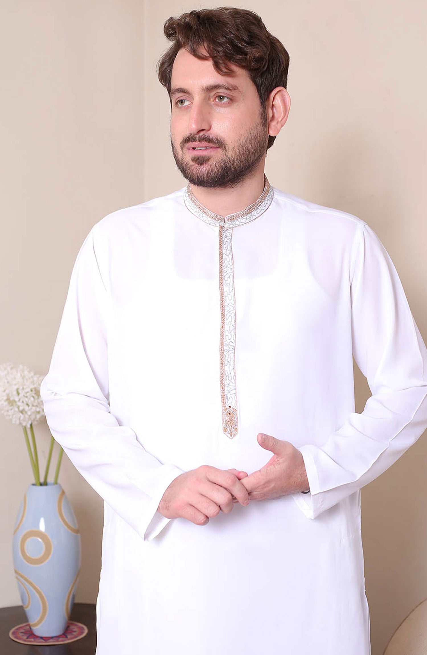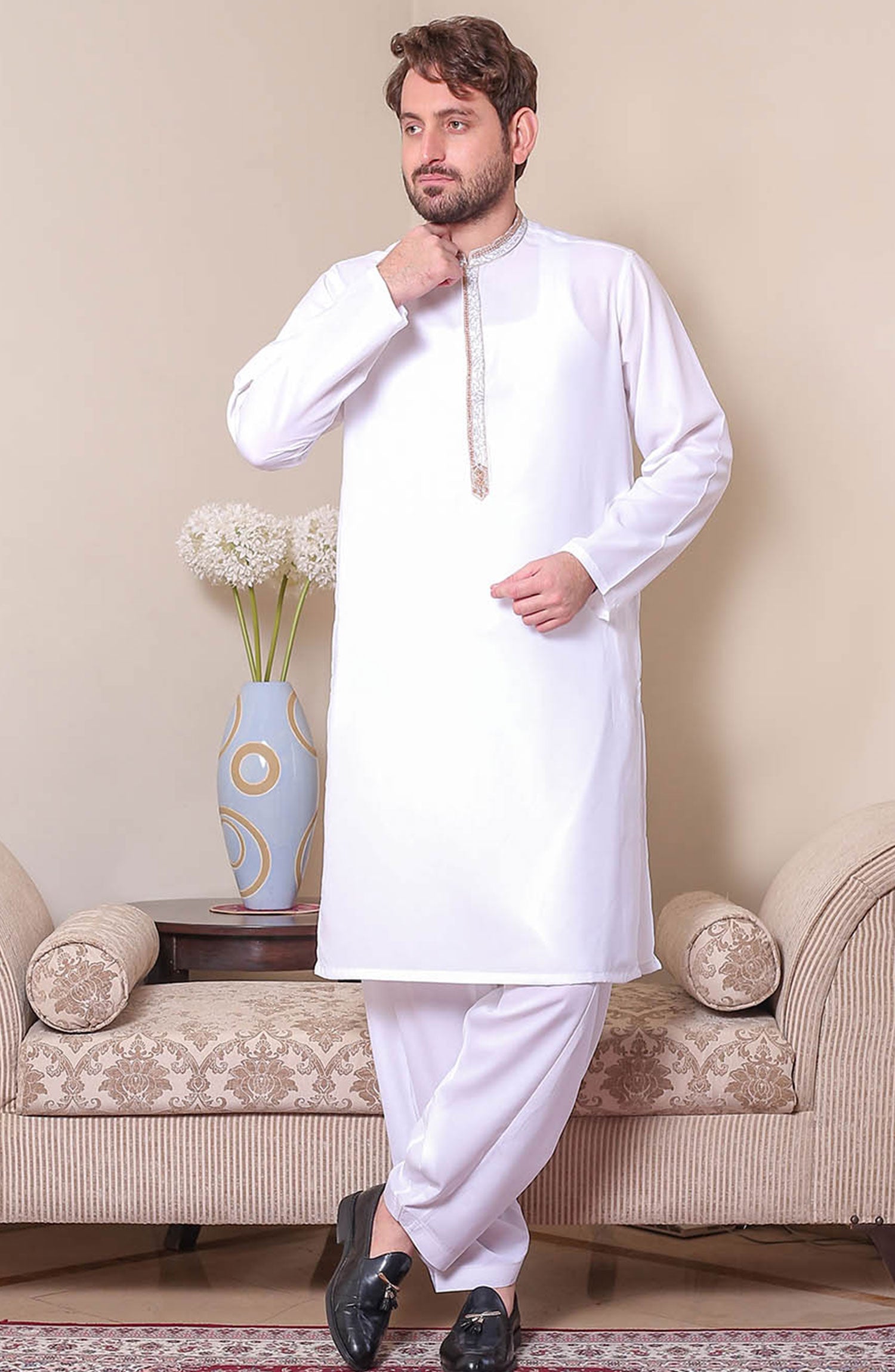 Formal Style Kameez Shalwar Suit for Men , Easy Iron , Formal Silk Base Fabric with Hand Embriodrey on Collar and Front Placket , Special For Festive Use