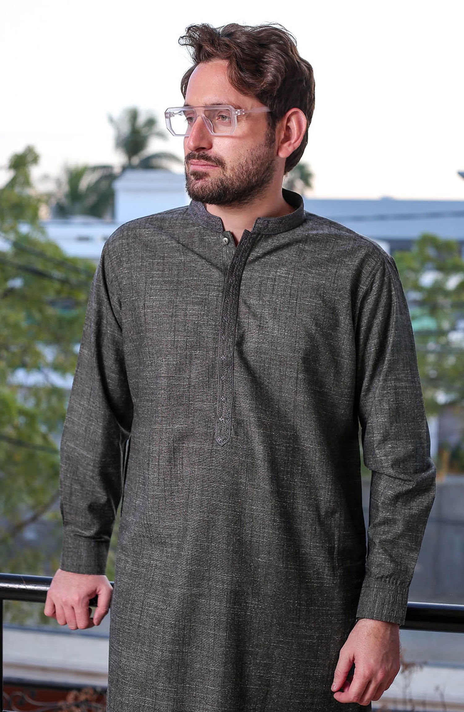 Formal Style Kameez Shalwar Suit for Men , Easy Iron , Formal Wool Fabric with Embriodrey on Collar and Front Placket , Special For Winter and Festive Use
