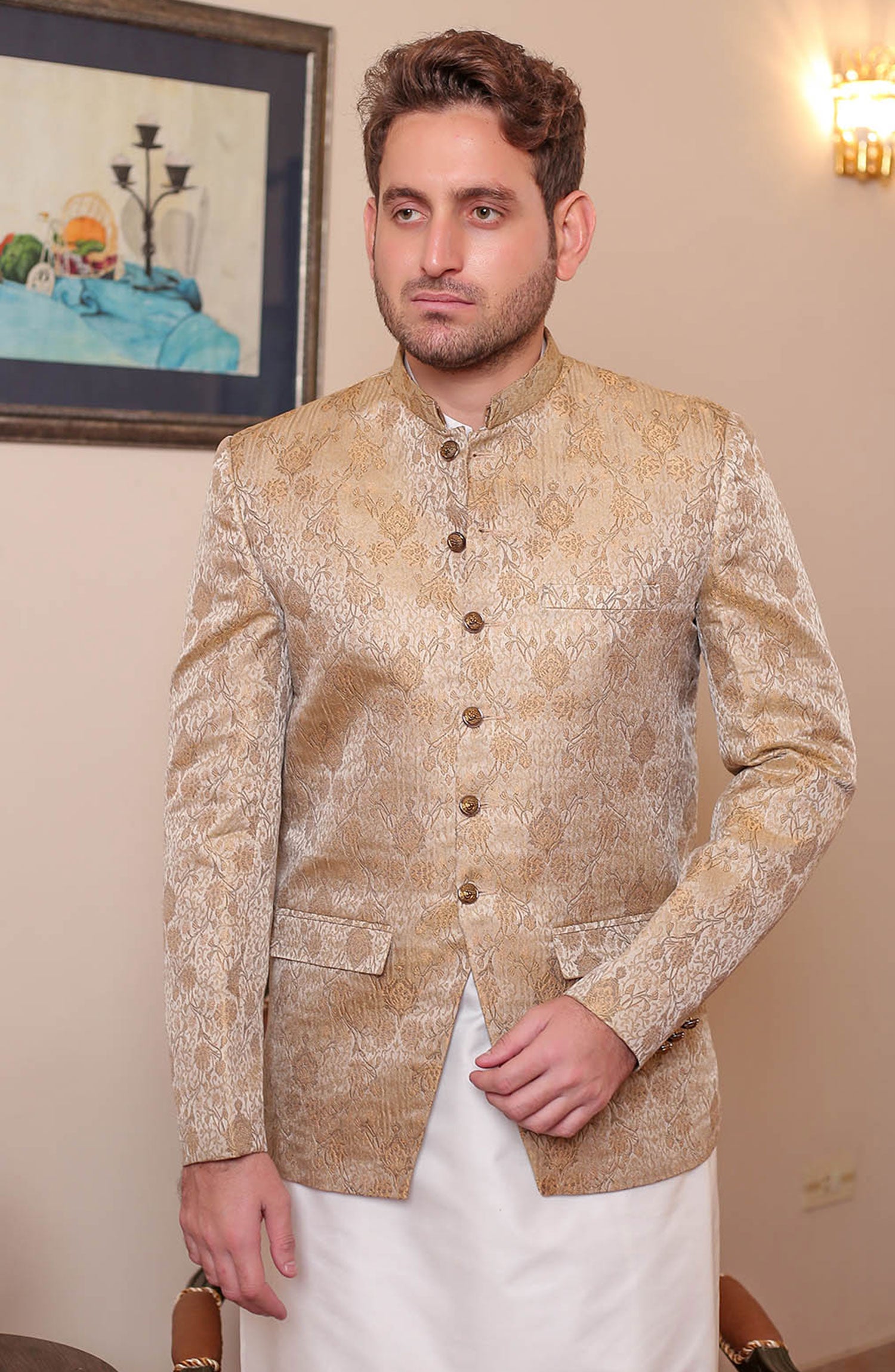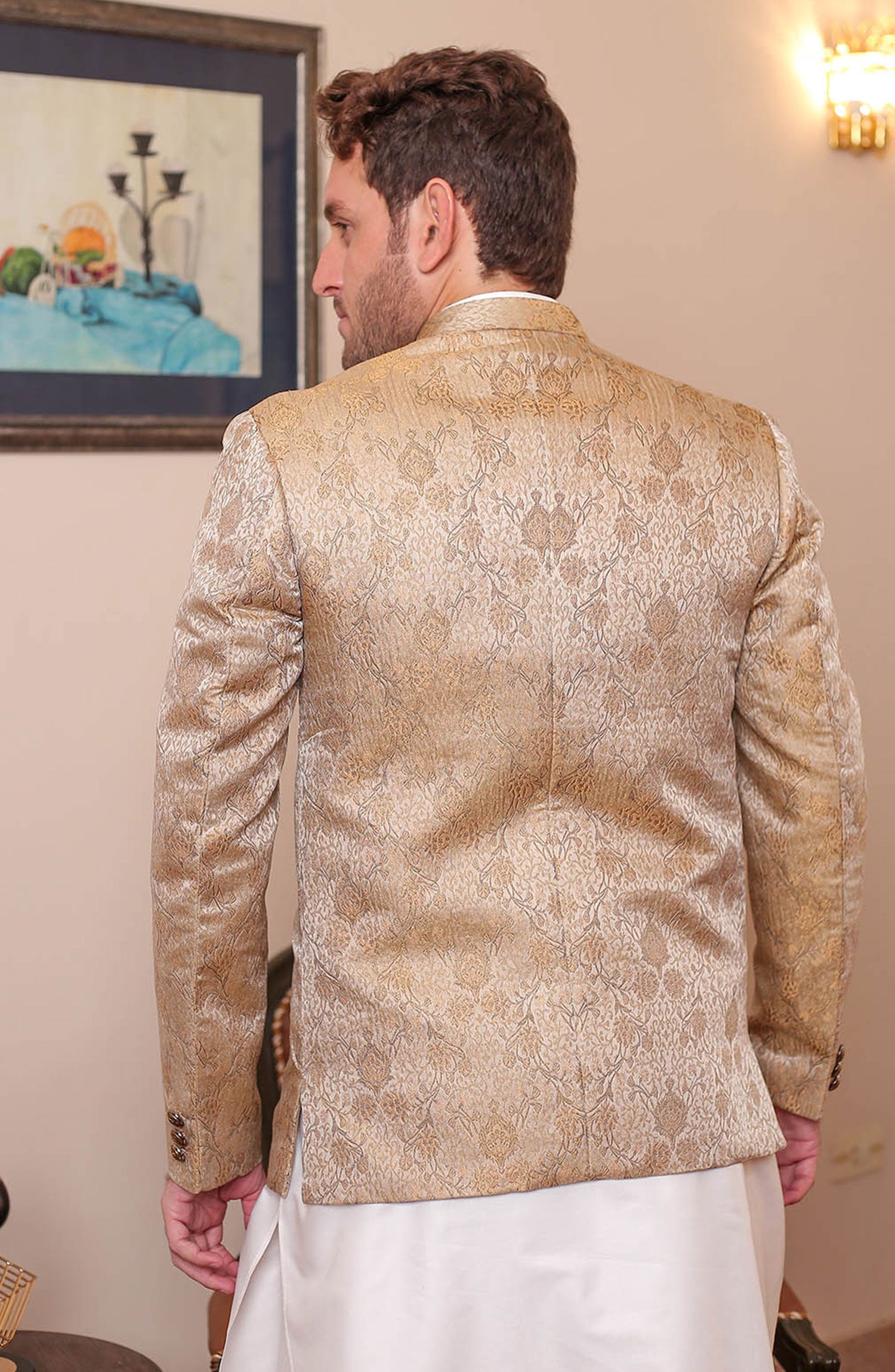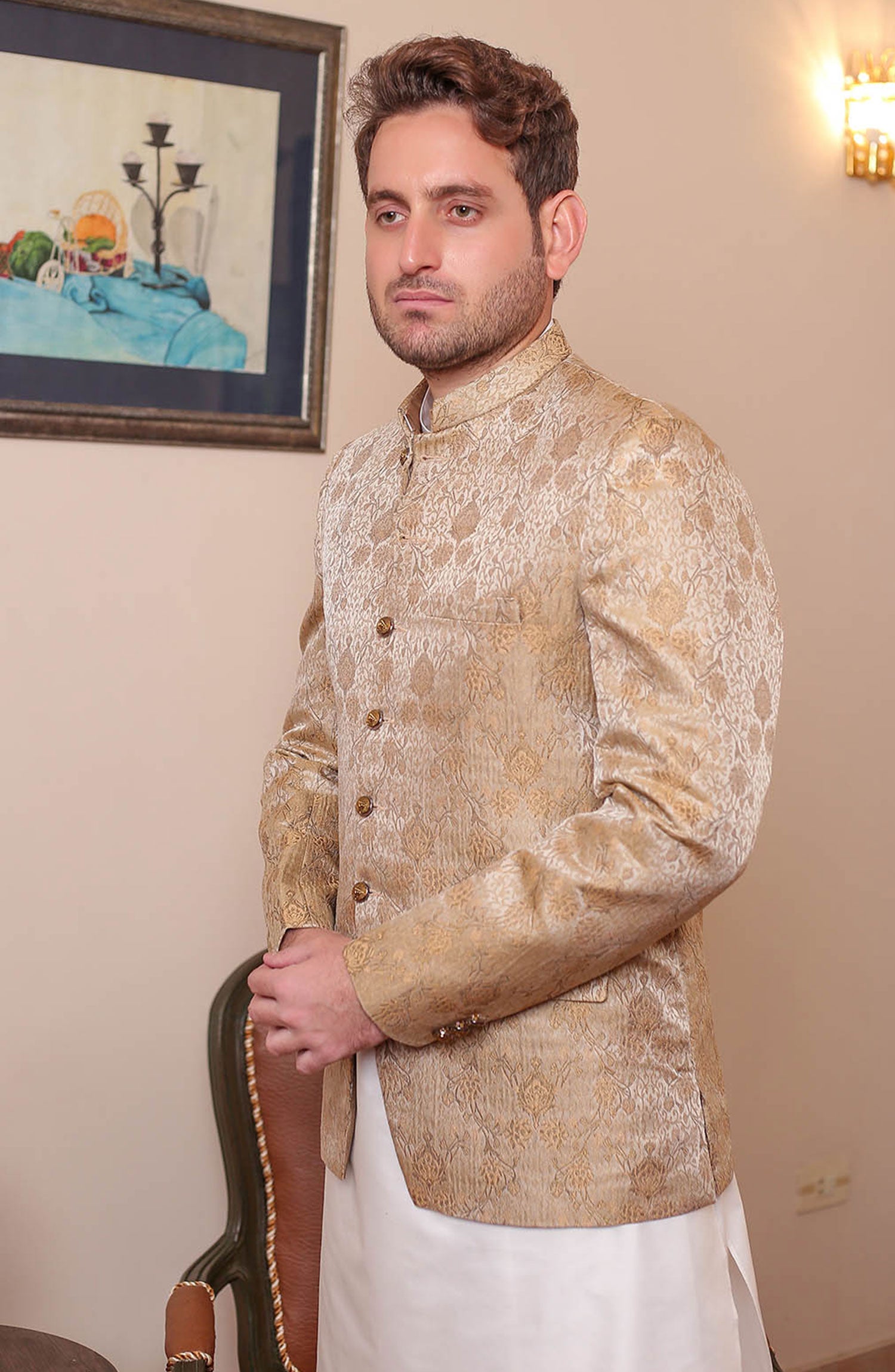 Formal Style Prince Coat for Men , Elegently Designed Jamawar Fabric in Gold Colour with Zari Weaving ,Special For festive and wedding wear