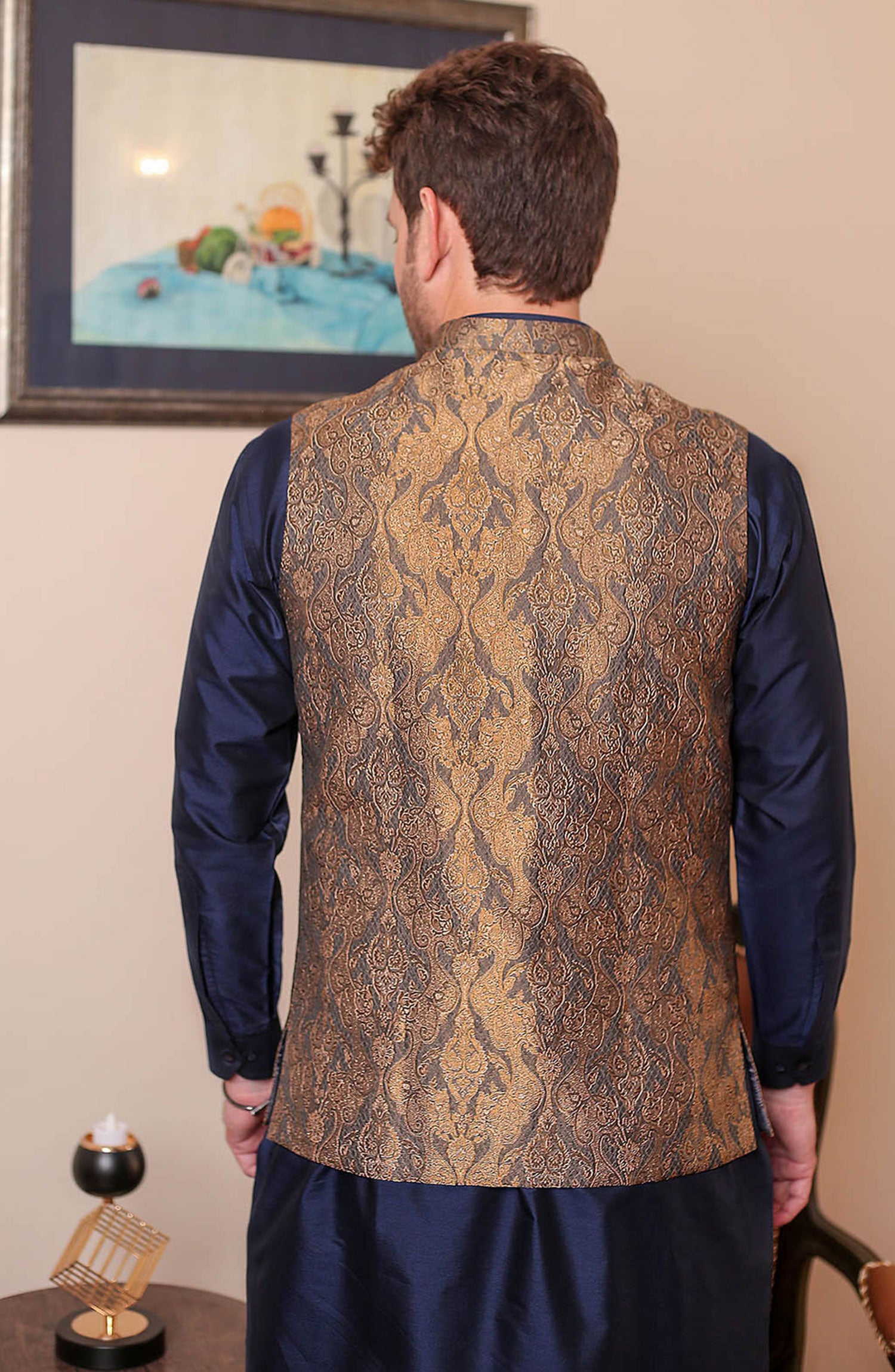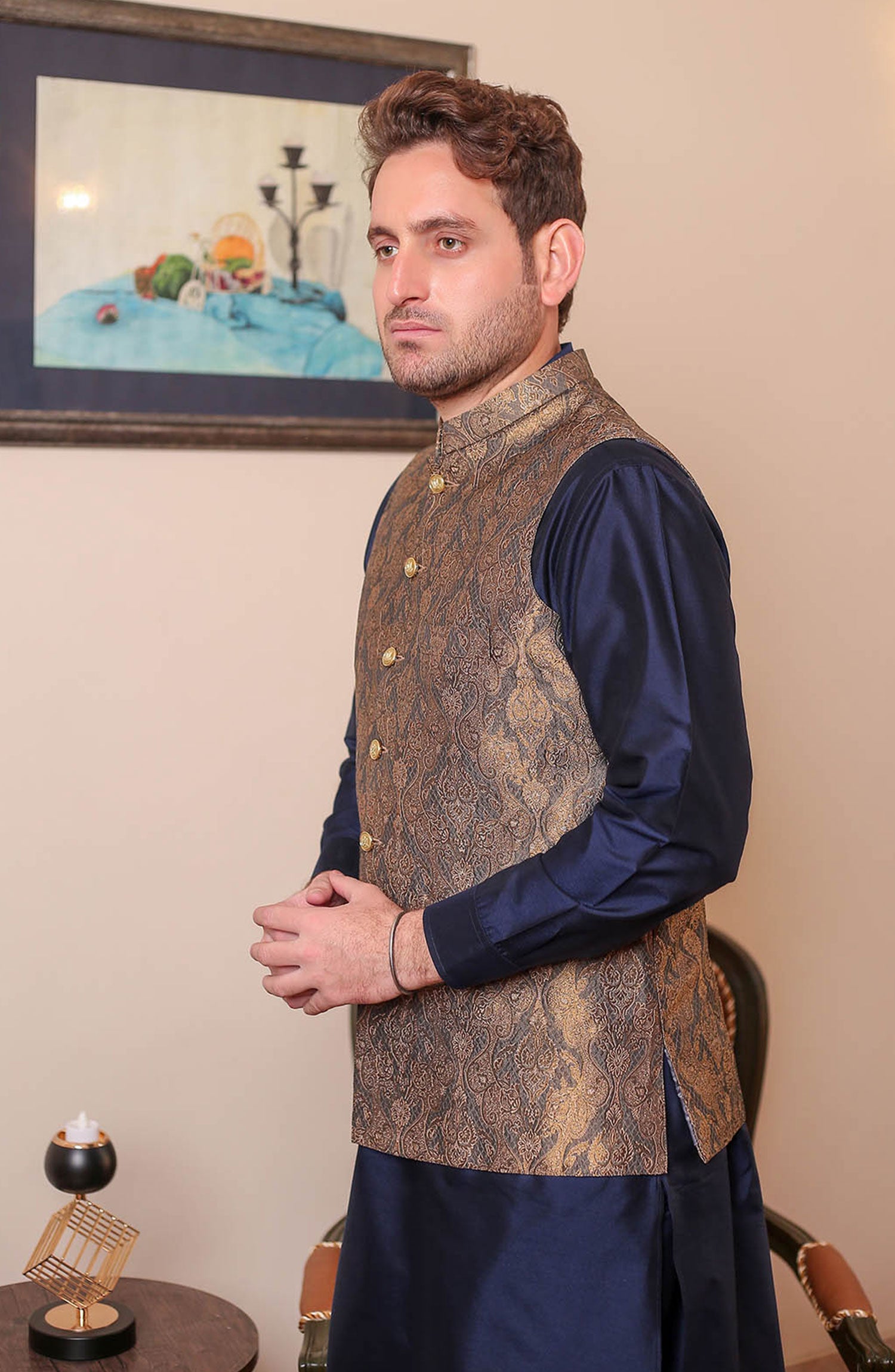 Formal Style Waist Coat for Men , Elegently Designed Jamawar Zari Weaved Fabric With Beautiful Jamawar Design In Grey Brown colour Making it Look Shiny Yet Elegent making it Special For festive and wedding wear